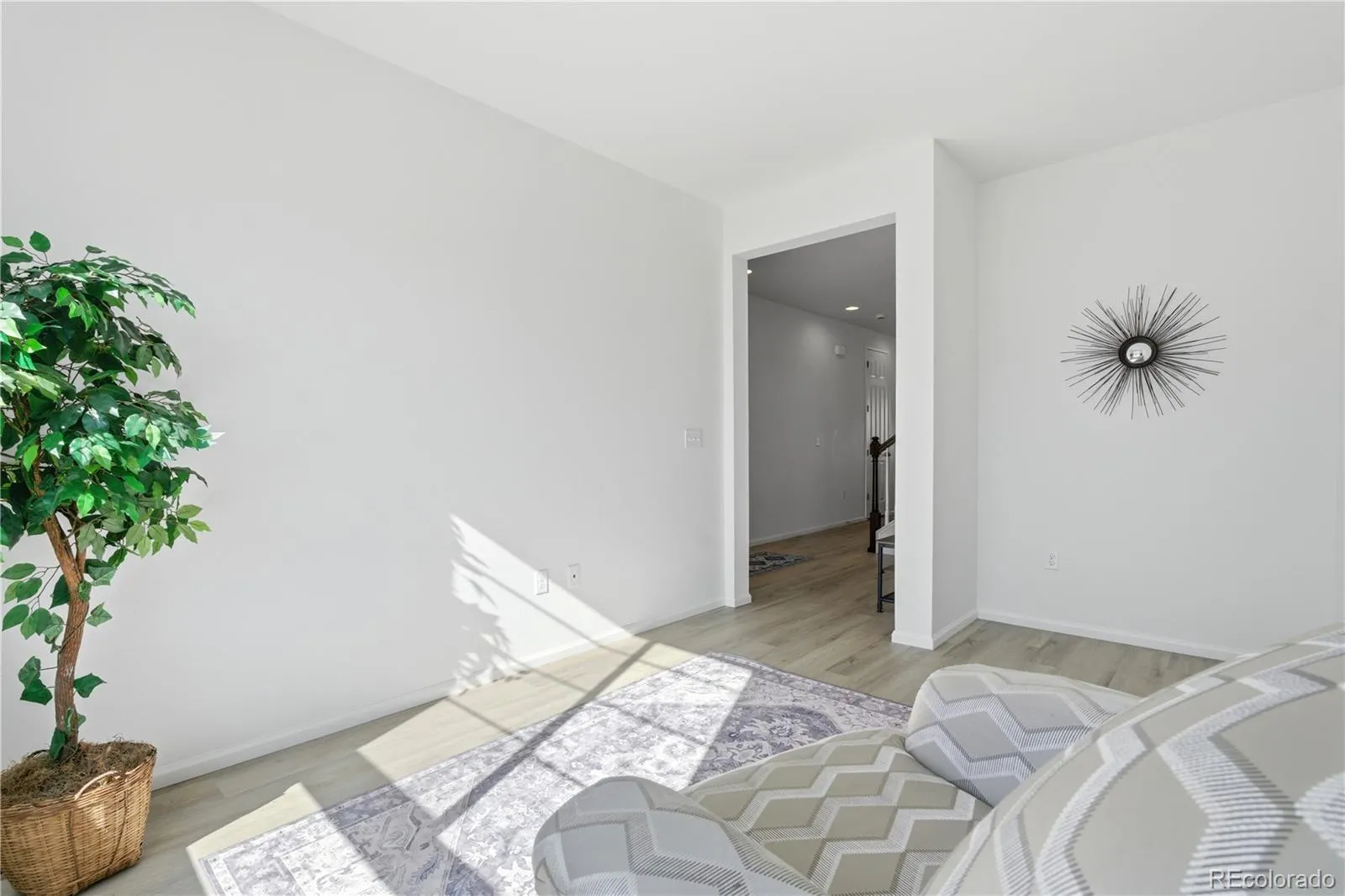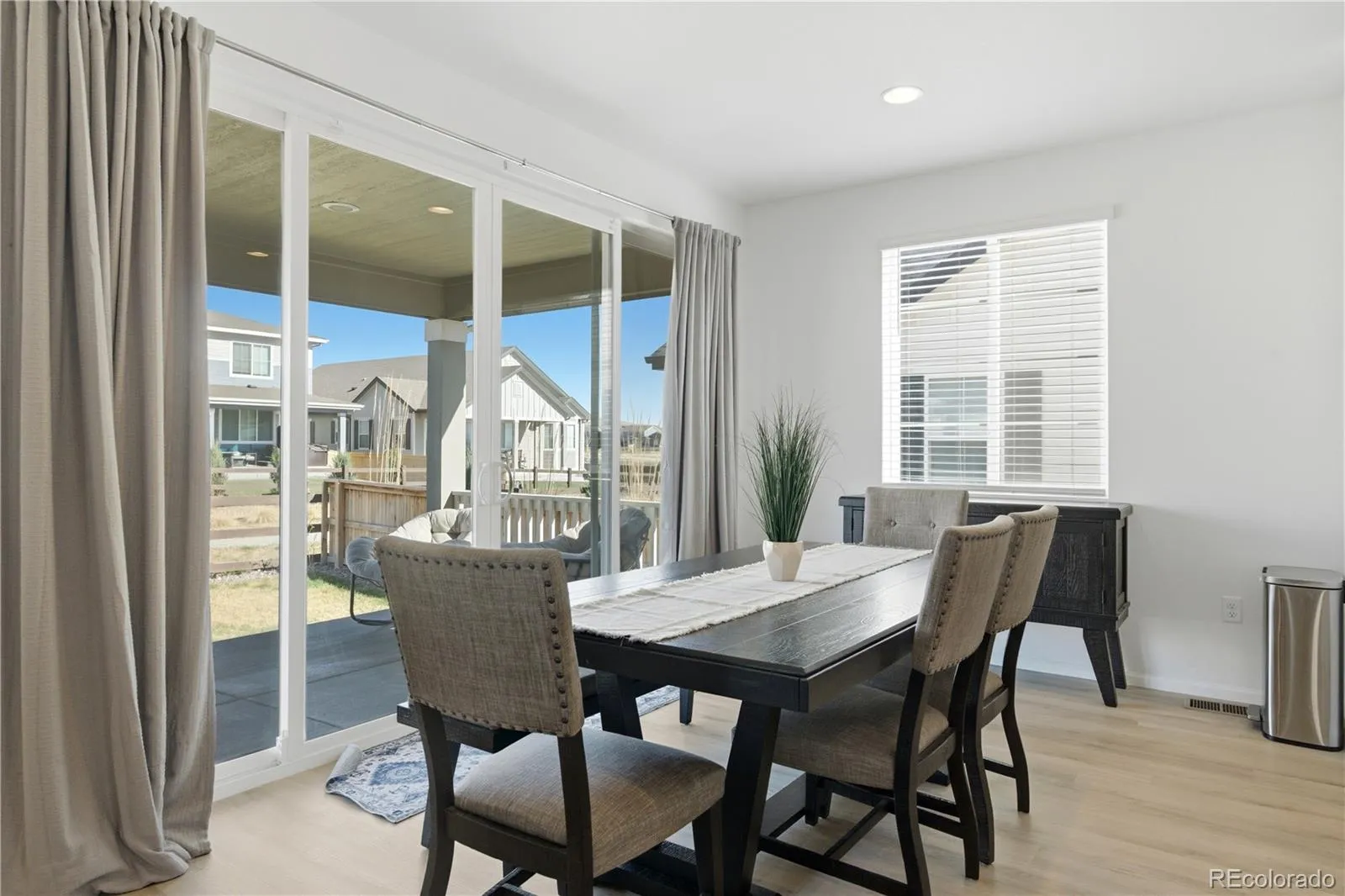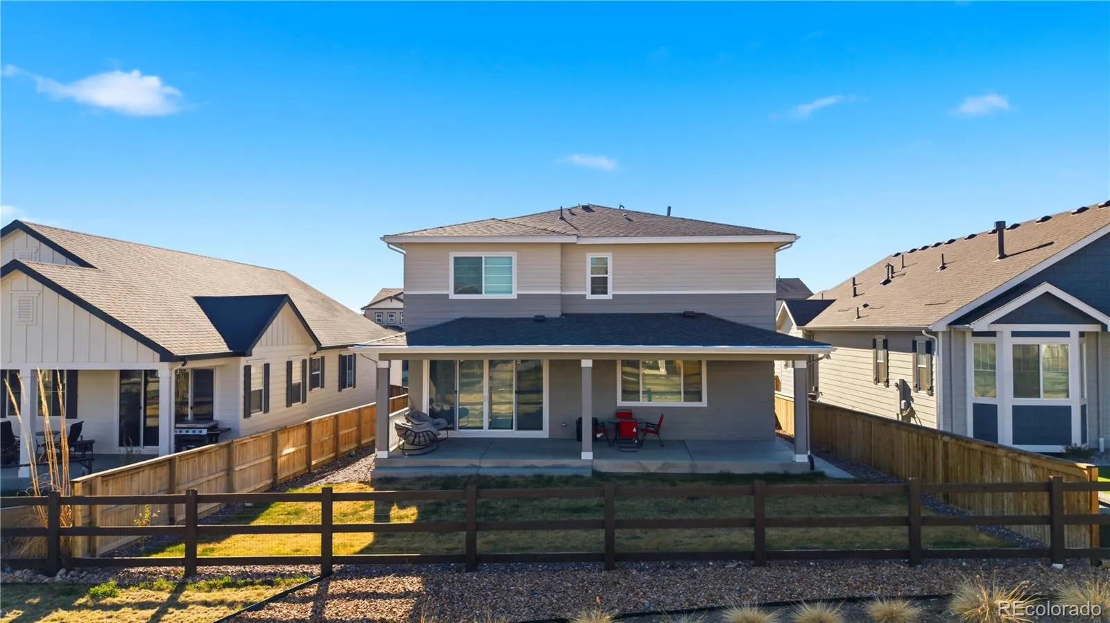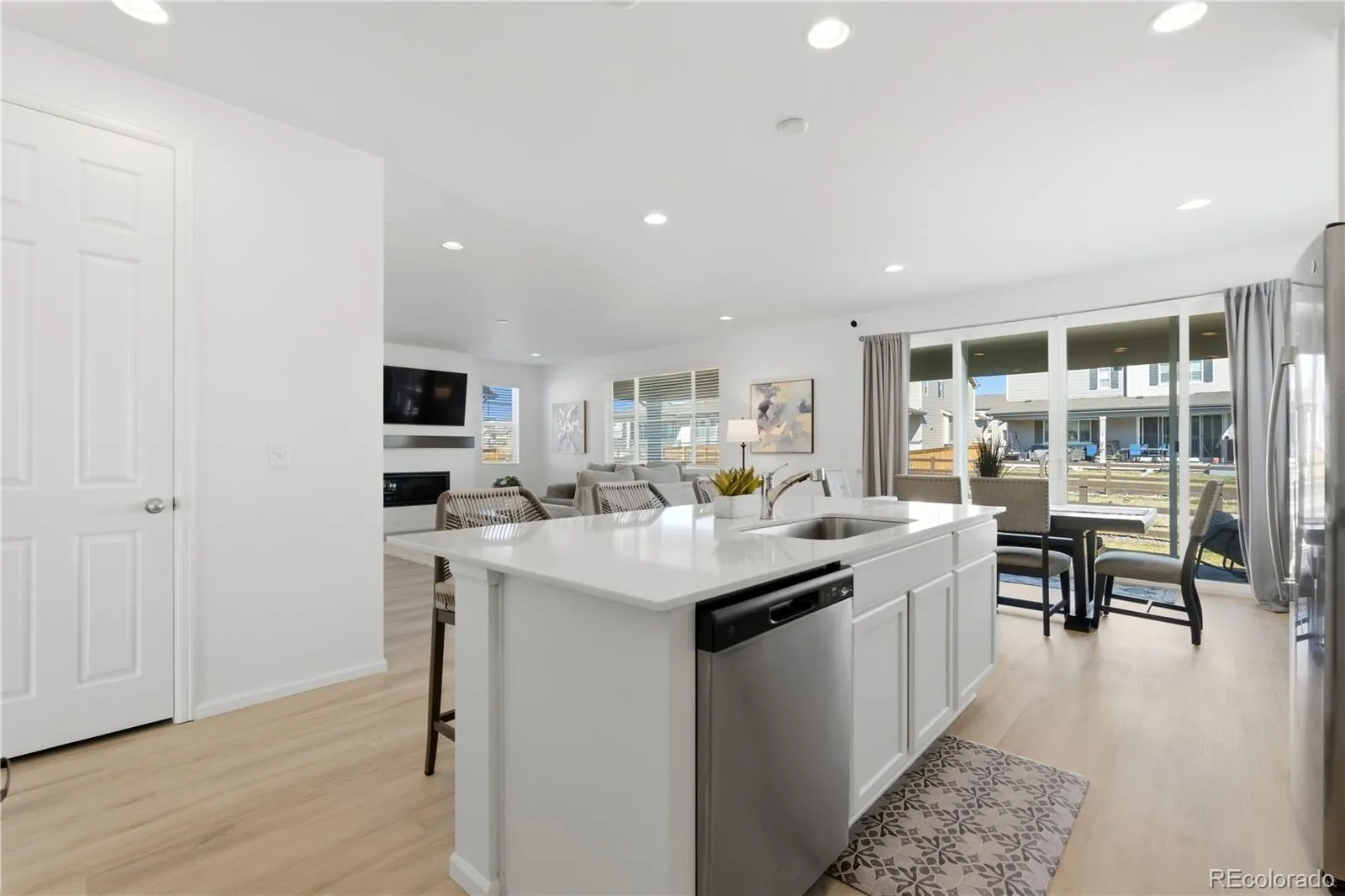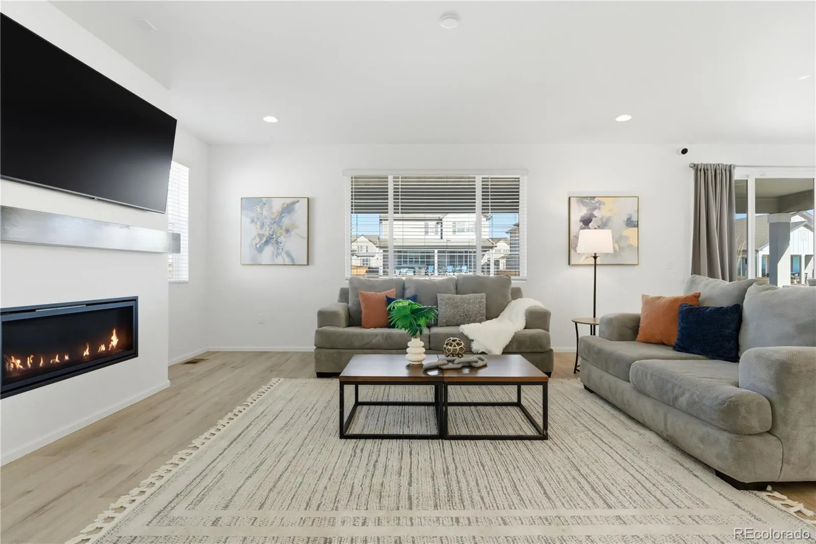 4 bedrooms, loft, and main-floor office—set on a premium lot backing to a walking trail with direct access to parks and the new Capstone Academy. Built in 2024, this home offers a nearly-new feel with completed landscaping, fencing, window coverings, and an oversized covered patio already in place—plus a potential financing advantage with an assumable FHA loan at approximately 4.99% (subject to approval). Inside, the open-concept kitchen, dining, and great room create a functional and inviting layout. The kitchen features quartz countertops, a center island with sink, dishwasher, and breakfast bar seating, stainless steel appliances including a 5-burner gas range, extended cabinetry, and a pantry. The spacious dining area leads to a dramatic double sliding glass door opening to the covered patio with built-in lighting—creating a true indoor-outdoor connection overlooking the open space and trail. The backyard’s position provides access to parks to the north and a larger park under construction to the south near the new tuition-free K–8 charter school. The living room features abundant natural light, tall ceilings, and an oversized gas fireplace. A private office at the front of the home and a powder bath complete the main level. Upstairs, a loft at the top of the stairs provides flexible living space. The primary suite includes a large walk-in shower, quartz double vanity, and an oversized walk-in closet (approx. 13′ x 11′). Three additional bedrooms are well-sized, one with a walk-in closet, plus a full bath with double vanity and a spacious laundry room with washer and dryer included. Additional features include a fully drywalled oversized 2-car garage with mudroom and backyard access, tankless water heater, plus mountain views. Conveniently located near DIA, Buffalo Run Golf Course, shopping, trails, Second Creek Open Space, and the Rocky Mountain Arsenal National Wildlife Refuge, with a new high school under construction less than 5 minutes away.
