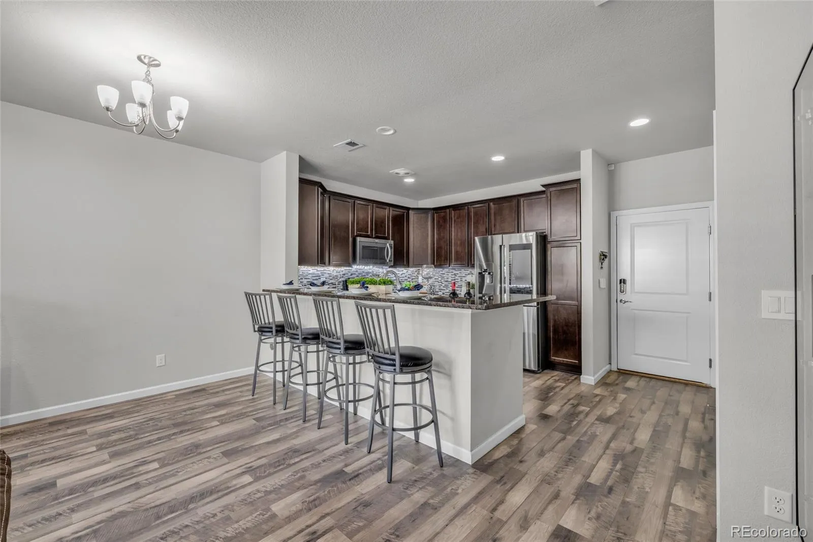 Welcome to refined living in the sought-after Murphy Creek community! This home is nestled in a quiet, neighbor-friendly area and features a large, private front patio, ideal for relaxing and entertaining. Inside, the open-concept design is complemented by stylish modern flooring throughout the main living area. The kitchen is both elegant and functional, featuring stainless steel appliances, granite countertops, a tile backsplash, and a Samsung smart refrigerator. Upstairs, you’ll find newer plush carpet and two oversized primary suites, each with a private full bathroom and walk-in closet. The upgraded baths feature quartz countertops, a double vanity, and a walk-in shower. Enjoy the convenience of upstairs laundry. The attached two-car garage offers easy access, and a park and playground are located directly across. Conveniently located near E-470, dining, and shopping, and within walking distance to Murphy Creek Golf Course. Truly move-in ready with an exceptional setting, don’t miss this opportunity!