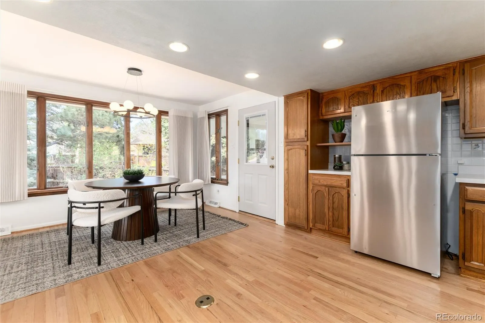 The main level showcases gleaming hardwood floors that flow seamlessly from the living room into a stunning dining space surrounded by windows and accented by a modern light fixture—an ideal setting for everyday living and entertaining. The spacious kitchen blends classic character and functionality with charming wood cabinetry, brand new stainless steel appliances, and updated canned lighting. Just beyond, an enclosed back patio extends your living space and provides the perfect spot for dining and relaxing nearly year-round.