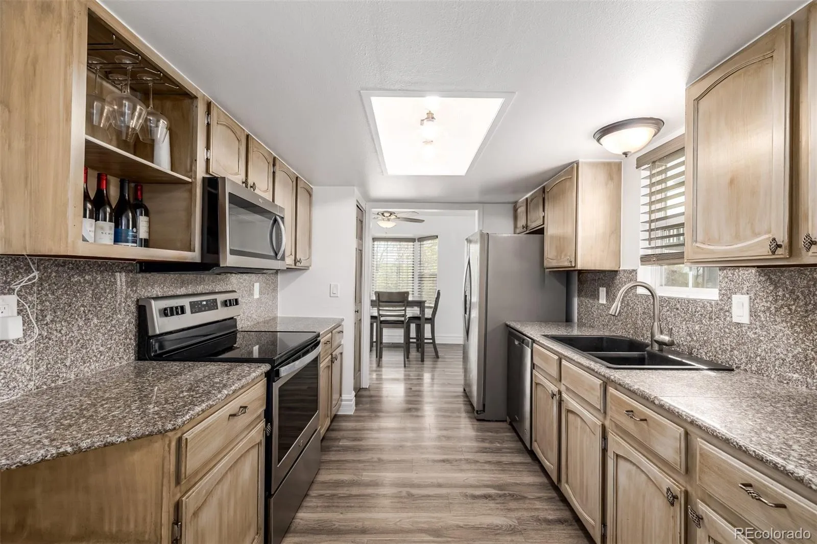 The kitchen includes stainless steel appliances. Upstairs, the spacious primary suite offers vaulted ceilings, a skylight, and an updated en-suite bathroom with a walk-in shower. Two additional bedrooms and a full bathroom provide flexible space for family, guests, or a home office.