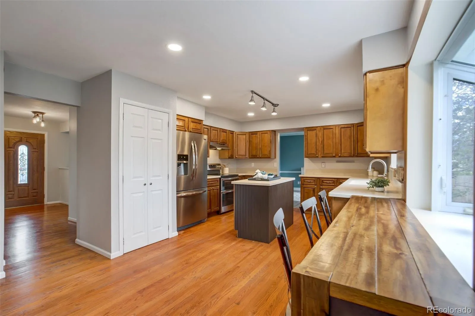 Rare opportunity in a highly sought-after D20 neighborhood! This spacious two-story home offers 5 bedrooms, 4 bathrooms, and sits on an expansive 1/3-acre lot with a private, tree-filled backyard—complete with a charming treehouse. The main level welcomes you with formal living and dining spaces, leading into a beautifully updated kitchen featuring Corian countertops, stainless steel appliances, an island, a pantry, and a bar-height seating area overlooking the backyard. The adjoining dining area offers a cozy brick fireplace and walk-out access to an oversized patio—perfect for entertaining. A versatile bonus room provides flexible space for a home office, playroom, or additional living area. A convenient laundry/mudroom and half bath complete the main level. Upstairs, you’ll find four bedrooms and 2 bathrooms, including a primary suite with a walk-in closet and updated en-suite ¾ bath.The finished basement expands your living options with a separate private entrance, a large bedroom, a kitchenette, a living room, generous storage, and excellent potential for multigenerational living or guest accommodations. Additional highlights include a new roof (2025), brand-new carpet, updated bathrooms, modern fixtures, radon mitigation system, RV parking, and an oversized two-car garage. Ideally located just minutes from I-25, shopping, dining, and top-rated District 20 schools—this home truly has it all!
