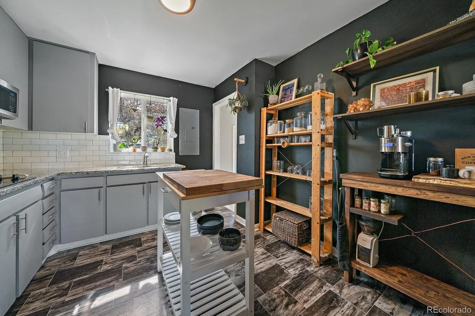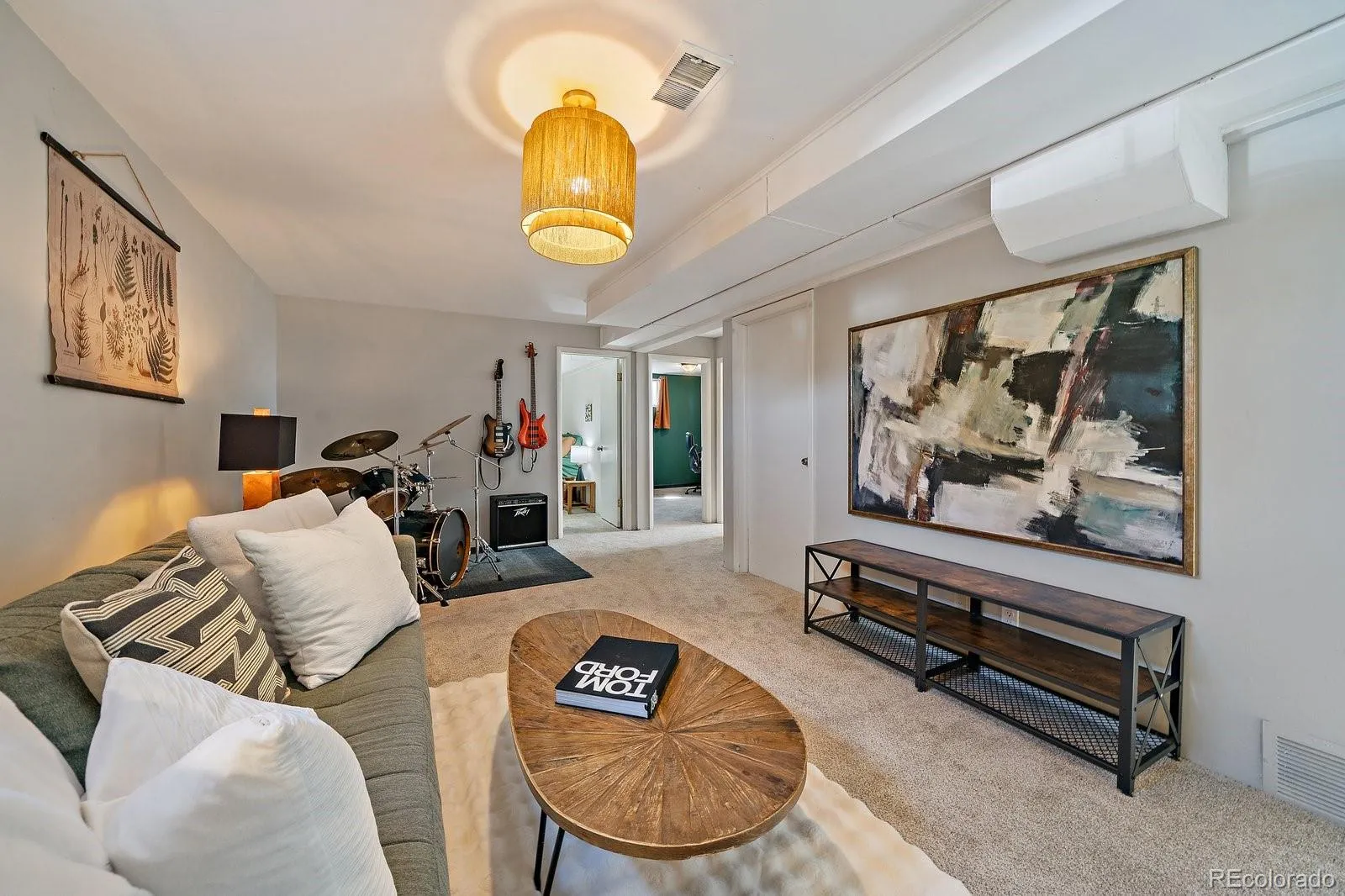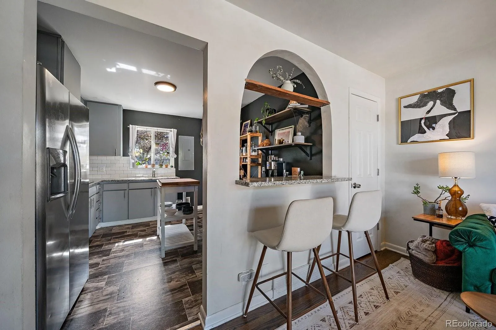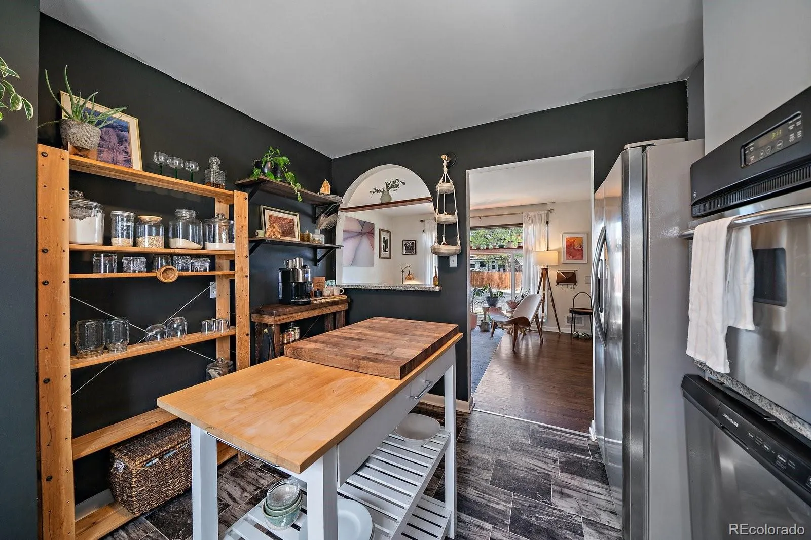 Situated on a quiet street, this lot stands out for its size and private greenbelt setting, offering usable outdoor space for gardens, entertaining, and everyday living. Pride of ownership shows throughout with thoughtful updates and custom design moments including lime wash paint, a newly added architectural curved opening over the kitchen counter, and an oversized full-length front window that fills the main level with light. Real hardwood floors add warmth, quality, and character. The kitchen feels open and intentional with a decorative arched pass-through, stainless steel appliances, granite countertops, tile backsplash, and rich wall color for contrast. Added wood shelving increases both charm and functionality. The main floor features a primary bedroom and a second versatile room that doubles as a study or guest space, lined with built-in bookcases. The refreshed bathroom includes updated fixtures, a sleek vanity, mirror, and a brass double light feature for a modern finish. The spacious basement offers new paint, brand-new carpet, a large family or flex room, ample storage, and a full laundry area. The second bathroom features a new shower with detailed tilework, updated fixtures, and a polished design. The backyard feels like a private retreat with mature trees, a covered pergola-style patio, and garden beds in a gated enclosure. Seasonal plantings bring color throughout the year, and the hot tub adds an inviting spot to unwind morning or night. The rare one-car attached garage offers overhead storage, ceiling racks, a workbench, and organized space for tools, gear, or hobbies—plus a secondary refrigerator/freezer. Close to local favorites including The Glenn, Wyco Park, and Carpenter Park, this location offers an ideal mix of neighborhood charm, outdoor access, and everyday convenience—with the light rail station within blocks for a seamless commute. See NorthglennHM.com for more details.