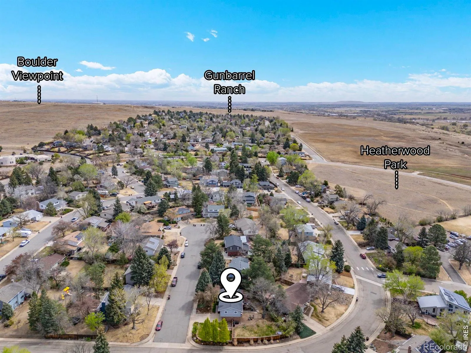 Set on a desirable corner cul-de-sac lot in Heatherwood, this inviting 4-bedroom, 3-bath home offers a thoughtful blend of updates, space, and an incredible Boulder location just moments from open space and trails.The main level feels light and connected, with hardwood floors, updated windows, and custom HALO recessed lighting creating a bright, modern atmosphere. The kitchen has been tastefully updated with quartz countertops, stainless steel appliances, and professionally painted cabinetry that adds a clean, refreshed finish.Upstairs, the primary suite provides a comfortable retreat with a spa-like bathroom featuring heated tile floors and a walk-in steam shower. Two additional bedrooms and a full bath complete the upper level.The lower level offers versatile living space, featuring a spacious recreation room with a custom stone gas fireplace and smart lighting-perfect for cozy evenings. Tucked behind a custom bookshelf, a hidden media room with reclining theater seating creates a fun, private retreat and could easily convert back to a bedroom.Outside, the nearly 1/4-acre lot showcases exceptional landscaping, including pear and apple trees, roses, poppies, and a variety of seasonal blooms. Custom raised garden beds with a smart irrigation system wrap the yard. The deck just off the kitchen, with grapevines over the pergola, offers a natural extension of indoor living-ideal for relaxing or entertaining while enjoying mountain views. A gas line is already installed at the fire pit area.Enjoy access to the Gunbarrel Ranch trail system, with easy connections to Teller Farm and the LOBO trail. Walking distance to Heatherwood Elementary with convenient access to Hwy 36 and I-25.Additional improvements include a hail-resistant roof (2019) and upgraded attic insulation with air sealing (2016). This home represents an exceptional value in an amazing Boulder neighborhood. LOVE WHERE YOU LIVE!!! NO SHOWINGS UNTIL OPEN HOUSE SATURDAY APRIL 11TH AT NOON