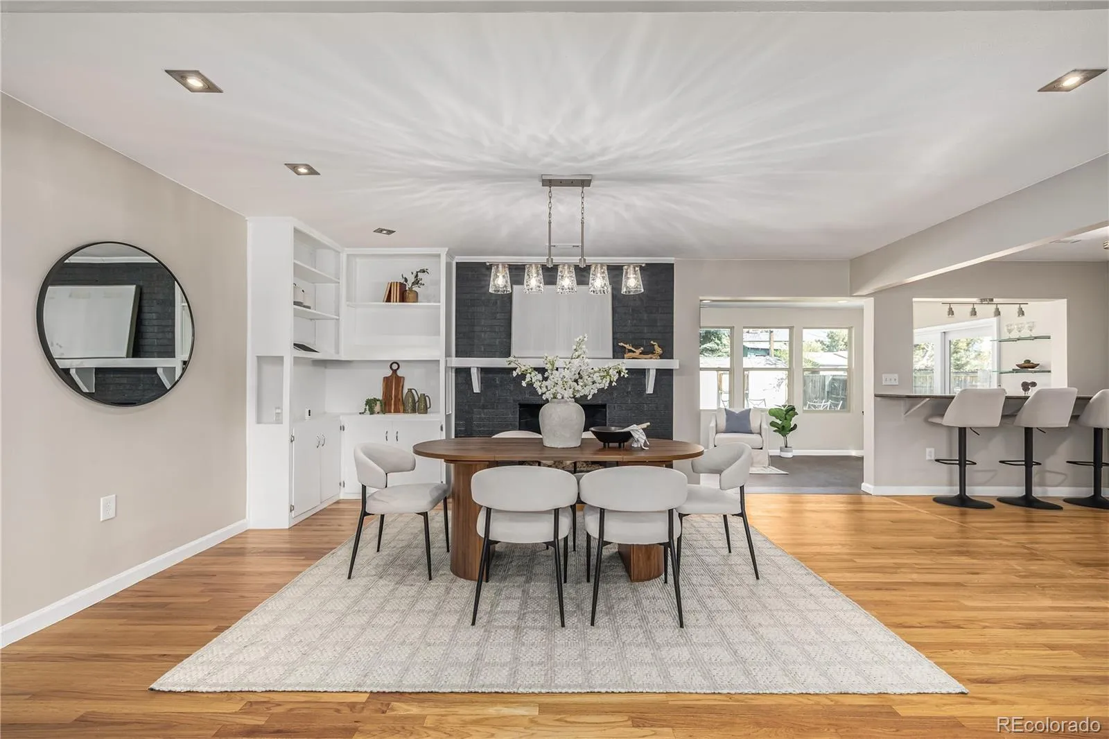 Step inside to a light-filled main level where expansive windows and warm, curated finishes create an inviting and effortlessly connected living experience. The spacious living room flows seamlessly into an elegant dining area anchored by a cozy fireplace and custom built-ins, while the sun-drenched sunroom—complete with a wet bar—offers a versatile space for both relaxed living and elevated entertaining.