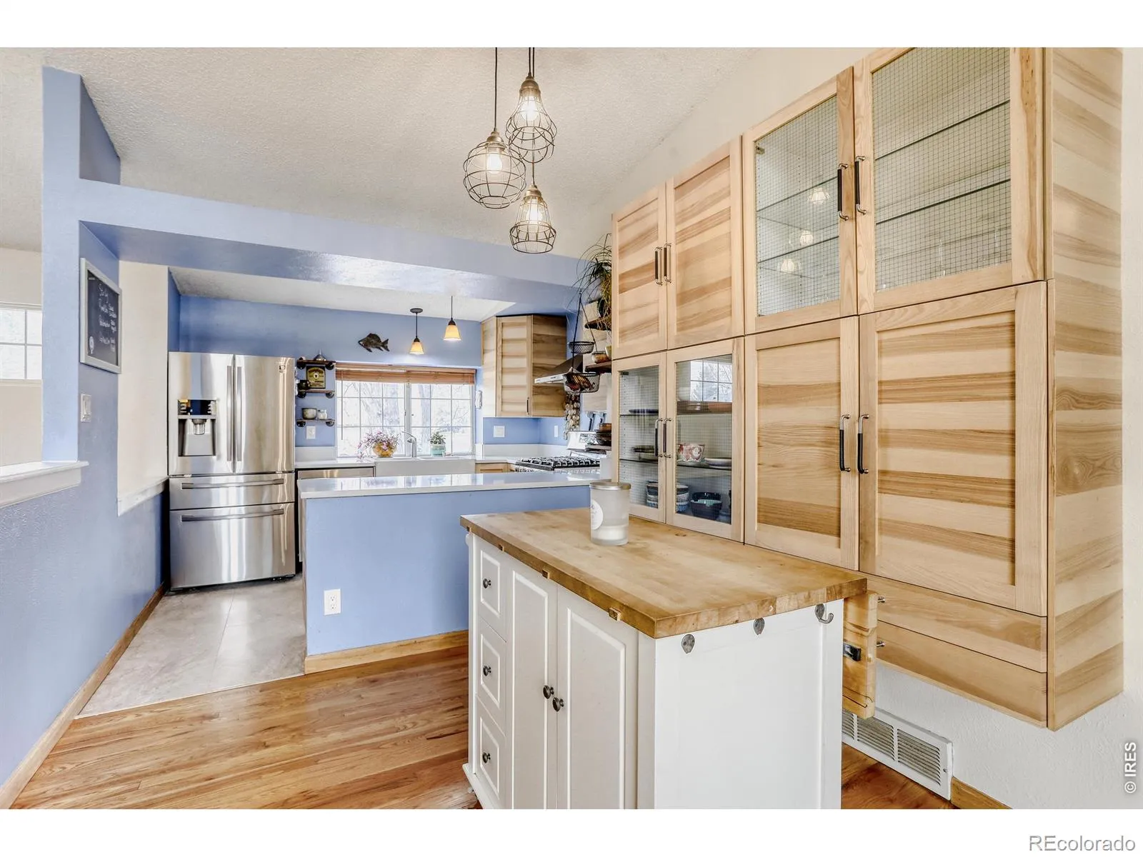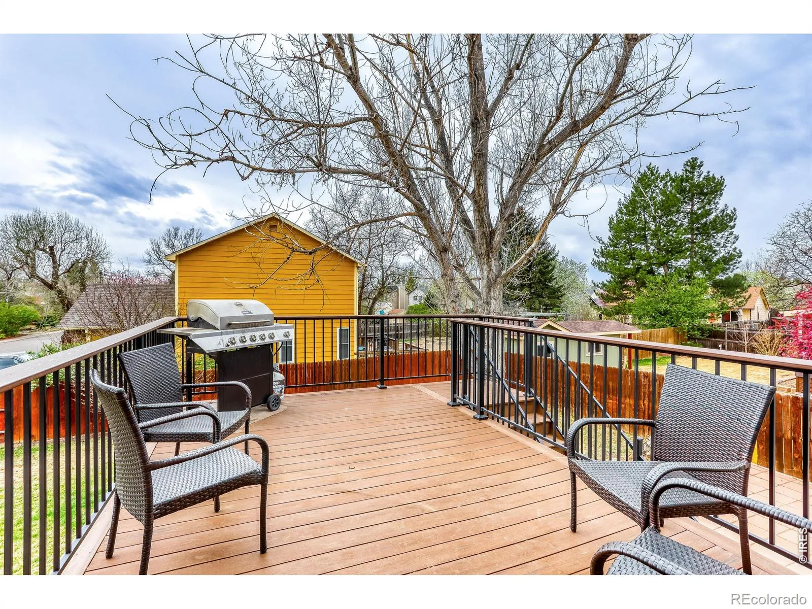 A lovely bi-level in the desirable Meadowlark Neighborhood of Longmont with a 2 car garage – This 3 Bedroom 2 Bathroom home is nicely upgraded and well cared for. Open concept kitchen, living, and dining spaces under airy vaulted ceilings on the main floor, and ample cozy family, den and/or office spaces on the bright garden level lower. Two bedrooms on the main level, including the bathroom access primary, and one bedroom on the lower level offer versatility. Updated kitchen boasts alder cabinetry, stainless steel appliances, quartz countertops, farmhouse sink and a gas range. Lower level living space has a wood burning fireplace to add to ambiance. Hardwood floors upstairs and vinyl planks downstairs are clean and hypoallergenic. A fantastic newer back deck looks over an ample backyard with beautiful trees, garden beds, a functional greenhouse, and is equipped with a new, smart, high efficiency sprinkler and irrigation system that adjusts itself! The HVAC system has been upgraded with high efficiency, dual fuel heat pump, furnace and a/c along with a whole house humidifier. Home has a radon mitigation system, new outside paint, and a little lending library! Close to schools, parks, and public transit. Freshly painted exterior.