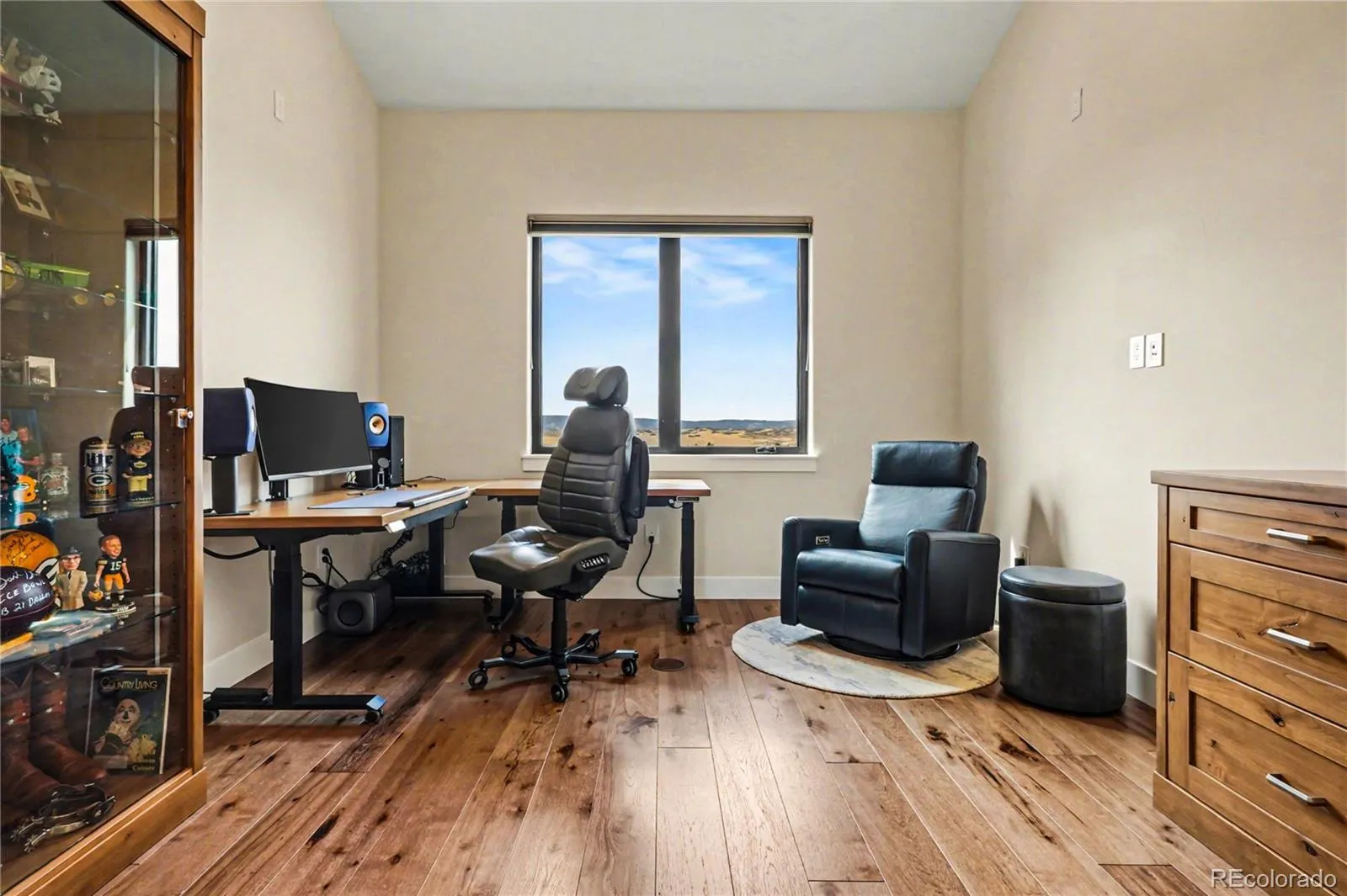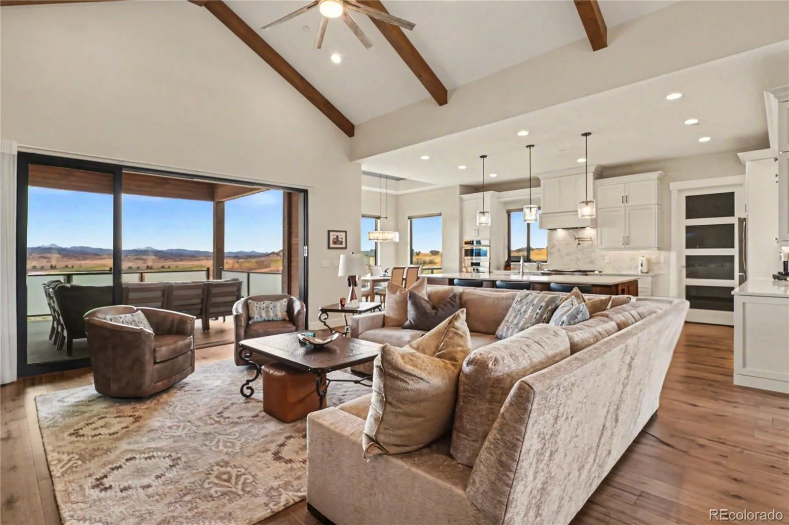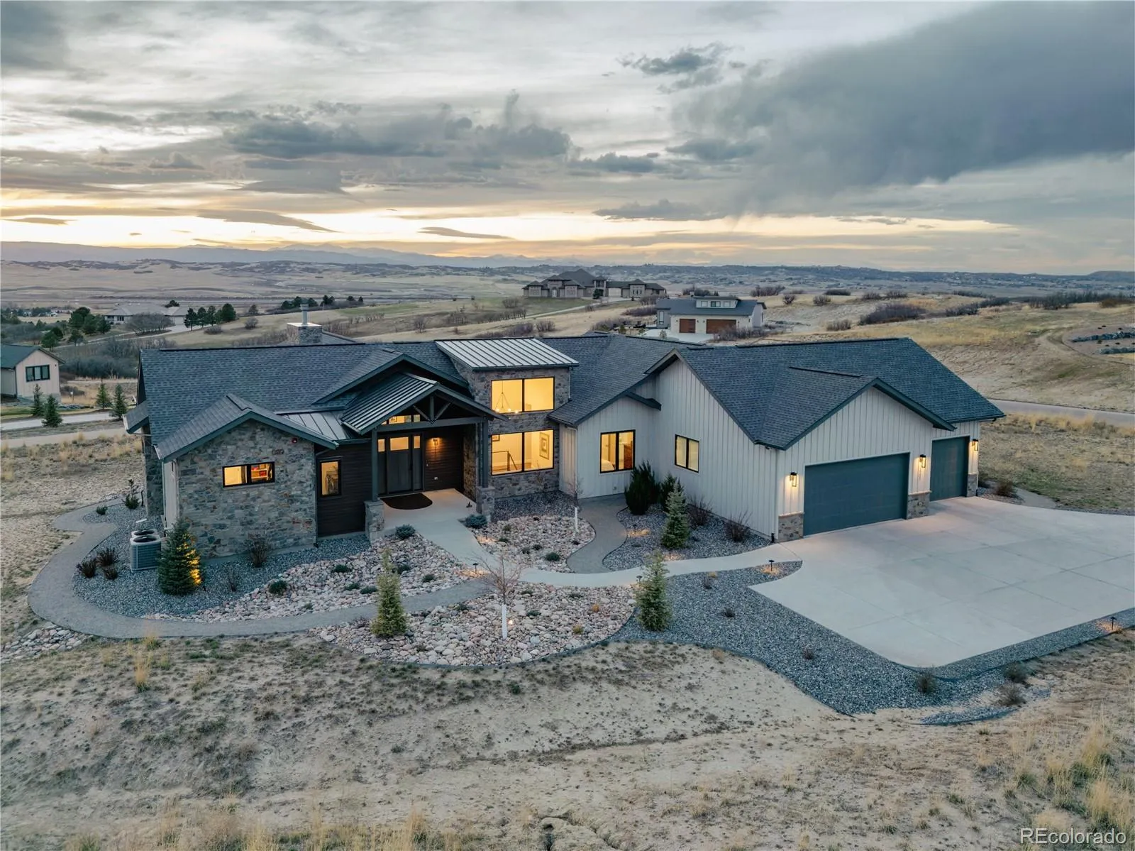 MOUNTAIN VIEWS & LUXURY FINISHES: Set on 2.5 elevated acres in Steven’s Ranch, the newest area of coveted Bell Mountain Ranch, this 2022 modern mountain estate captures sweeping views of rolling meadows and peaks from nearly every room. Striking stone exteriors and professional landscaping set the tone for intentional design and quality craftsmanship. Inside, a dramatic entry showcases soaring vaulted ceilings, exposed wood beams, wide-plank hardwood floors, and a statement stone linear fireplace with customizable ambient lighting. A sliding glass wall blends indoor and outdoor living, while powered shades and designer finishes elevate every space. The chef’s kitchen features crisp white cabinetry, an oversized wood island with rare leathered granite, stone countertops, and a luxury appliance suite with pot filler. Highlights include glass display cabinets, under-cabinet lighting, wine and beverage refrigeration, and a walk-in pantry with custom shelving and direct deck access. Outdoor living shines with a vaulted covered deck, radiant heaters, retractable glass walls, and pre-wiring for full-screen enclosure. A private hot tub terrace off the primary suite and a lower covered patio create a true resort-style setting. The primary retreat offers coffered ceilings, pendant lighting, a sliding glass wall with western views, and a spa-inspired bath with heated floors, dual floating vanities with under cabinet lighting, dual-head shower, soaking tub, and two Toto washlet bidet water closets. A custom walk-in closet completes the suite. The walkout lower level includes 848 finished sq ft plus 2,391 sq ft ready for expansion, ideal for additional ensuite bedrooms or multi-level living. A dedicated safe room adds peace of mind. Complete with a 1,524 sq ft heated 4-car garage featuring high-lift doors, side-mount openers, 50-amp EV prewire, and private interior access, this is Colorado luxury living at its finest. Make sure to see this one, you will be mesmerized!