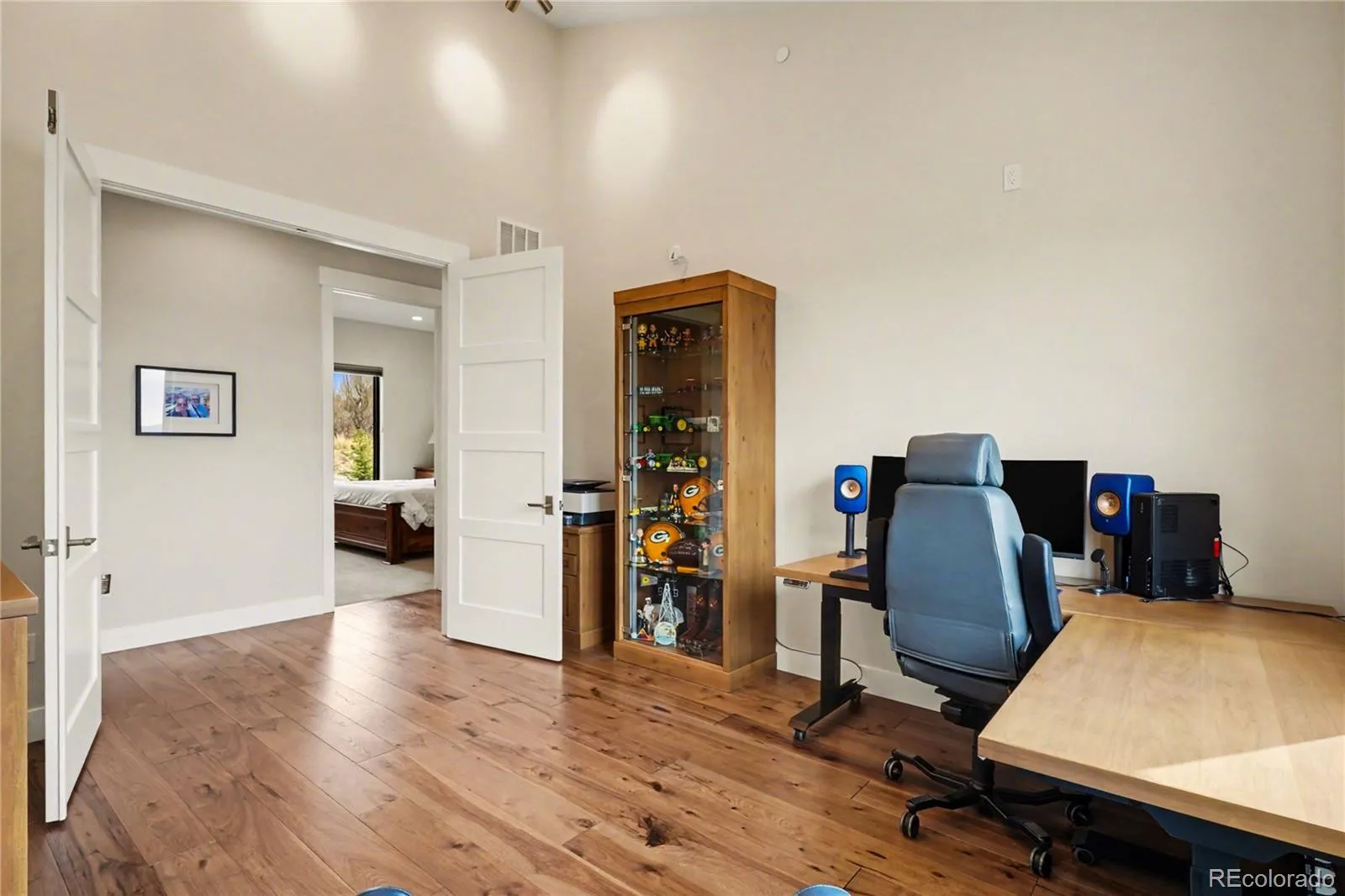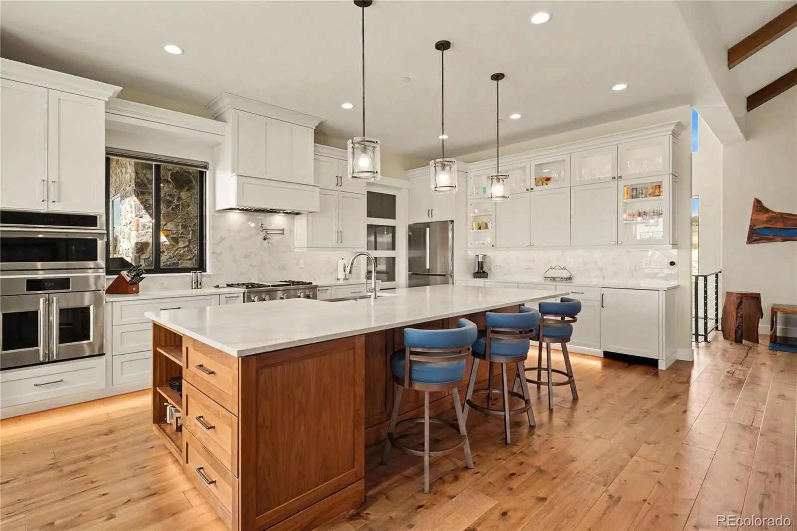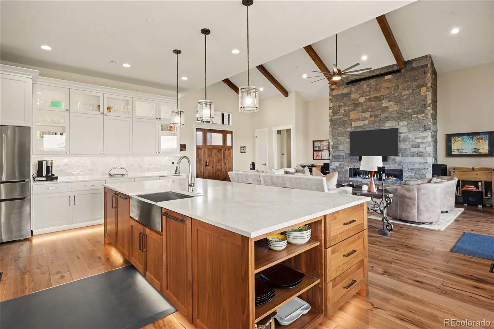 MOUNTAIN VIEWS & LUXURY FINISHES: Set on 2.5 elevated acres in Steven’s Ranch, the newest area of coveted Bell Mountain Ranch, this 2022 modern mountain estate captures sweeping views of rolling meadows and peaks from nearly every room. Striking stone exteriors and professional landscaping set the tone for intentional design and quality craftsmanship. Inside, a dramatic entry showcases soaring vaulted ceilings, exposed wood beams, wide-plank hardwood floors, and a statement stone linear fireplace with customizable ambient lighting. A sliding glass wall blends indoor and outdoor living, while powered shades and designer finishes elevate every space. The chef’s kitchen features crisp white cabinetry, an oversized wood island with rare leathered granite, stone countertops, and a luxury appliance suite with pot filler. Highlights include glass display cabinets, under-cabinet lighting, wine and beverage refrigeration, and a walk-in pantry with custom shelving and direct deck access. Outdoor living shines with a vaulted covered deck, radiant heaters, retractable glass walls, and pre-wiring for full-screen enclosure. A private hot tub terrace off the primary suite and a lower covered patio create a true resort-style setting. The primary retreat offers coffered ceilings, pendant lighting, a sliding glass wall with western views, and a spa-inspired bath with heated floors, dual floating vanities with under cabinet lighting, dual-head shower, soaking tub, and two Toto washlet bidet water closets. A custom walk-in closet completes the suite. The walkout lower level includes 848 finished sq ft plus 2,391 sq ft ready for expansion, ideal for additional ensuite bedrooms or multi-level living. A dedicated safe room adds peace of mind. Complete with a 1,524 sq ft heated 4-car garage featuring high-lift doors, side-mount openers, 50-amp EV prewire, and private interior access, this is Colorado luxury living at its finest. Make sure to see this one, you will be mesmerized!
