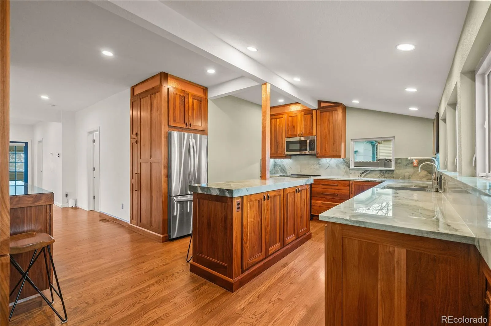 The chef’s dream kitchen is a showstopper. Natural quartzite countertops shimmer under soft lighting, while rich walnut cabinets provide both elegance and ample storage. But what truly sets this kitchen apart is the custom hammered copper detail—a striking, artisanal touch that infuses the space with warmth and sophistication. Whether you’re hosting dinner parties or enjoying a quiet morning coffee, this space is sure to inspire.