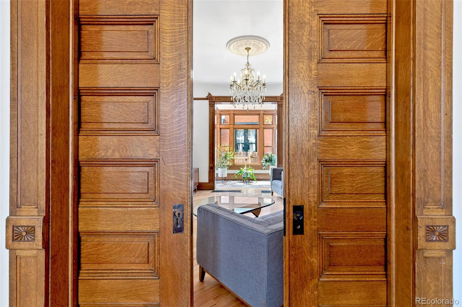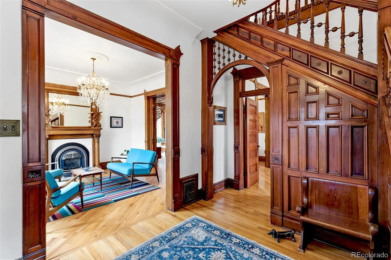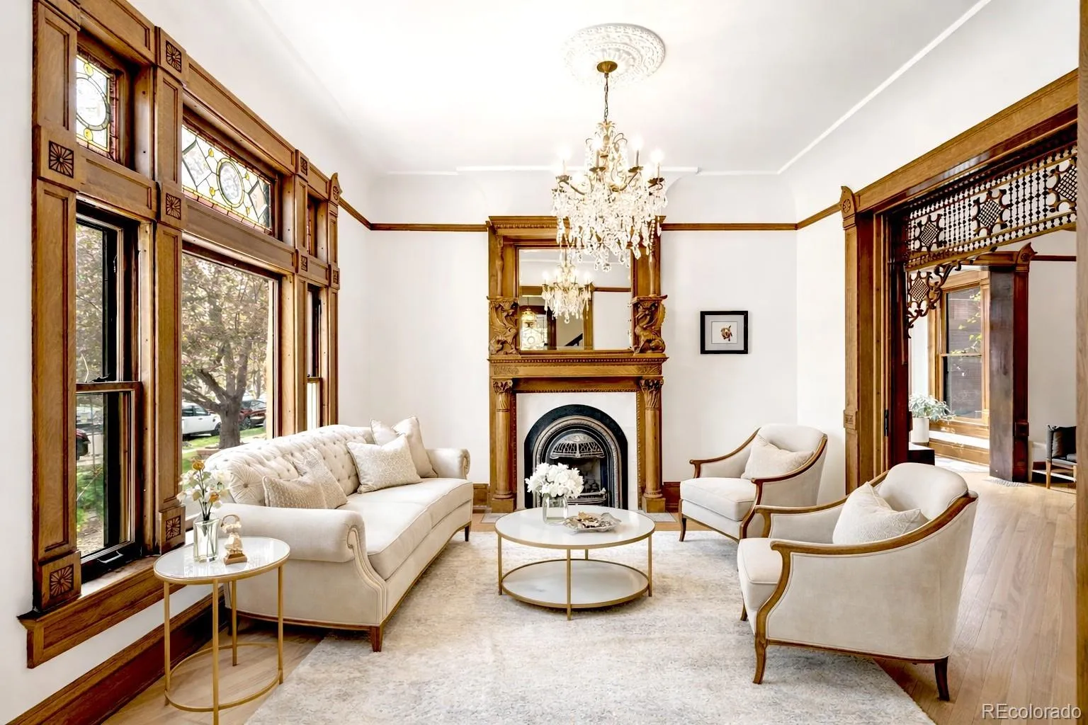 This is THE ONE you’ve been waiting for! The Lobach House is a one of a kind 1893 Victorian offering a rare blend of historic grandeur and inspired living. Gracefully positioned on a corner lot, this spacious 2-story Landmark Residence enchants from the very first glance with ornate trim, wraparound covered porch and a Victorian-inspired pollinator garden. Inside, a grand foyer and sweeping staircase welcome you into a world of lovingly preserved craftsmanship and character. Soaring ceilings, distinct woodwork, gleaming hardwood floors and carefully restored finishes create a rich, soulful backdrop. The living room is bathed in sunlight with an oversized window topped with stained glass transoms, while a gas fireplace with a hand-carved mantel adds warmth & drama. Throughout the home intricate millwork, original pocket doors, vintage hardware and restored windows whisper stories of a bygone time beautifully reimagined for today. A refined sitting room and sunroom offer sunlit moments of quiet while the formal dining room—complete with inlaid wood floors and a built-in hutch—set the stage for entertaining. A main-level bedroom features an ensuite bathroom with dual entry to the sitting room. A new kitchen balances heritage and modernity with Carrara marble countertops, prep island, a GE Monogram 8-burner range, farmhouse sink and pantry with built-ins. Upstairs, a stained-glass window glows on the landing and leads to an open flex space. The primary suite is a serene retreat with a custom walk-in closet & an new vintage inspired 3/4 bath. 3 additional bedrooms, 1 adorned with a stained-glass picture window, and a stylish hall bath complete 2nd story. Outdoors, the magic continues with a covered wraparound porch, mature trees and a private yard with gardens. With rare scale, remarkable craftsmanship, and a location that places you moments to Highland Square, Tennyson & Sloan’s Lake. This is more than a home—it’s a piece of living history waiting for its next chapter.