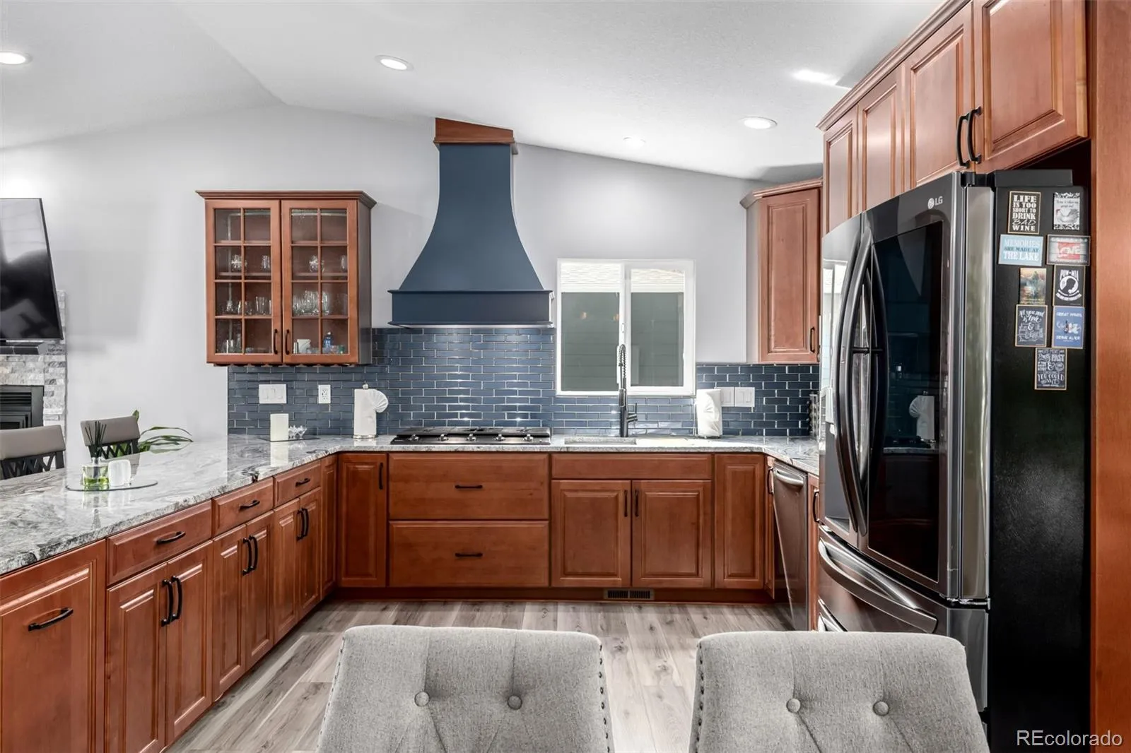 The fully remodeled chef’s kitchen is a standout, complete with quartz countertops, high-end appliances including a premium refrigerator, stove, and dishwasher, along with new cabinetry and a charming dry bar—perfect for entertaining. The inviting living area is anchored by a brand-new fireplace, creating a warm and cozy space to relax.
