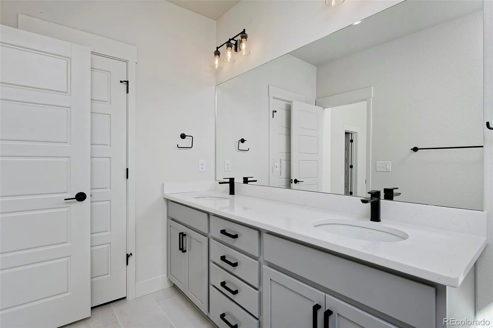 with dual vanities and a tiled shower with bench. Upstairs laundry adds everyday convenience.