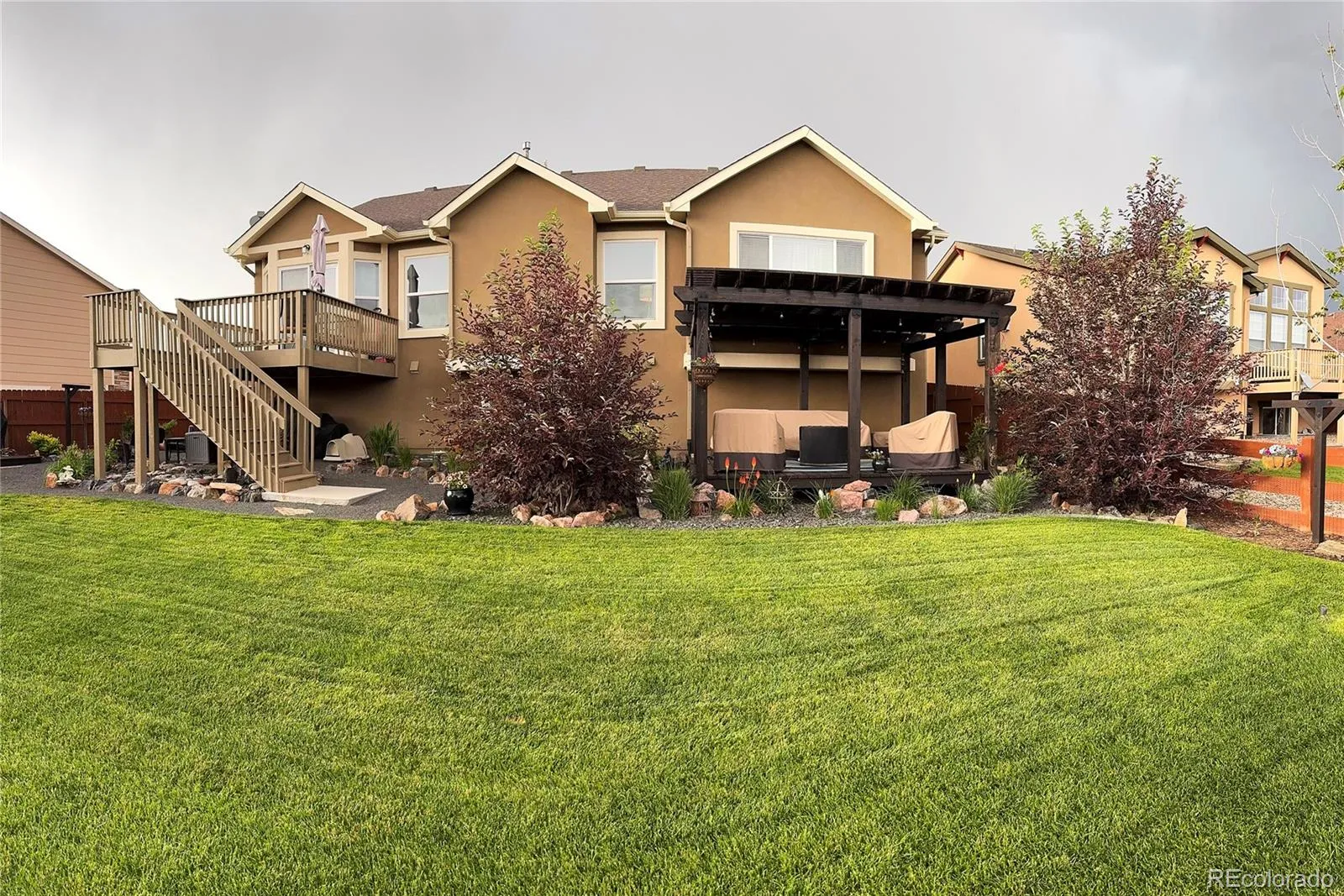 This beautifully designed one owner garden-level home offers space, comfort, and thoughtful upgrades throughout. Featuring a three-car garage and four bedrooms-including a spacious main bedroom, a private mini-suite, and two additional bedrooms-this home also includes three and one-half bathrooms, a dedicated office, and convenient main-floor laundry. The bright and expansive basement great room is perfect for relaxing or gathering, which includes existing pre-plumbing for a future wet bar offering an easy opportunity to add a beverage station, coffee station or additional entertaining convenience. To expand on entertaining, the pre-wired theater room (7-channel surround sound ready) delivers a true entertainment experience. The chef’s kitchen boasts double ovens, a gas cooktop, granite countertops, hardwood floors, and abundant storage, flowing seamlessly into the dining area and main living spaces. Additional highlights include a gas fireplace with forced-air fan and striking oversized rock surround, Vivint security system, air conditioning, and hardwood flooring in the entryway, hall, dining room, and kitchen. The oversized garage is well-lit with five LED fixtures, ideal for storage or projects. Outdoor living is just as impressive with a large custom-built pergola, garden wall for added privacy, low-voltage landscape lighting front and back, front and rear sprinkler systems with drip systems, and a charming front-yard water feature. The fully landscaped yard includes mature trees, shrubs, and plants-most maintained by the sprinkler system. An 8×12 stucco shed matches the home for cohesive curb appeal. A sliding rear door includes a built-in doggy door (original glass available if preferred), making this home as practical as it is beautiful. This thoughtfully maintained home combines functionality, style, and comfort-inside and out. Schedule your showing today!