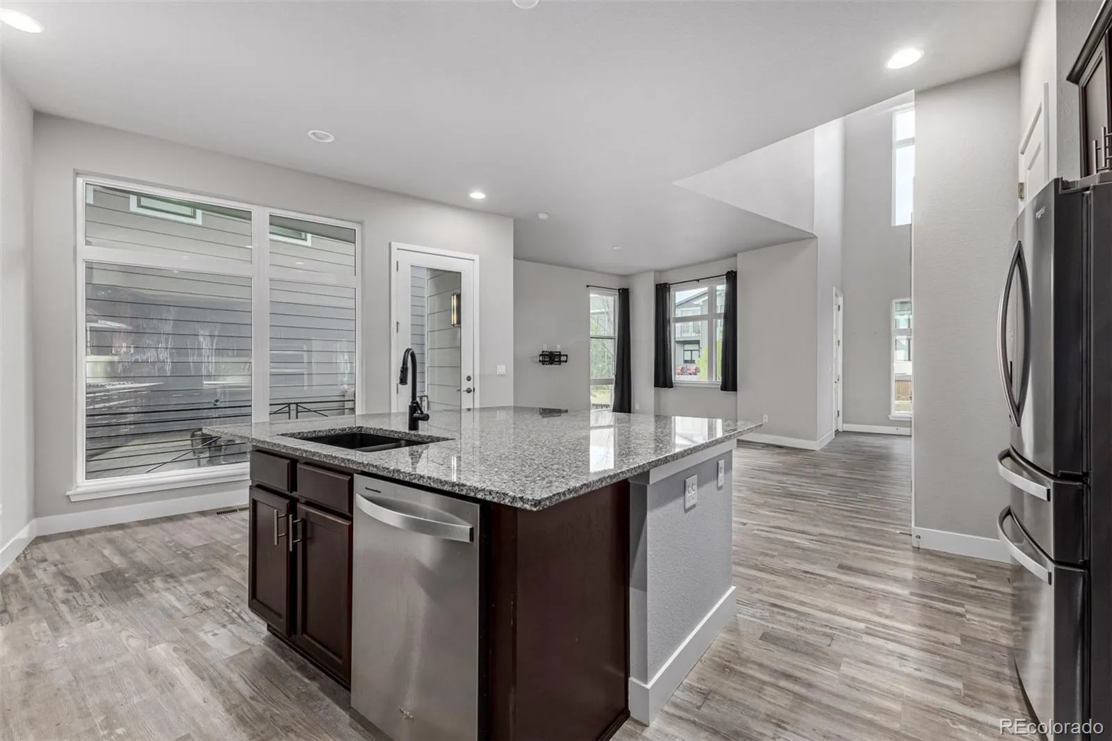 Inside, this beautifully designed 3-bedroom, 4-bath residence offers three spacious levels of modern living. The main floor welcomes you with an open-concept layout, featuring expansive dining and living areas filled with natural light, stylish wood-look flooring, and a clean, contemporary palette. The gourmet kitchen is a standout, complete with granite countertops, stainless steel appliances, a large center island with seating, abundant cabinetry with crown molding, and a walk-in pantry—perfect for everyday living and entertaining.