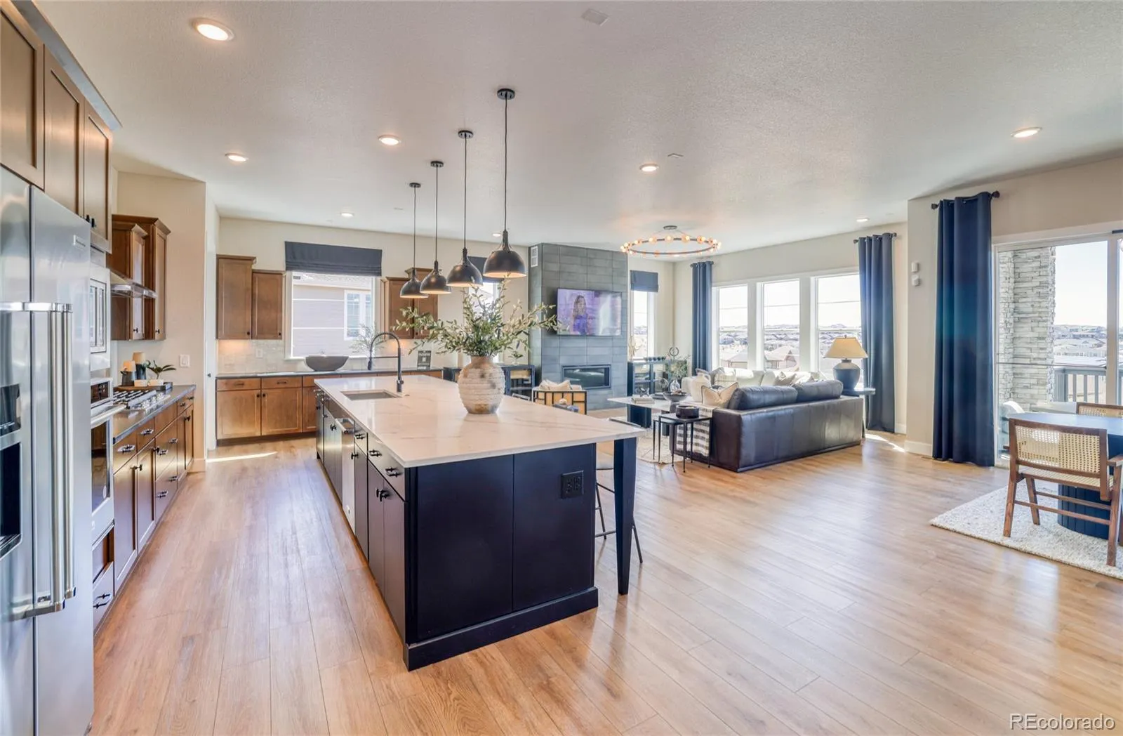 Inside, thoughtfully designed living spaces create comfort and flexibility. A main-level den provides the perfect home office or creative space, while two secondary bedrooms are served by a stylish ¾ bath with a shower enclosure. The gourmet kitchen shines with KitchenAid appliances, a large center island, and seamless flow into the café and gathering area—perfect for entertaining family and friends.