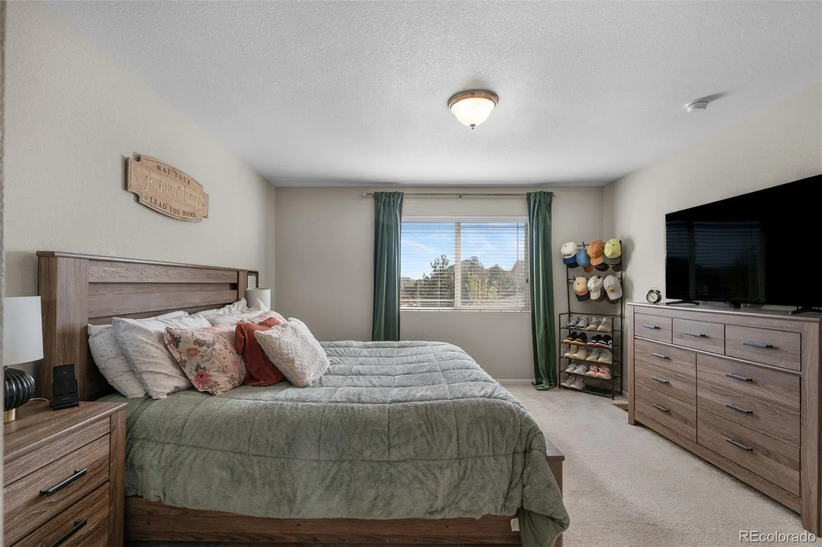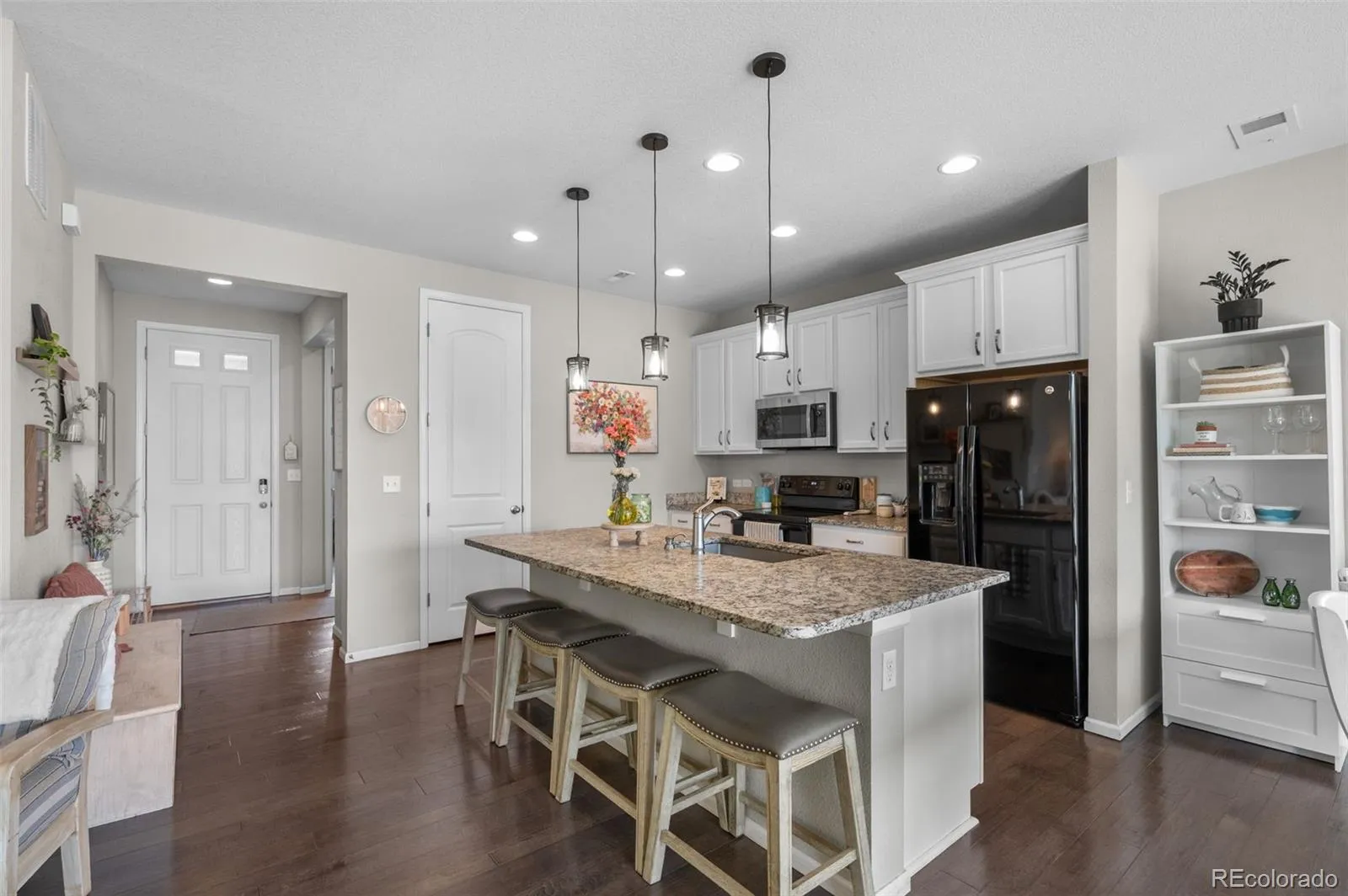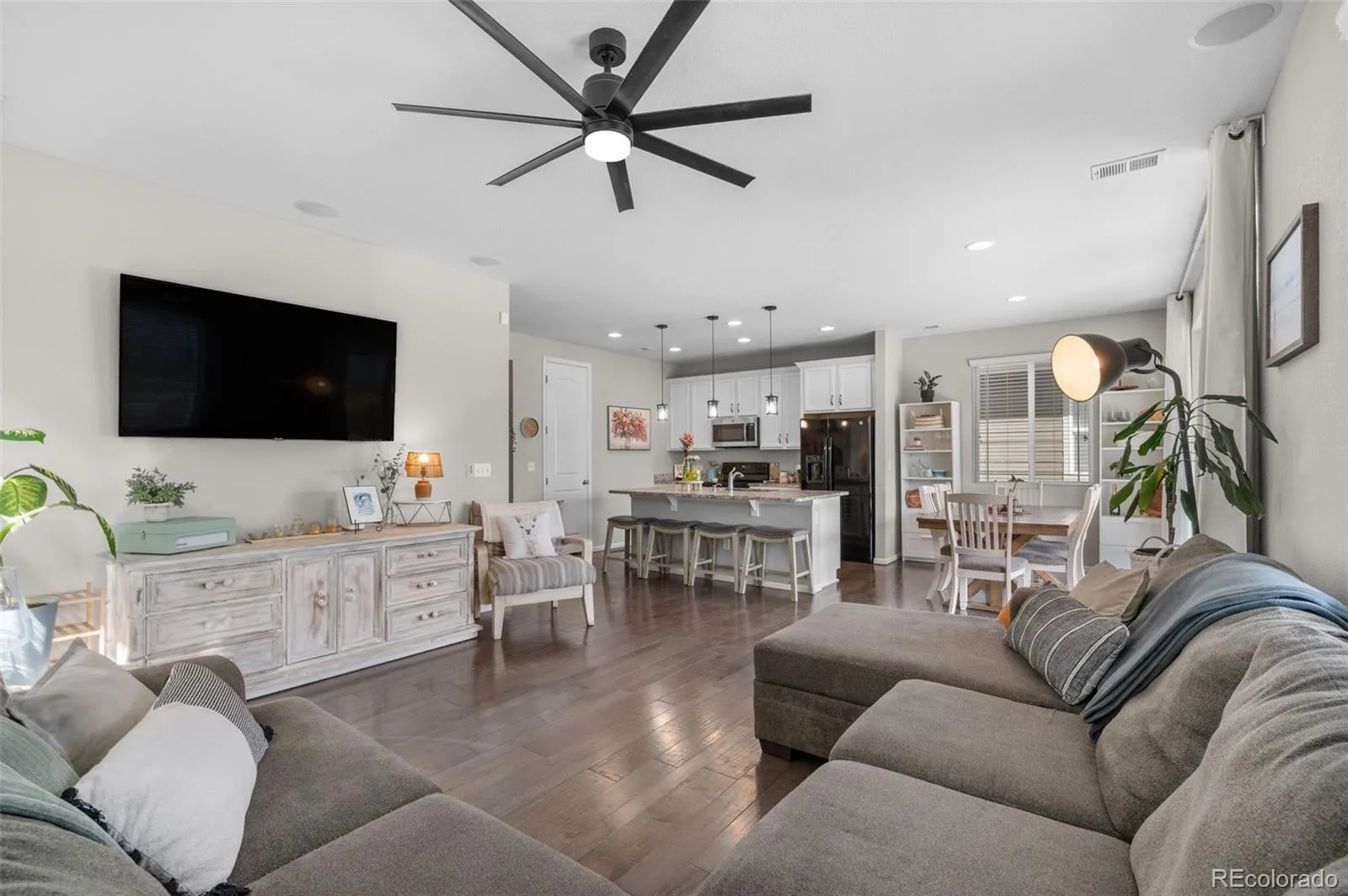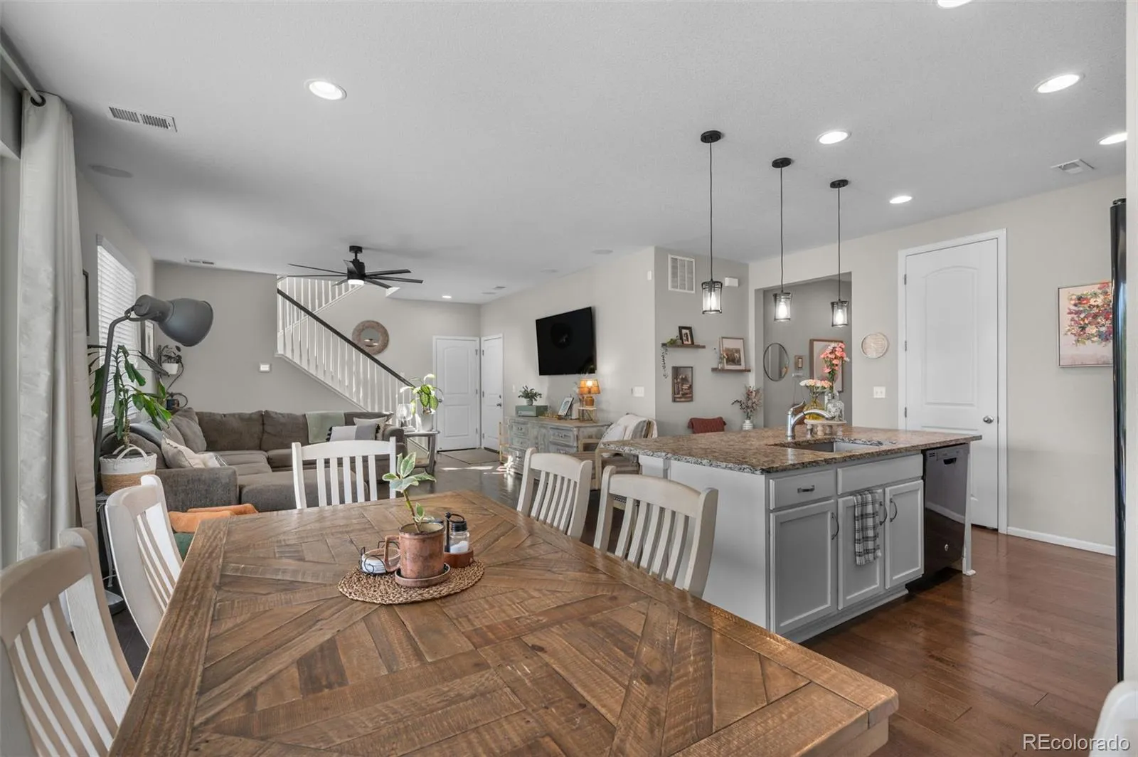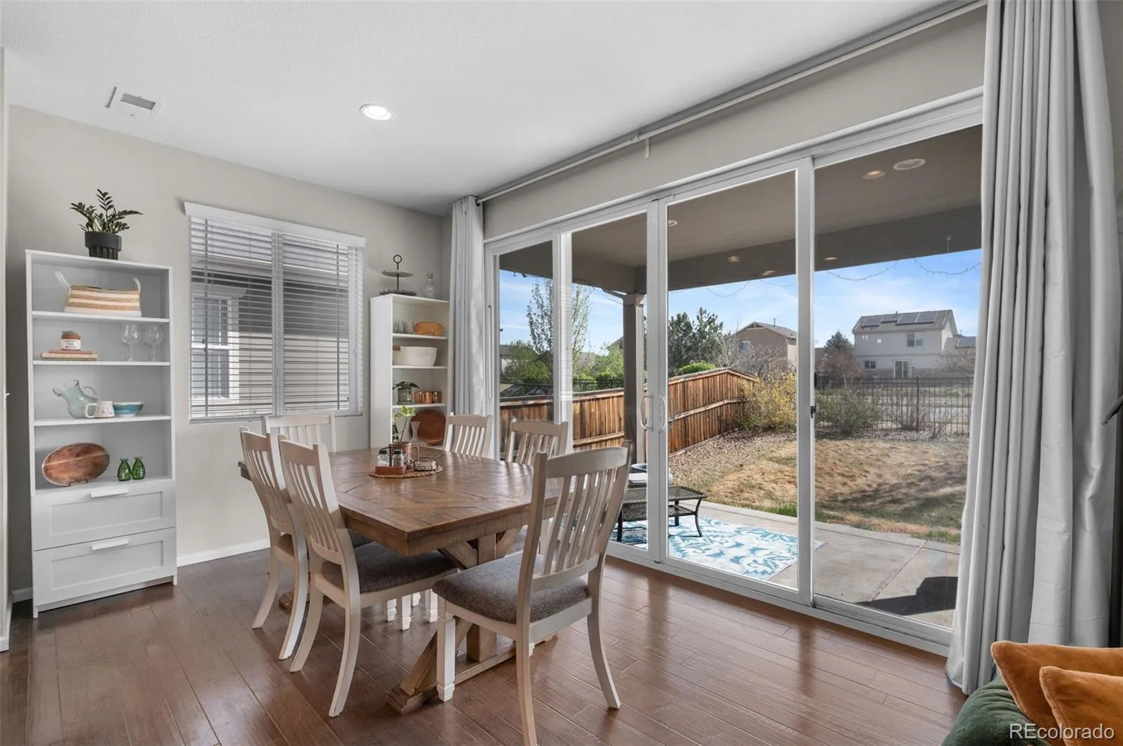 Beautifully maintained and thoughtfully updated, this two-story home in Traditions offers comfort, functionality, and an inviting layout in a fantastic location. The main level welcomes you with warm hardwood floors and a bright, open living space designed for gathering. The kitchen features 42″ white cabinetry with crown molding, leathered granite countertops, and a seamless flow into the great room—complete with in-wall surround sound for cozy nights or entertaining. A main-floor bedroom and 3 quarter bath provide flexibility for guests, work-from-home needs, or multigenerational living. Upstairs, the spacious primary suite offers a quiet retreat with dual vanities, a large walk-in closet, and plenty of natural light. Two additional bedrooms, a full bathroom, and a well-designed laundry room with built-in cabinetry and granite counters round out the upper level. Located just minutes from parks, schools, and all the shopping, dining, and entertainment at Southlands. This home combines convenience with a true neighborhood feel. The roof was replaced in 2024