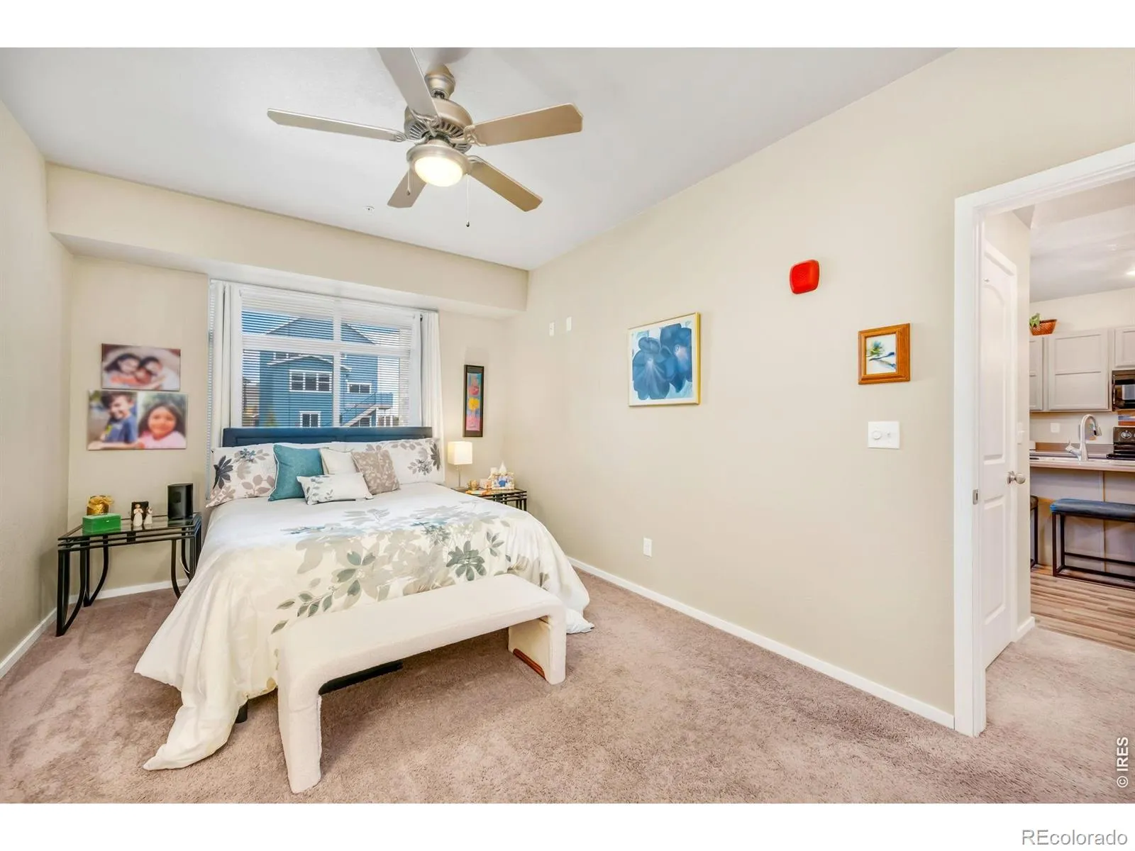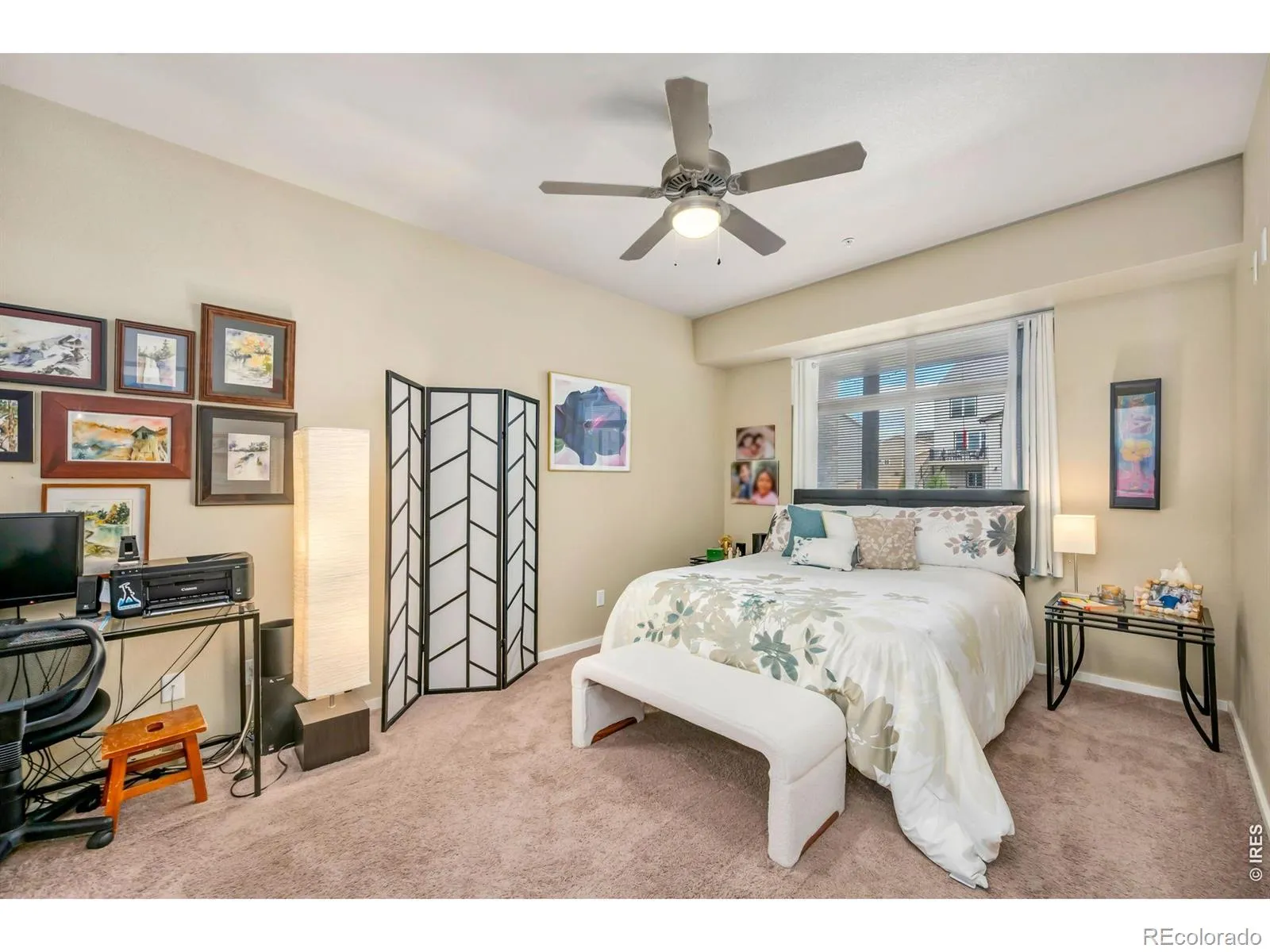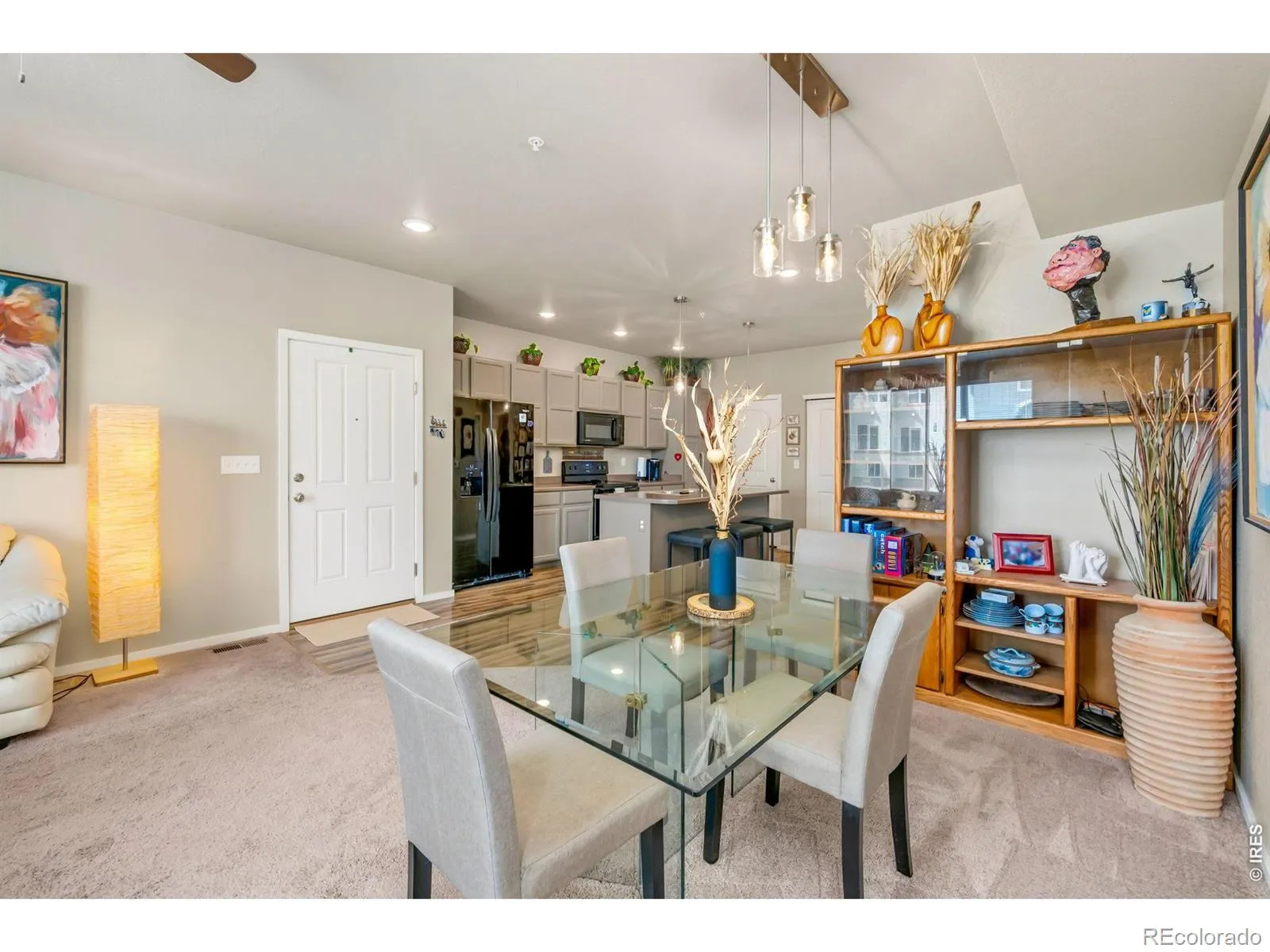 Welcome to easy, low-maintenance living in Loveland’s sought-after Enchantment Ridge community. This well-kept first-floor condo offers 905 square feet of thoughtfully designed space, featuring a comfortable 1-bedroom, 1-bath layout that feels both functional and inviting.The open-concept living area seamlessly connects the kitchen, dining, and living spaces, creating a natural flow for everyday living. The kitchen is equipped with sleek black appliances, ample cabinetry, and a convenient layout that makes cooking and entertaining simple. Large windows bring in great natural light while maintaining a cozy, grounded feel from the main-level setting.The spacious bedroom provides a quiet retreat with plenty of room to relax, while the full bath is clean and well-appointed. A dedicated laundry area with washer and dryer included adds to the home’s convenience, along with included window coverings throughout. Pride of ownership shows, making this home truly move-in ready. Built for efficiency and comfort, the home features 2×6 construction, a 95% efficient furnace, central A/C, a programmable thermostat, and strong insulation to keep energy costs in check year-round. Enjoy the benefits of no metro district tax and an HOA that covers water, sewer, trash, snow removal, lawn care, and exterior maintenance-perfect for those seeking a lock-and-leave lifestyle. Located near a neighborhood playground with easy access to shopping, dining, and commuter routes, this home offers both convenience and community. Buyers may qualify for the City of Loveland’s Affordable Housing Program (up to 70% AMI) and will sign a deed restriction at closing if applicable, though qualification is not required for purchase. A great opportunity to own a modern, efficient, and affordable home in a desirable location.