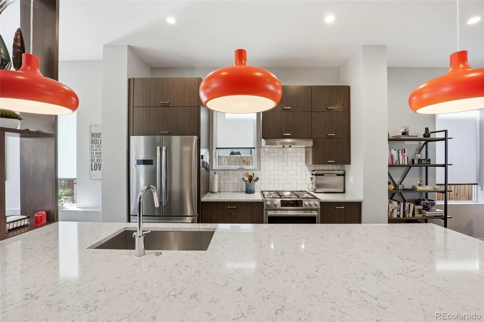 Inside, you’ll find tall ceilings, expansive windows, and beautiful hardwood floors that fill the home with natural light. The heart of the home is a designer kitchen featuring a show-stopping quartz waterfall island, premium Bosch appliances, abundant storage, custom cabinetry, and thoughtful upgrades like soft-close drawers and sliding shelves.