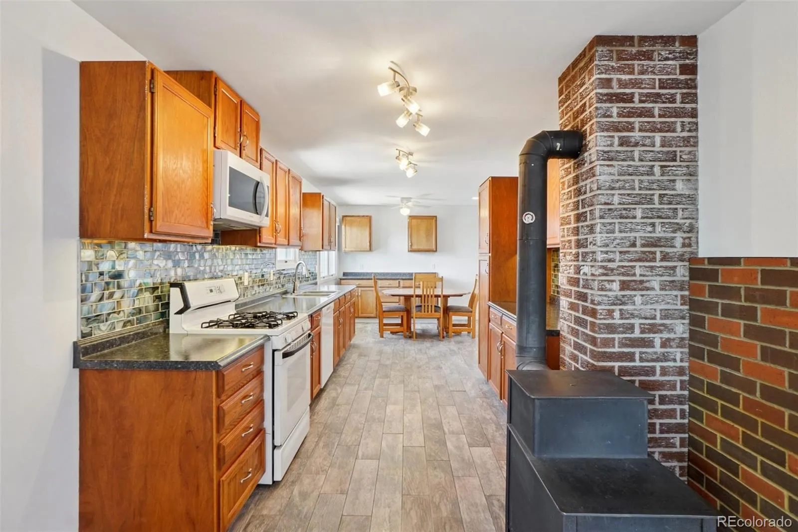 The kitchen offers generous cabinetry, ample counter space, stainless appliances, and an adjoining dining area that flows seamlessly for everyday living and entertaining. A cozy wood-burning stove with brick surround adds warmth and character, while the sunroom creates the perfect place to unwind and take in views of the surrounding acreage year-round.