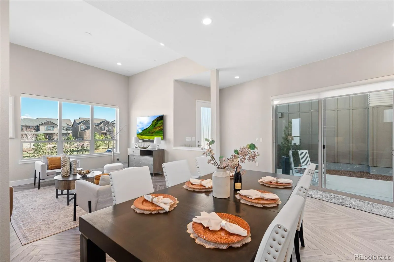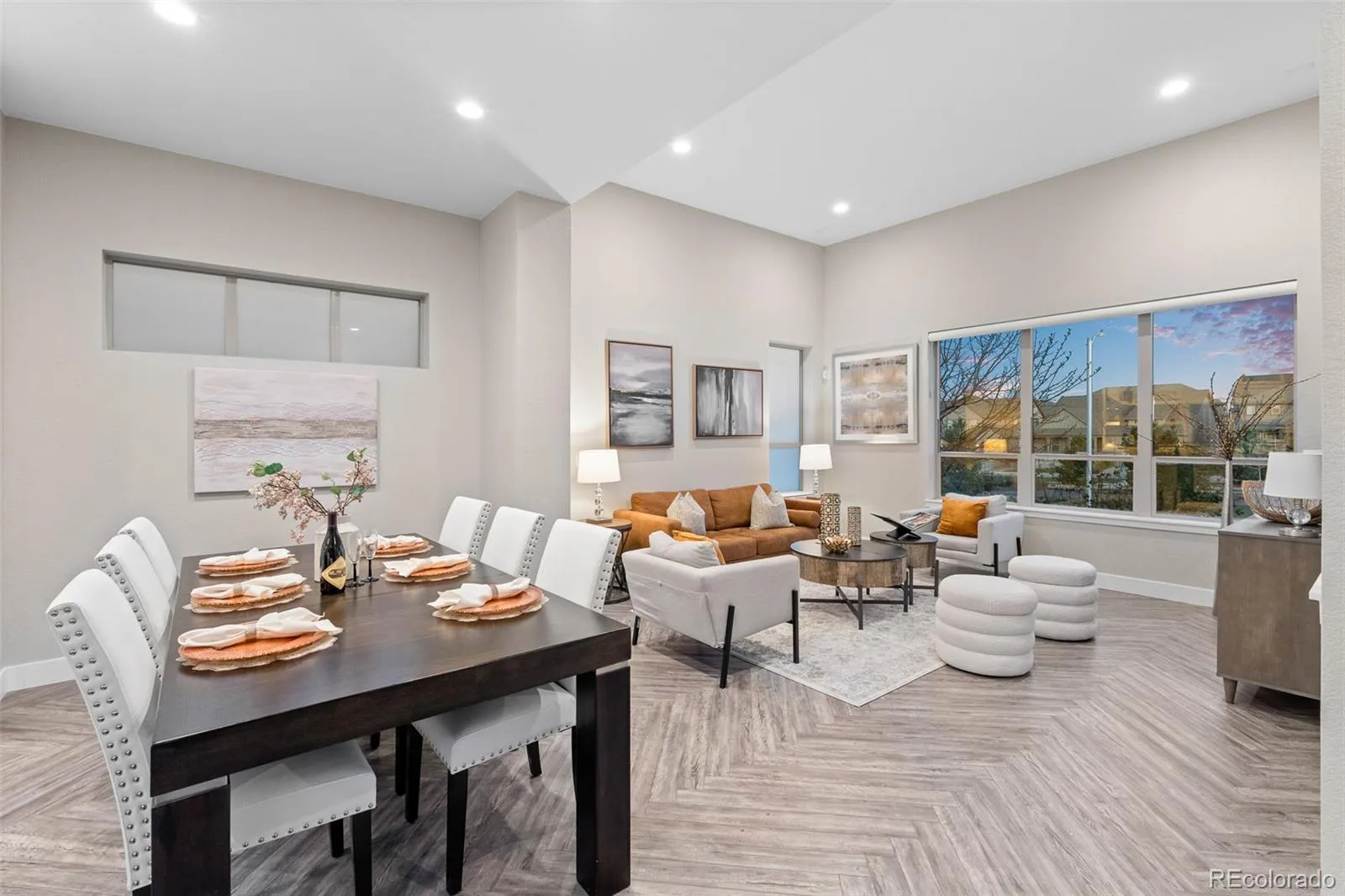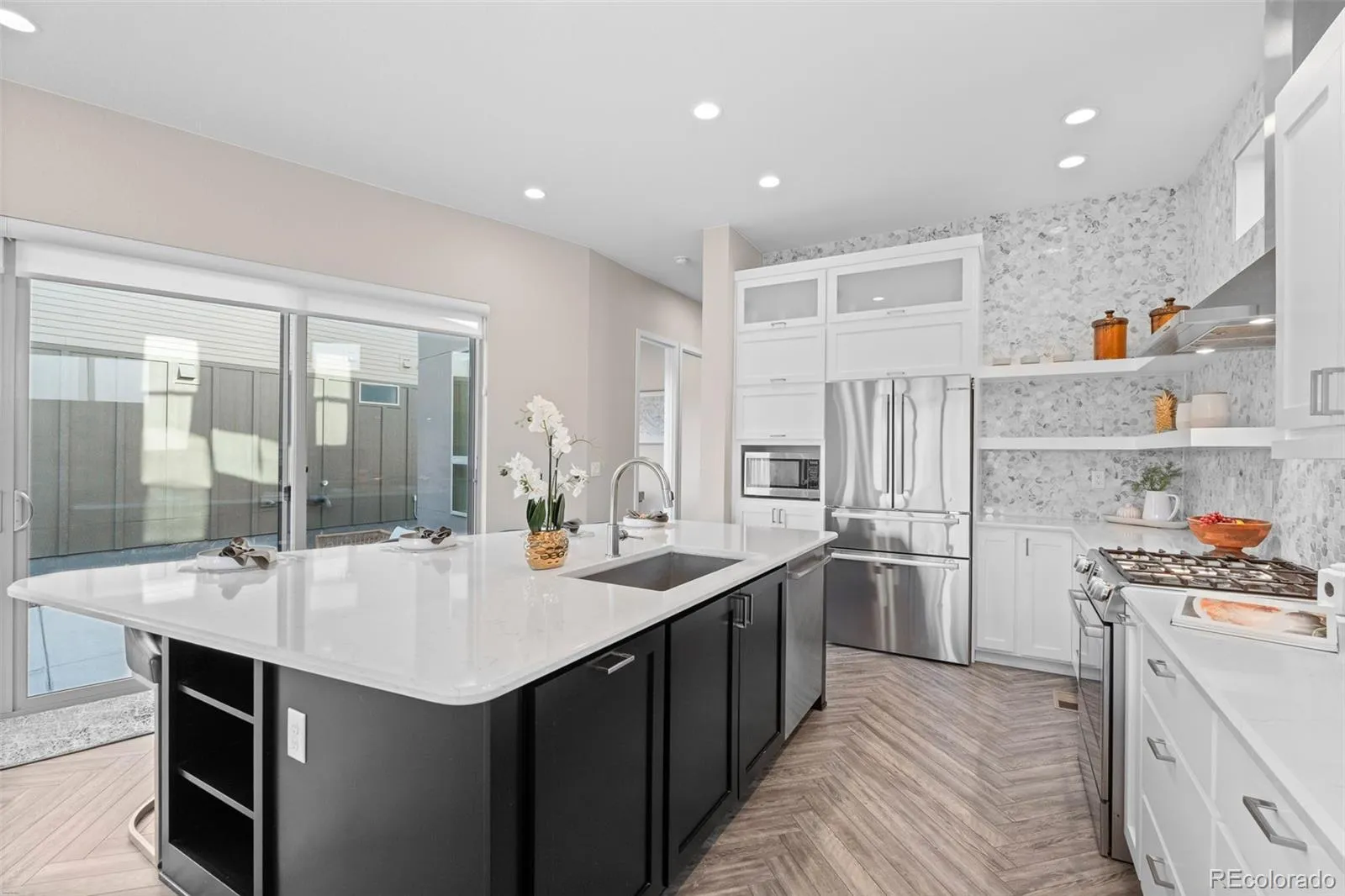 From the moment you walk in, the difference is clear. Wide-plank herringbone flooring, abundant natural light, and a thoughtful layout create a home that feels elevated from the start. The kitchen is the centerpiece, featuring an oversized quartz island, two-tone cabinetry, full-height designer backsplash, gas range, and seamless flow into the dining and living areas, ideal for both everyday living and entertaining.