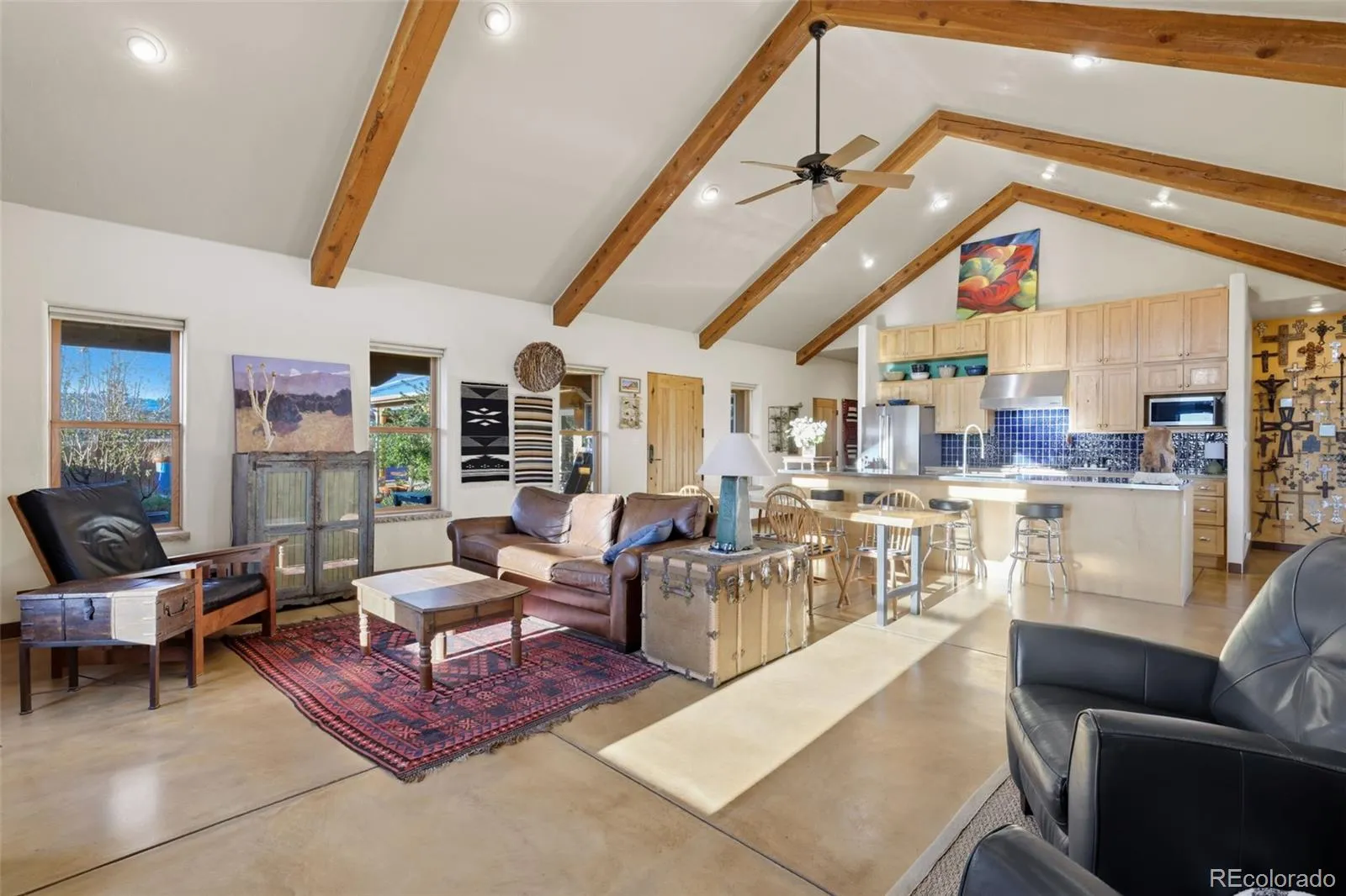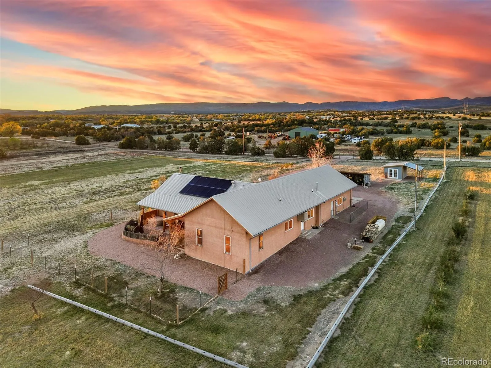 This one is not a “scroll past” listing – it’s a right buyer, right story/dream come true property. It’s a thoughtfully designed, custom-built Northern New Mexico–inspired ranch set on 10 acres, created with a true focus on longevity, efficiency, and craftsmanship built with ICF construction. The solid hickory front door, substantial in both presence and build, sets the tone for what’s carried throughout the home—intentional construction, durable materials, and details you simply don’t find in standard builds. Inside, the open layout is filled with natural light, framed by Marvin Integrity windows, solid wood beams and acid-stained concrete floors with radiant in-floor heat. Built using a double-slab system w/ multiple heating zones. The kitchen is functional, featuring custom hickory cabinetry, a large stainless-steel island, quartz countertops with a unique pebble finish, it’s a space designed to be used, not just admired. Primary suite offers connection to the outdoors, w/ access to the patio views toward the Wet Mountains and Greenhorn range. The ensuite bath features a multi-head shower. What truly sets this home apart is how it was built. The structure includes enhanced rebar reinforcement, a full moisture barrier system around the foundation, engineered patio construction designed to prevent settling, and a metal roof with oversized flashing for long-term durability. Every major system—from the 6-zone boiler heating system to the oversized solar array—was selected with performance and longevity in mind. Outside, irrigation water shares, multiple outbuildings, and space for equipment, animals, or expansion, Covered patios and courtyard spaces create areas to relax, entertain, located in Penrose, you’ll enjoy a quieter setting with room to breathe, while still being within reach of everyday conveniences. This is a home for someone who values how a property is built—not just how it looks. A place designed to last, perform, and be appreciated over time.