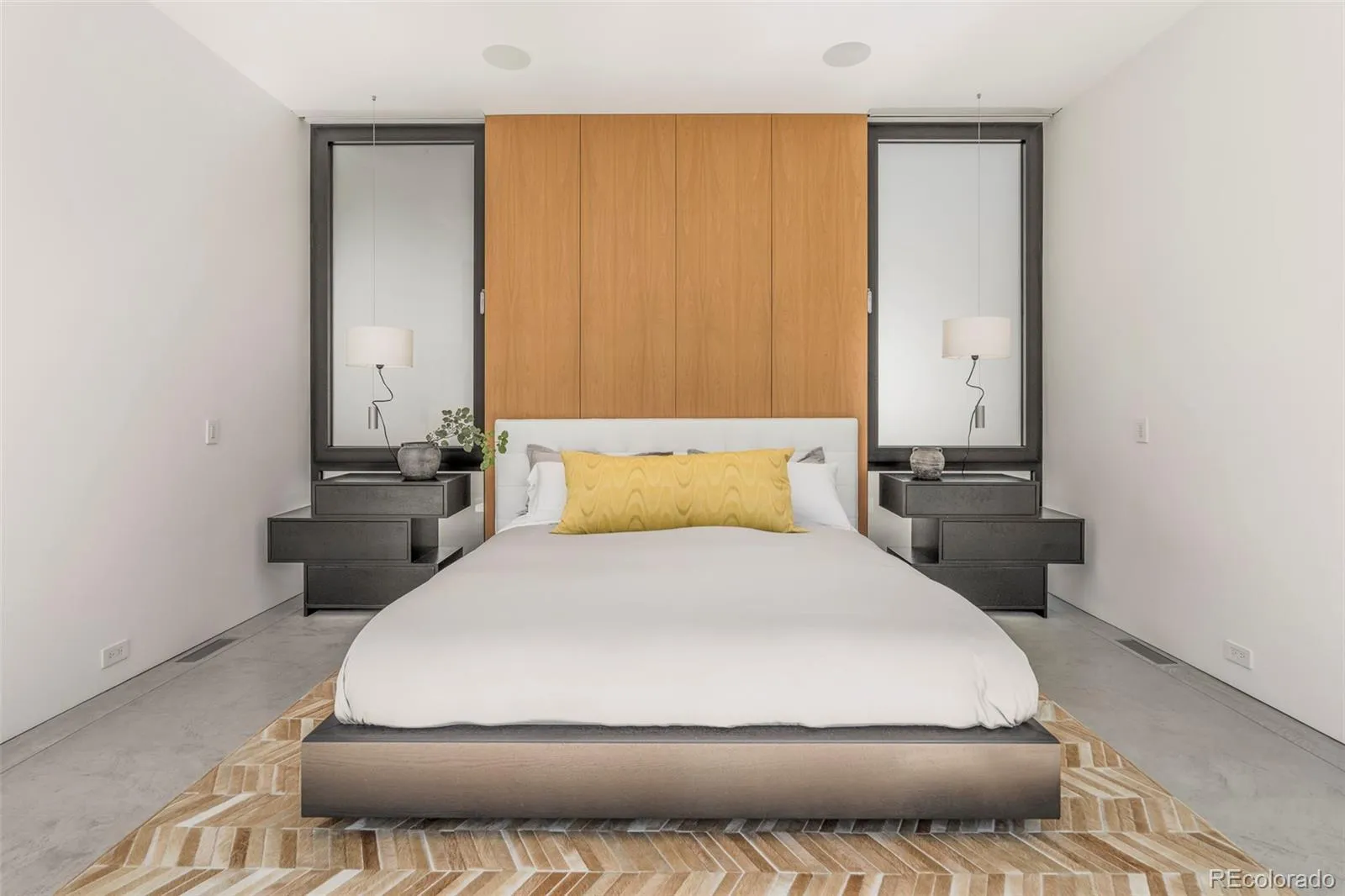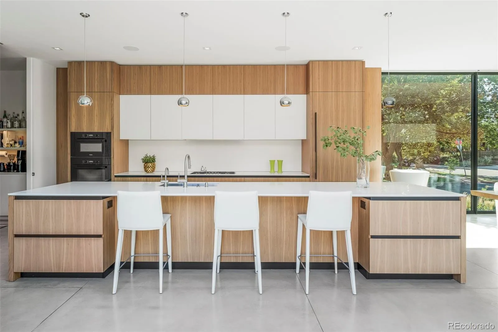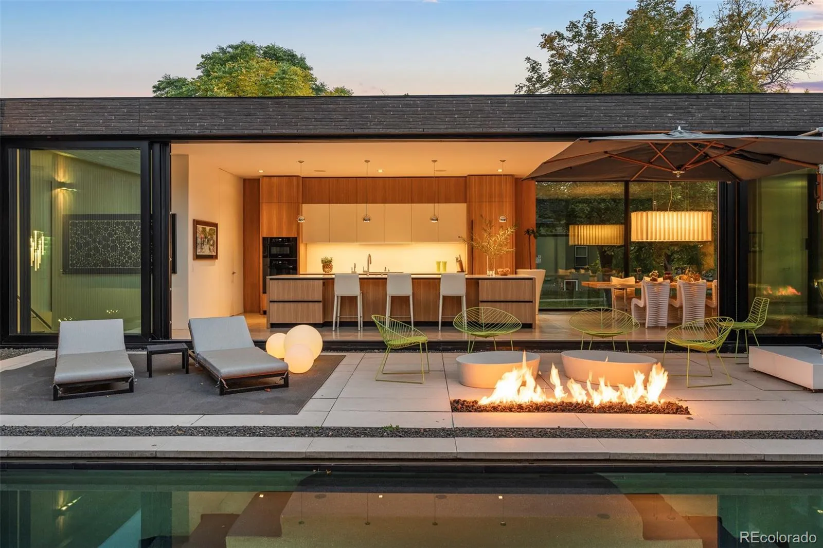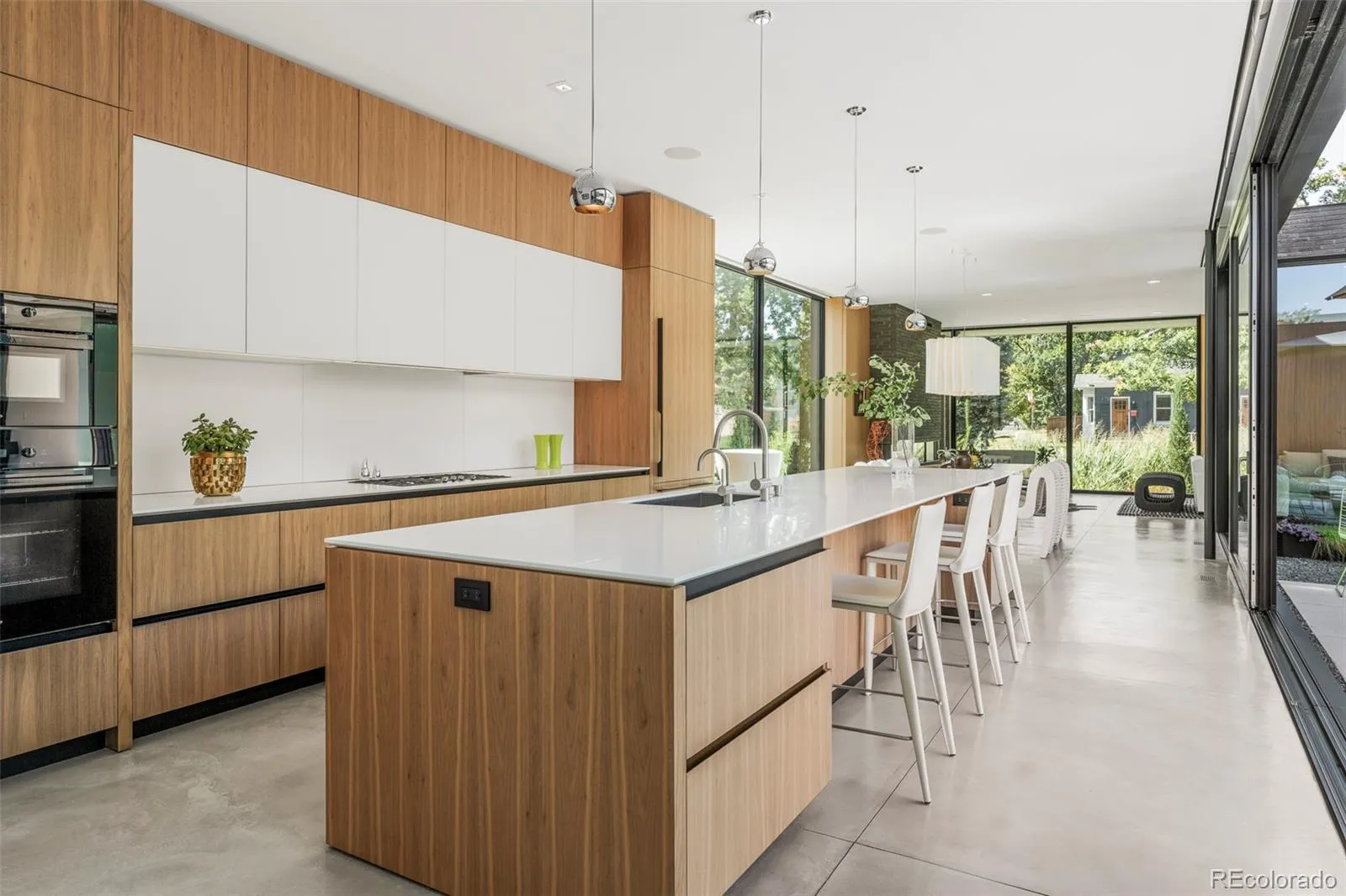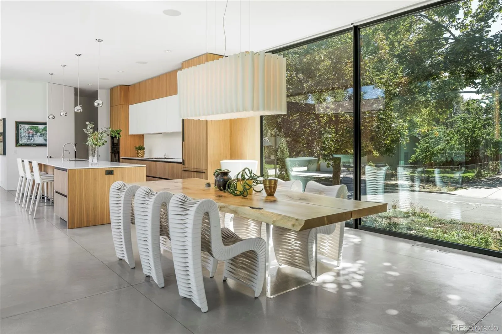 the BRICK CITY HOUSE commands subtle attention on a corner lot in Denver’s coveted Sunnyside neighborhood. Winning several design awards and designed by Mike Piche, the Brick City House is a study in quiet modernism. A simple palette of refined materials – handmade brick, plaster, glass and wood – transforms this residence into an extraordinary piece of timeless design. A fresh interpretation of the classic mid-century ranch, the linear home blurs between exterior and interior and boldly inserts a central volume open courtyard complete with a pool. The entire first floor is perfect in scale – doors, windows + ceiling heights are all at 10’ high. Turning the house inward – the rooms all face and open to the central courtyard. Your eye is lifted upward focusing on the sky, and inward towards the courtyard and pool. The floors are all poured polished concrete. Walls of custom walnut paneling create airy room divisions. Main floor lounge is anchored by a large brick fireplace with walls of windows overlooking the mature vegetation. Entering the custom designed kitchen, from Vesel Brand, is beautifully thought out. Miele appliances, knife-edge slab countertops, white glass back splash and the butler pantry + bar are exceptional. The laundry suite rivals any laundry room, period. Large sliding glass doors open the entire kitchen to the courtyard allowing for ease in entertainment. Smart and sophisticated the primary wing has a custom walk-in closet and a 5-star luxury bathroom. Walk-in shower, soaking tub, water closet, large 2 sink vanity and custom millwork. On the opposite side of the primary a guest suite is complete with a luxury bathroom. The lower level features a media room, 2 bedrooms and bonus room/home gym. Plus an oversized 3 Car Garage. Located in Sunnyside, one of Denver’s charming Northwest Neighborhoods – with many nearby restaurants, gyms, cafes + parks.