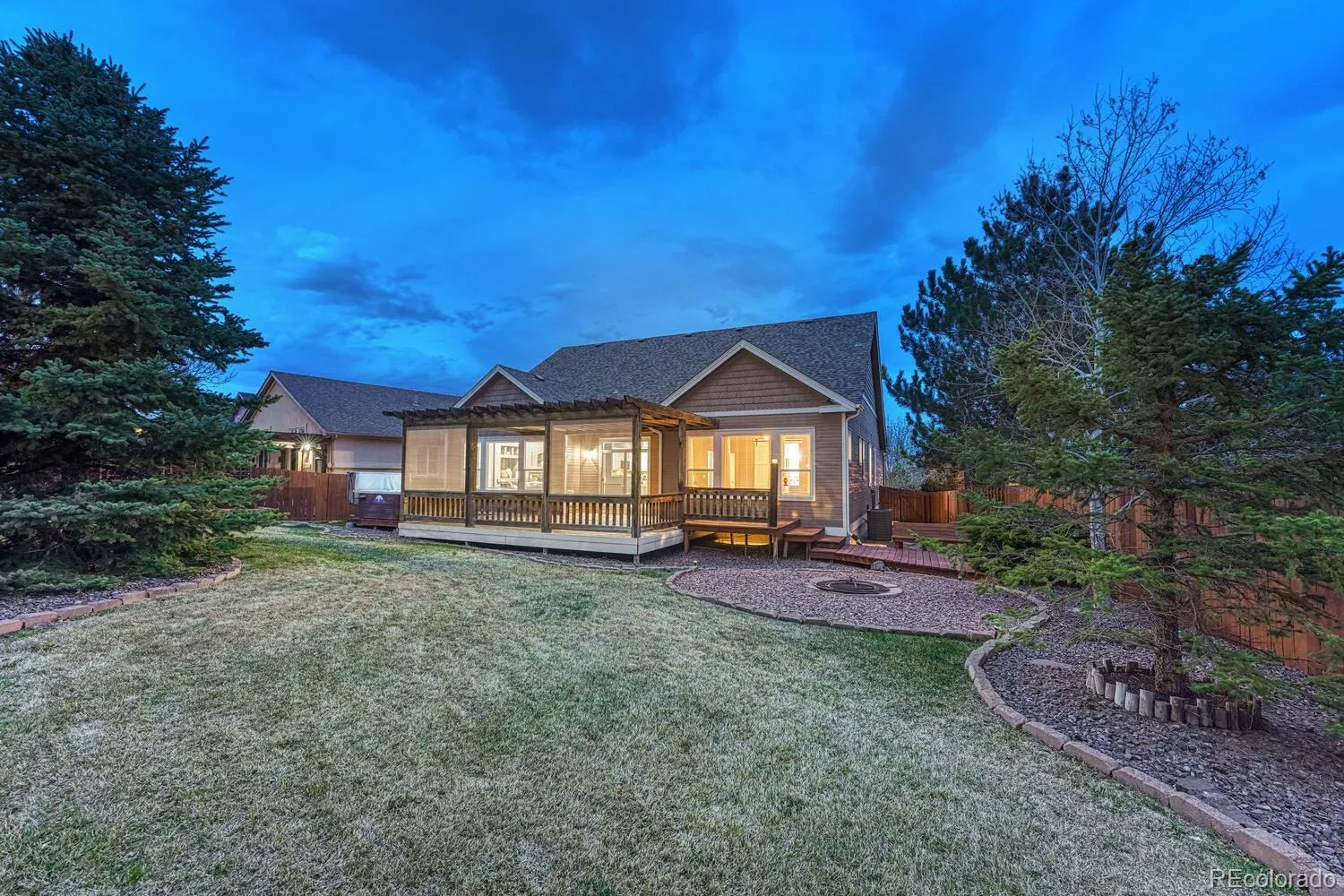 Stunning 5-bedroom, 3-bath ranch-style home located on a fully fenced 0.22-acre lot in the highly sought-after Meridian Ranch community. Designed with comfort and functionality, this home features a bright, open floor plan with abundant storage, perfect for both everyday living and entertaining. A charming covered front porch and keyless entry with a video doorbell create a warm and secure welcome. Inside, gorgeous wood-look tile flooring flows throughout most of the main level. There is central air for year-round comfort. The spacious Great Room is filled with natural light from a wall of windows and offers built-in niches, a gas fireplace, ceiling fan, and prewiring for surround sound. The kitchen is a chef’s delight, featuring a breakfast bar, pantry, white roll-out cabinetry, granite countertops, and a composite granite sink. A full suite of appliances includes a gas range with double ovens, microwave, dishwasher, and French door refrigerator. The adjoining dining area opens to a large deck with pergola, ideal for indoor-outdoor living. The private Primary Suite offers neutral carpet, a walk-in closet, ceiling fan, and a luxurious 5-piece bath with a dual sink vanity, soaking tub, and enclosed tiled shower. Main level Laundry. 2 addtl main-level bedrooms share a beautifully appointed full bath. The finished basement is an entertainer’s dream with a massive family room, game area (pool table included), & a kitchenette/wet bar with refrigerator, dishwasher, & microwave. Two more bedrooms share a full bath with bedroom access. A spacious craft/flex room completes the lower level. Step outside to your own backyard oasis with mature landscaping, auto sprinklers, a large wood deck, pergola, hot tub, fire pit, & dog run. A 3-car tandem garage adds convenience & storage. Enjoy nearby walking trails & access to the Meridian Ranch Rec Center, offering a pool, fitness center, & playground. This home truly has it all! MOVE-IN READY and waiting for you to call it home!