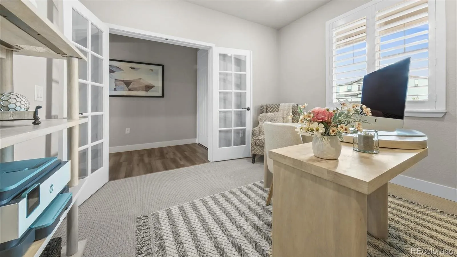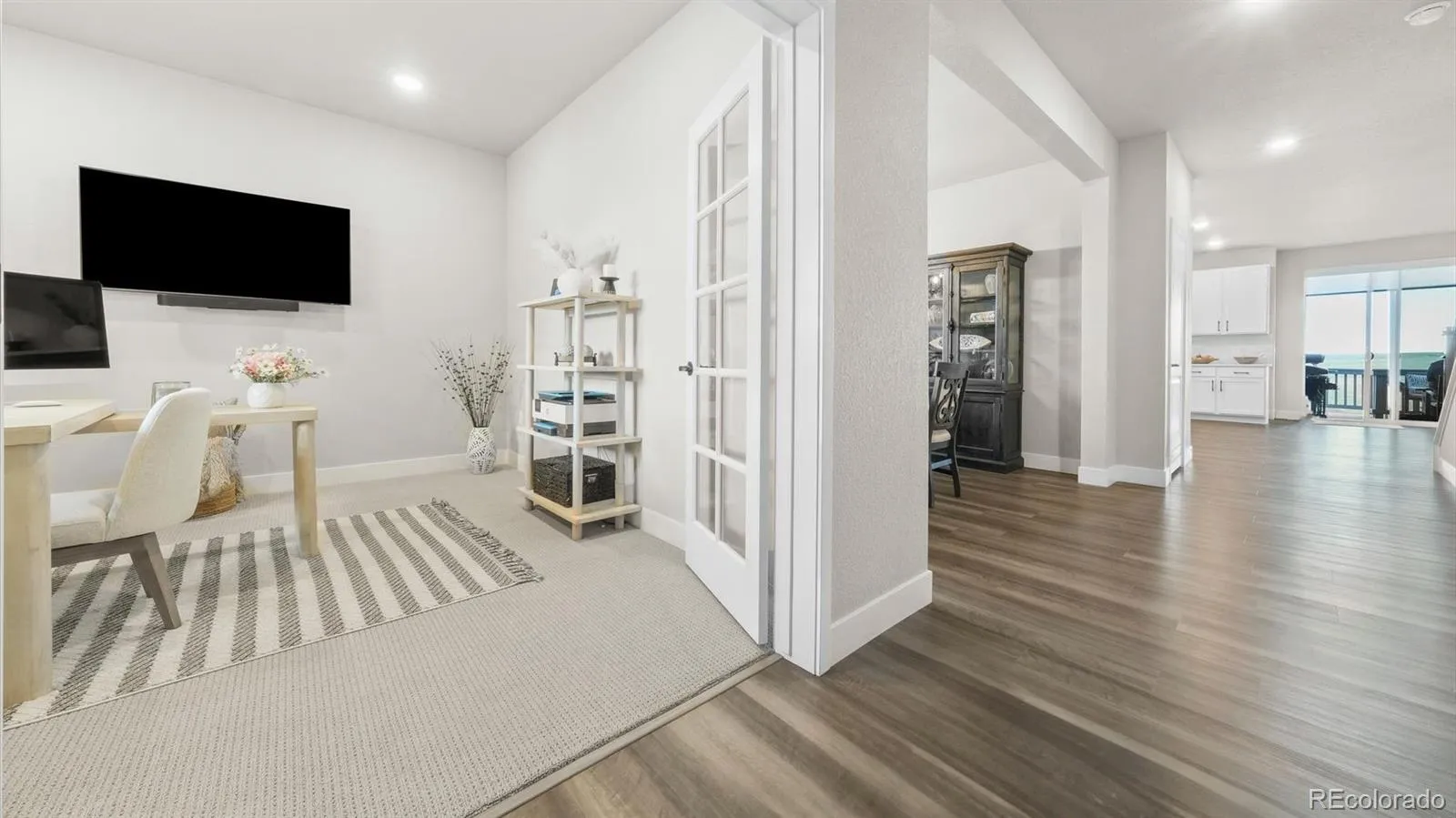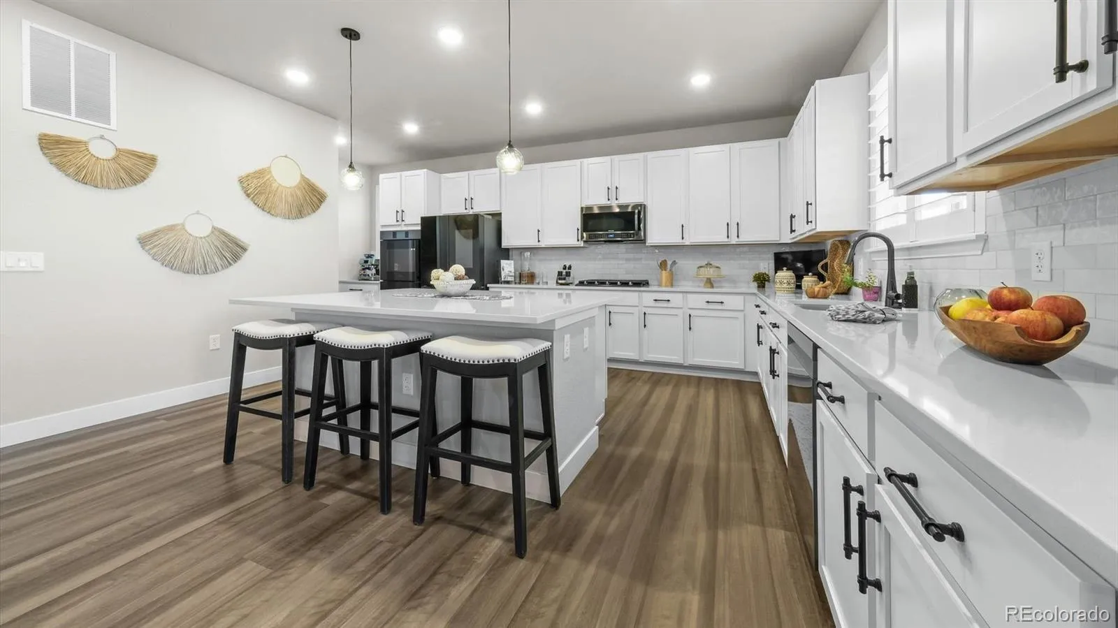 Enjoy plantation shutters throughout, LED lighting, and an open floor plan perfect for entertaining. The gourmet kitchen is a chef’s dream—featuring a large island with pendant lighting, high-end Samsung appliances, dual convection and steam ovens, 5-burner gas cooktop, and a butler’s pantry. A walk-out slider opens to a covered deck—the perfect spot to enjoy your morning coffee while watching the sunrise over the open space.