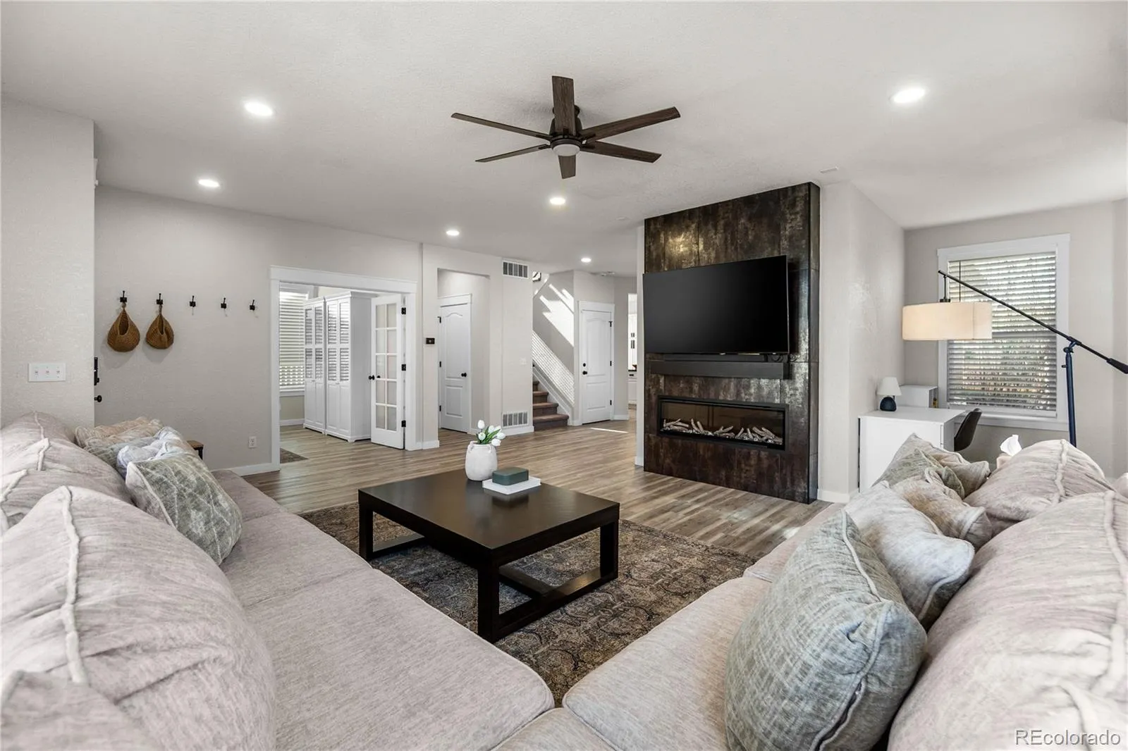 The living room flows seamlessly from the kitchen and showcases a custom dark tile accent wall with a sleek electronic fireplace, perfect for cozy nights or entertaining.