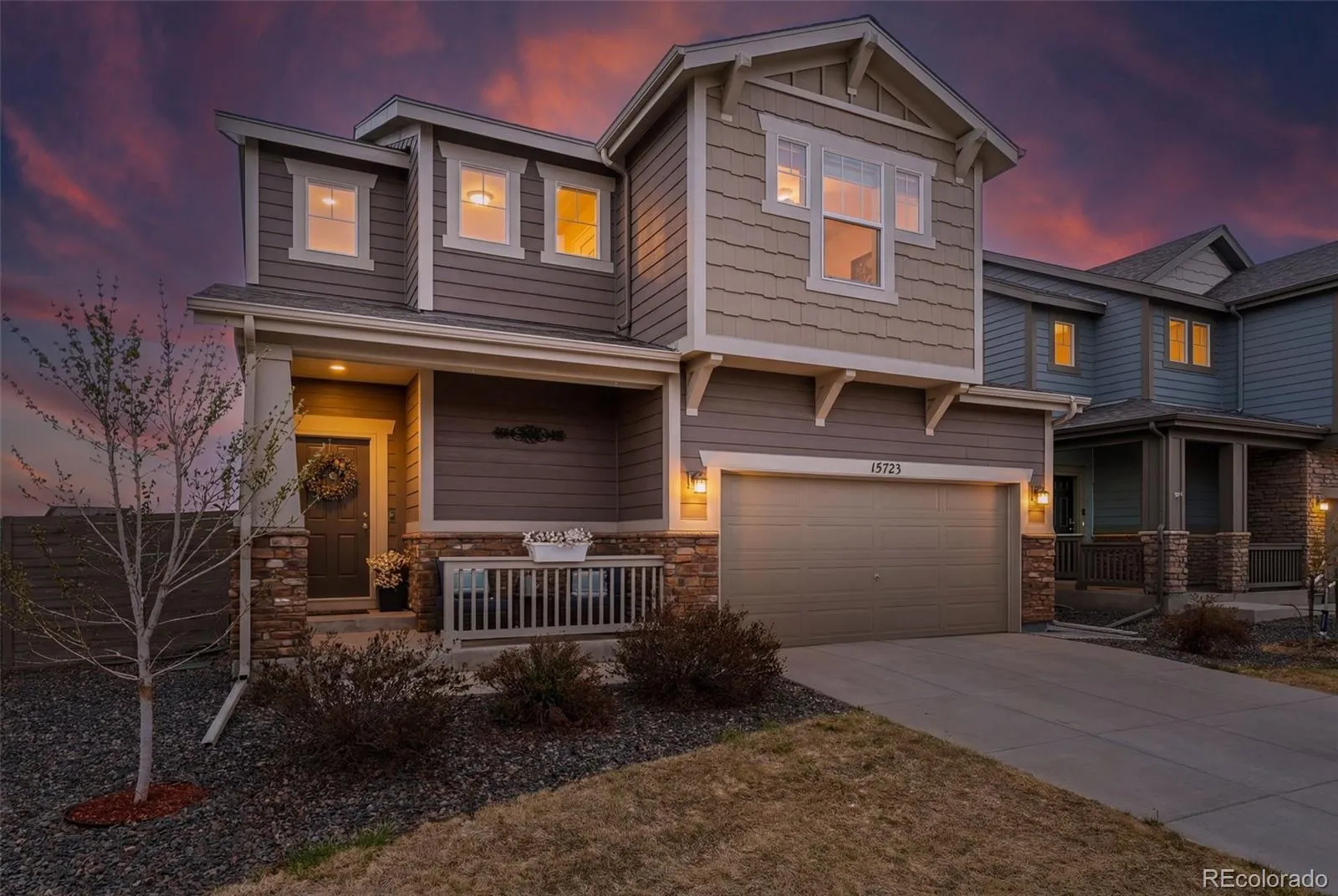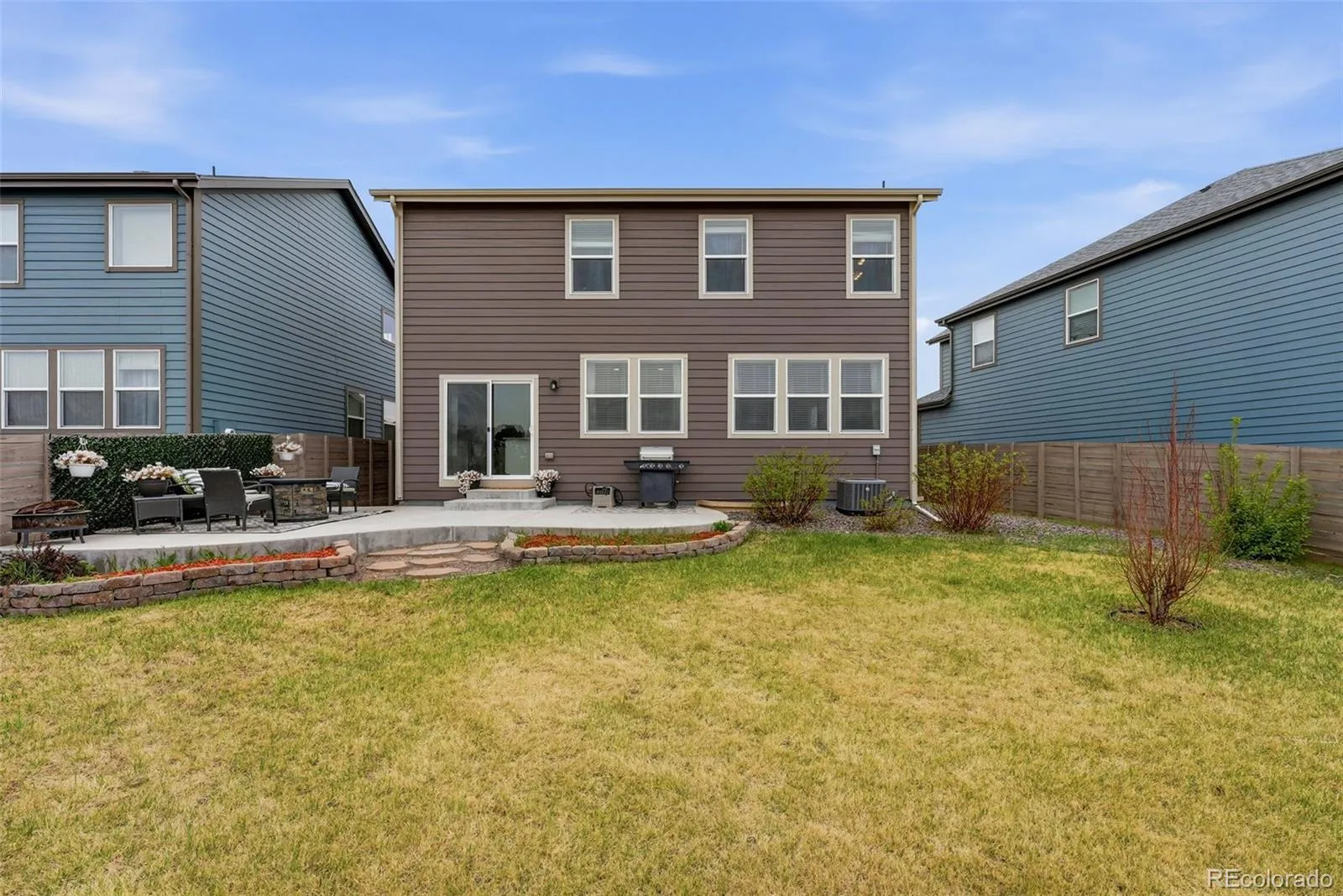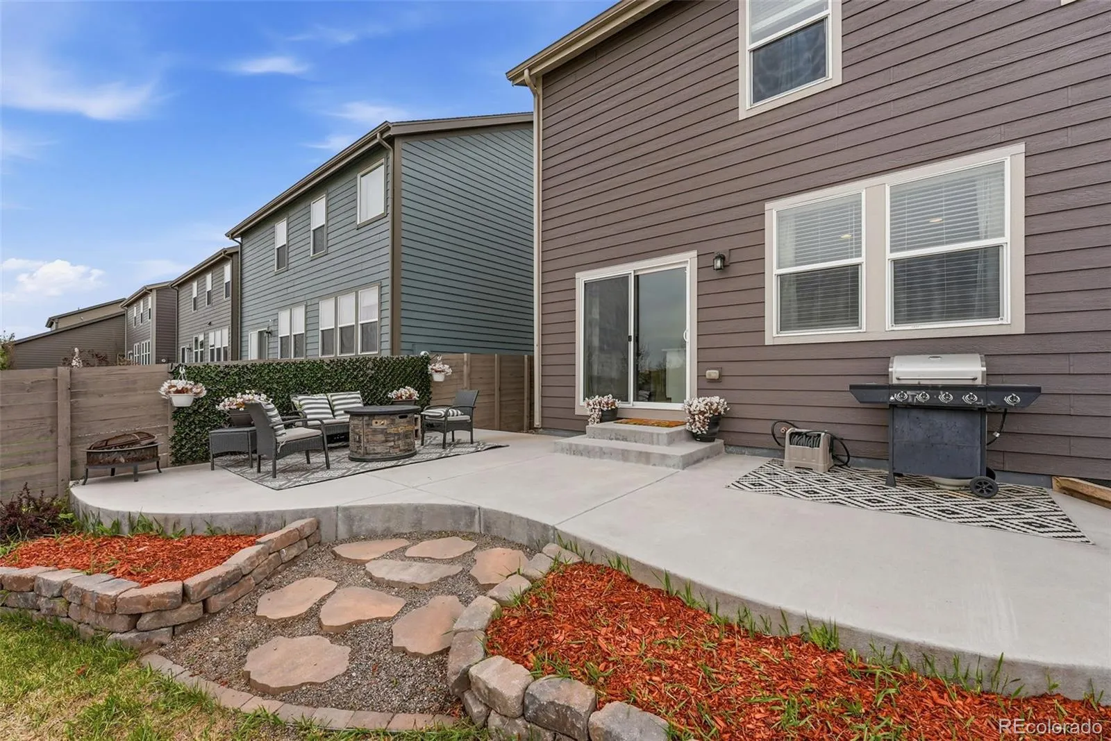 Exceptional two-story home in Green Valley Ranch featuring 3 bedrooms and 2.5 baths, offering a beautifully balanced and light-filled floor plan. The inviting foyer opens to a spacious living room and adjacent dining area, highlighted by high ceilings and abundant windows. The gourmet kitchen is a standout with white cabinetry, granite countertops, stainless steel appliances including a gas range, a large island, a generous pantry and easy access to the custom patio—perfect for entertaining. Upstairs, the spacious primary suite impresses with a coffered ceiling, dual sink vanity, oversized shower and a walk-in closet. Secondary bedrooms each include walk-in closets and the upper-level laundry room adds everyday convenience. Fresh interior paint and newer window coverings enhance the move-in ready appeal. The unfinished basement offers rough-in plumbing and room to expand. Enjoy outdoor living in the large, beautifully landscaped backyard with fence and sprinklers—an uncommon find in the area. Community amenities include access to The Hub recreation center with pool, parks, and playgrounds, all included through the annual property tax. Ideally located near DIA, shopping and more—this is a home you won’t want to miss!