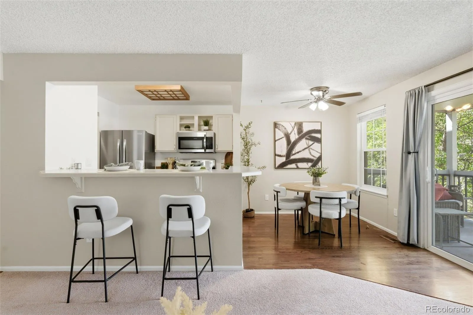 The open floor plan seamlessly connects the kitchen, breakfast nook, and cozy living room—complete with a charming wood-burning fireplace and sliding glass doors that lead to a covered balcony overlooking a peaceful greenbelt. The kitchen features brand-new stainless steel appliances, a high-top bar perfect for casual dining, and a spacious pantry.