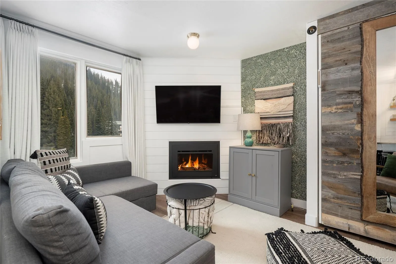 Completely reimagined with a mountain-contemporary aesthetic, this rare one-bedroom residence at the coveted Iron Horse offers a seamless blend of style, comfort, and exceptional ski-in/ski-out access. An amazing remodel has transformed the space into a light-filled retreat, anchored by an entirely refreshed kitchen featuring quartz countertops, newer stainless steel appliances, classic subway tile backsplash, designer lighting, and open wood shelving that enhances both function and visual warmth. The open floorplan allows natural light to pour in, creating a cheerful, welcoming atmosphere throughout. Thoughtful design details elevate every corner, including artful wallpaper accents, shiplap touches, and a brand-new bathroom finished with modern, high-quality materials.