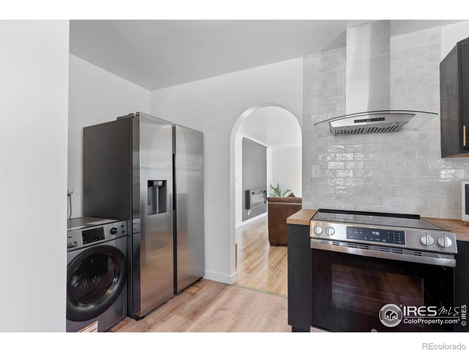 You’ll want to be first in line to see this beautifully remodeled mid-century modern home in the heart of downtown Loveland. This unique property offers a fully finished basement with kitchenette. The home has been thoughtfully remodeled throughout and boasts a sleek modern electric fireplace, hardwood floors on both levels, convenient in-unit laundry, and brand-new cabinets and appliances, complemented by a contemporary glass range hood. Step outside to an enormous backyard offering endless possibilities – perfect for a large garden, future ADU, or outdoor entertaining. The space is framed by mature trees, providing privacy, shade, and a peaceful setting.