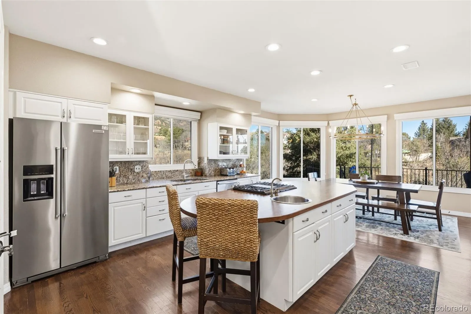 Perched at the Top of Skyway on a private half acre lot, this exceptional home captures some of the most breathtaking panoramic mountain and city views in Colorado Springs. Surrounded by mature trees and natural landscape, the setting offers rare privacy just minutes from the trails of Bear Creek Regional Park and Garden of the Gods. Designed to bring the outdoors in, expansive windows frame the Front Range and fill the home with natural light, while multiple outdoor living spaces, including an oversized Trex deck create the perfect backdrop for morning coffee or evening sunsets over the city lights. Inside, the home features a spacious and functional layout with many updates, beautiful wood flooring, new windows, new large Trex deck, generous living areas, and a thoughtfully designed kitchen ideal for both everyday living and entertaining. The walk out basement adds flexibility for guests, recreation, or multigenerational living. The flat, usable yard which is rare for this location, offers space to play, relax, or host gatherings, all while enjoying the peaceful surroundings of one of the most sought-after neighborhoods in the area. Combining privacy, views, and proximity to outdoor recreation, this is a unique opportunity to experience elevated Colorado living in the heart of Skyway and the Cheyenne Mountain School District 12.