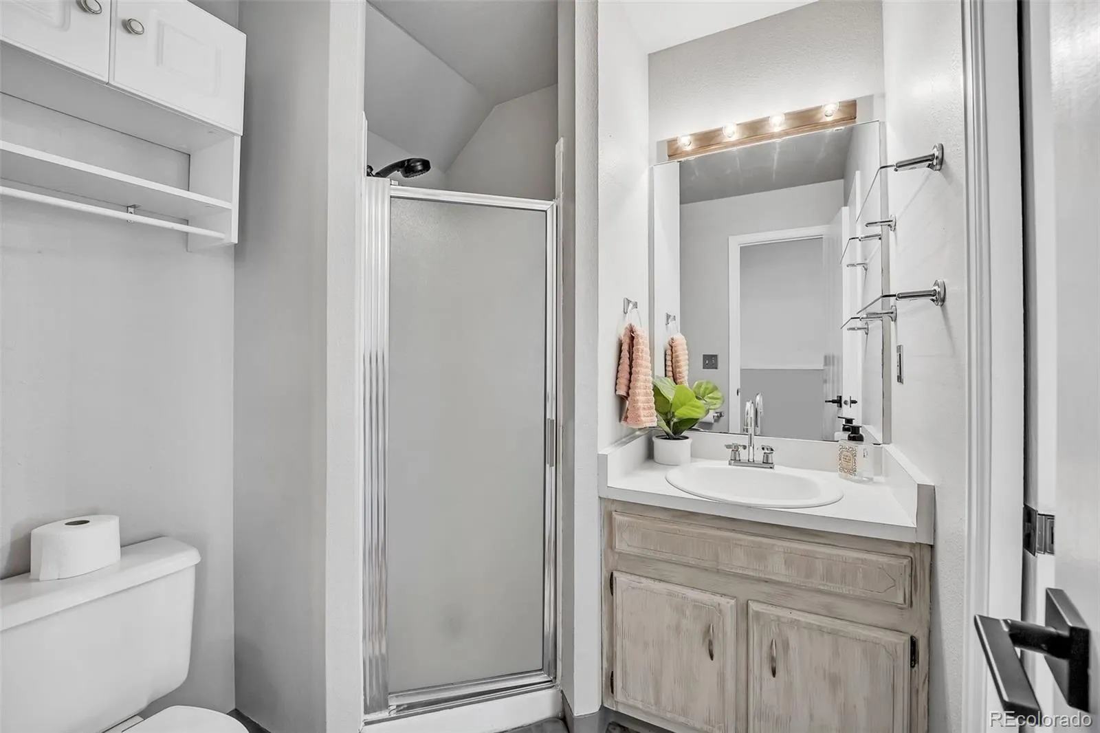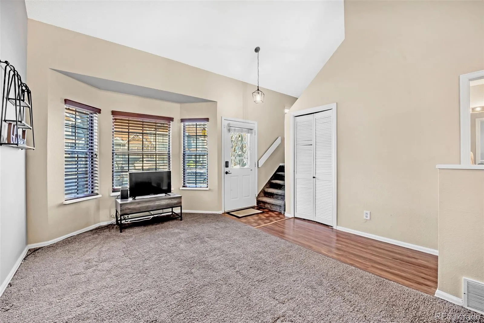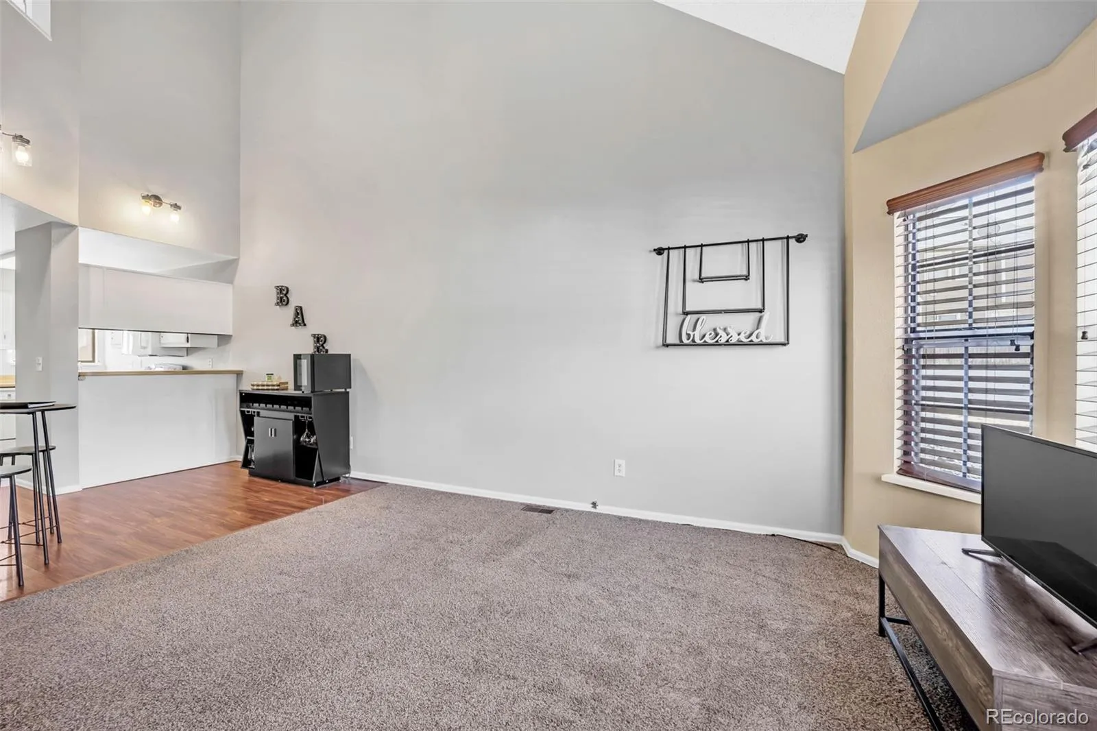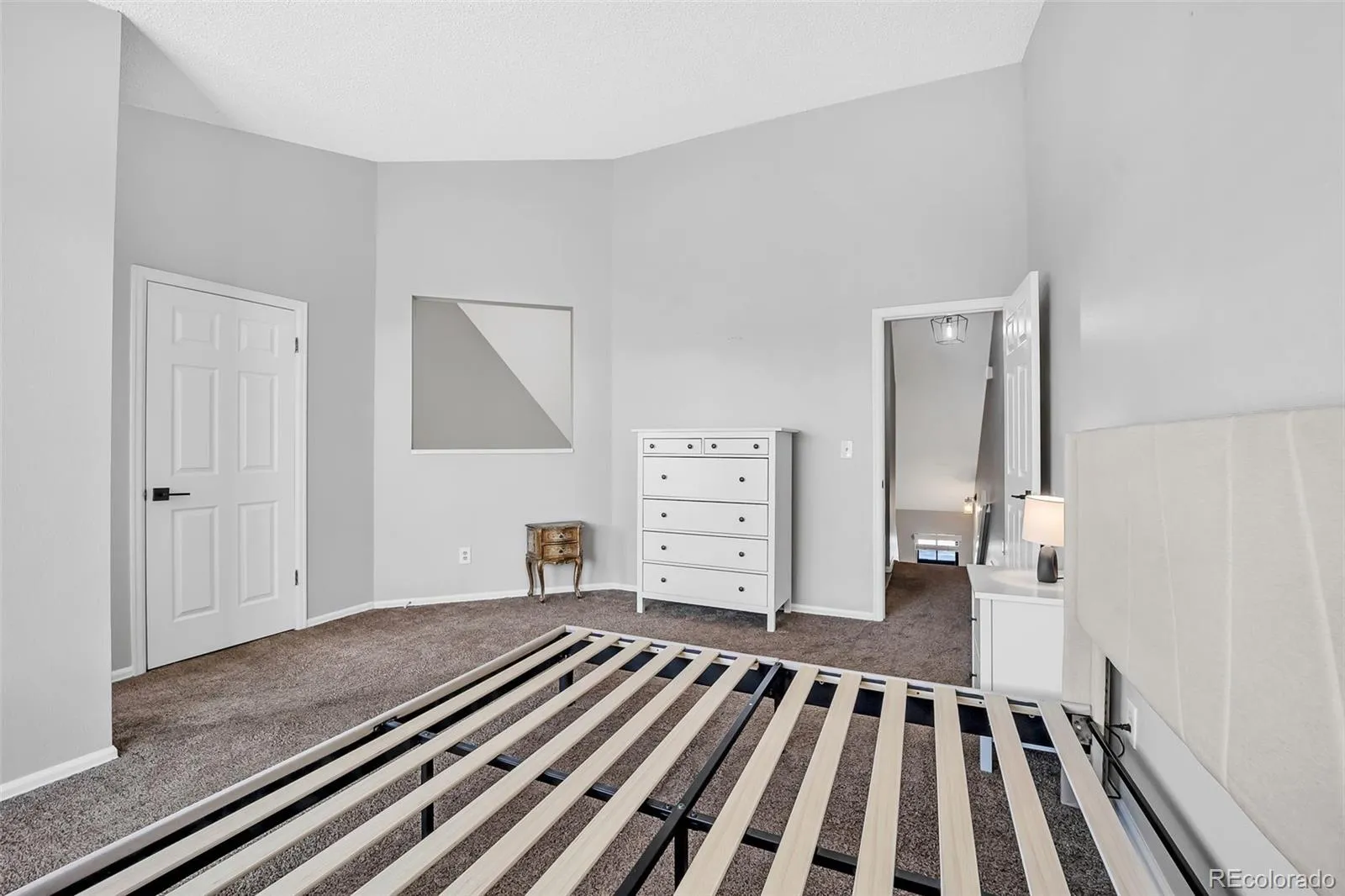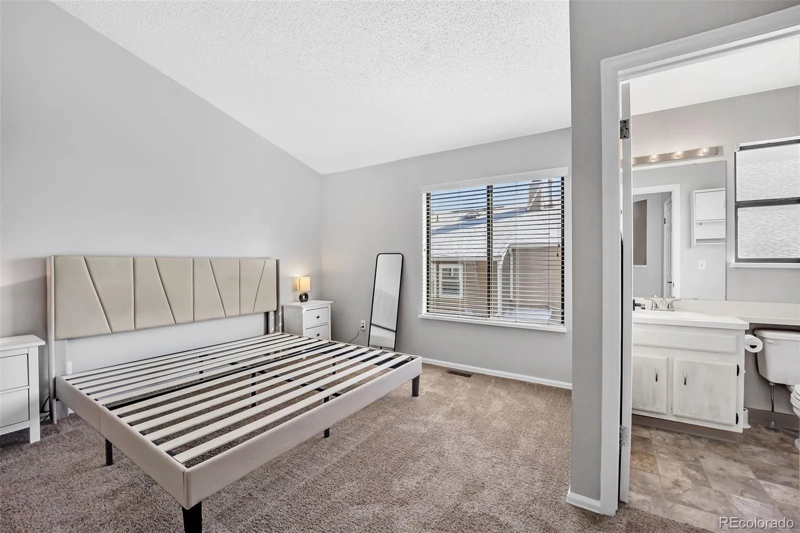 feels remarkably spacious thanks to its vaulted ceilings and large windows that fill the space with natural light. The primary