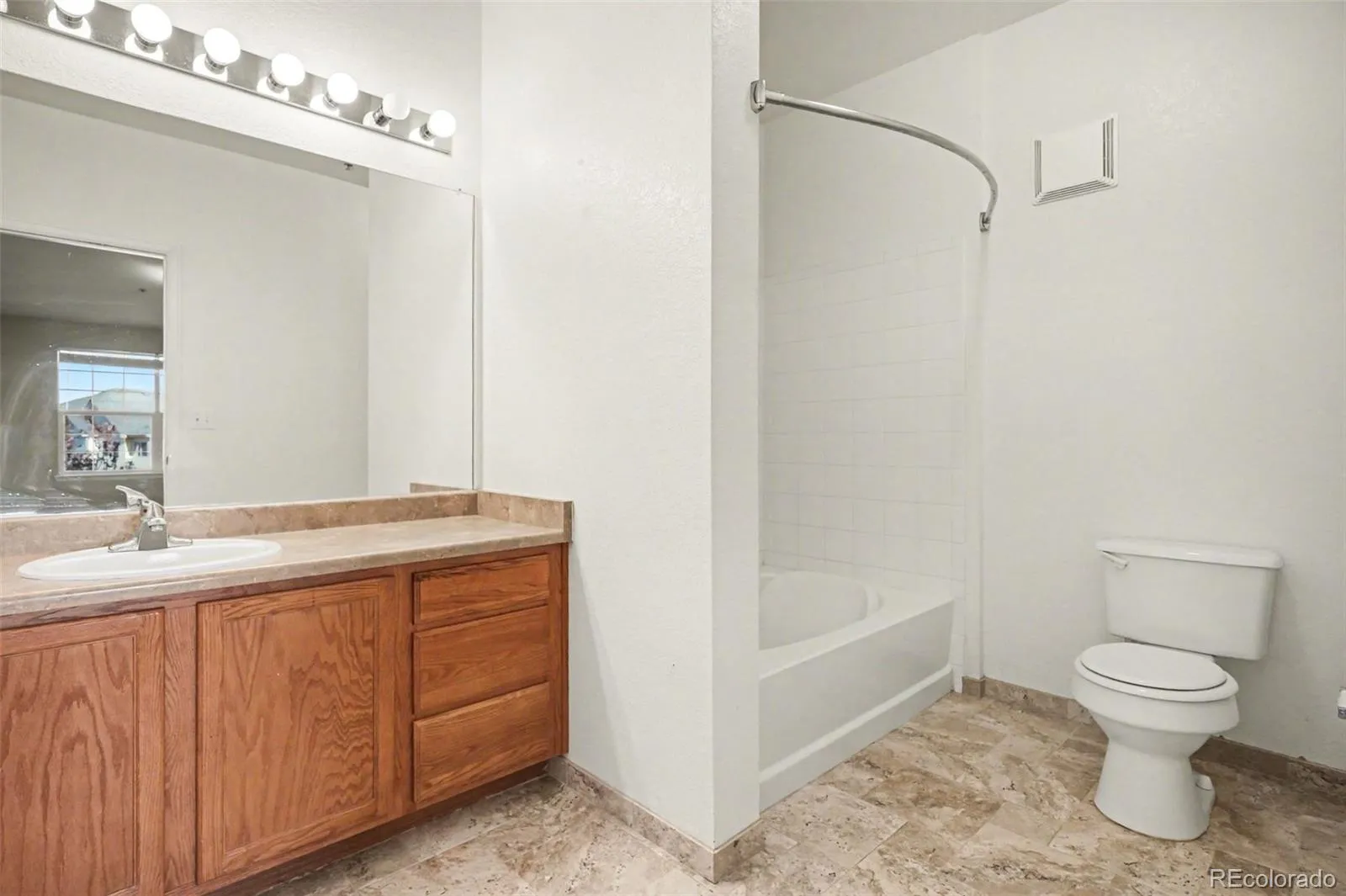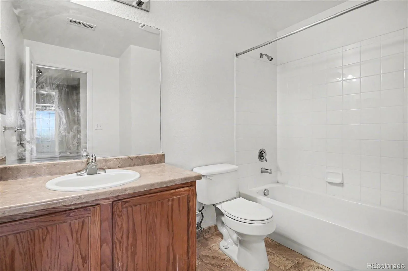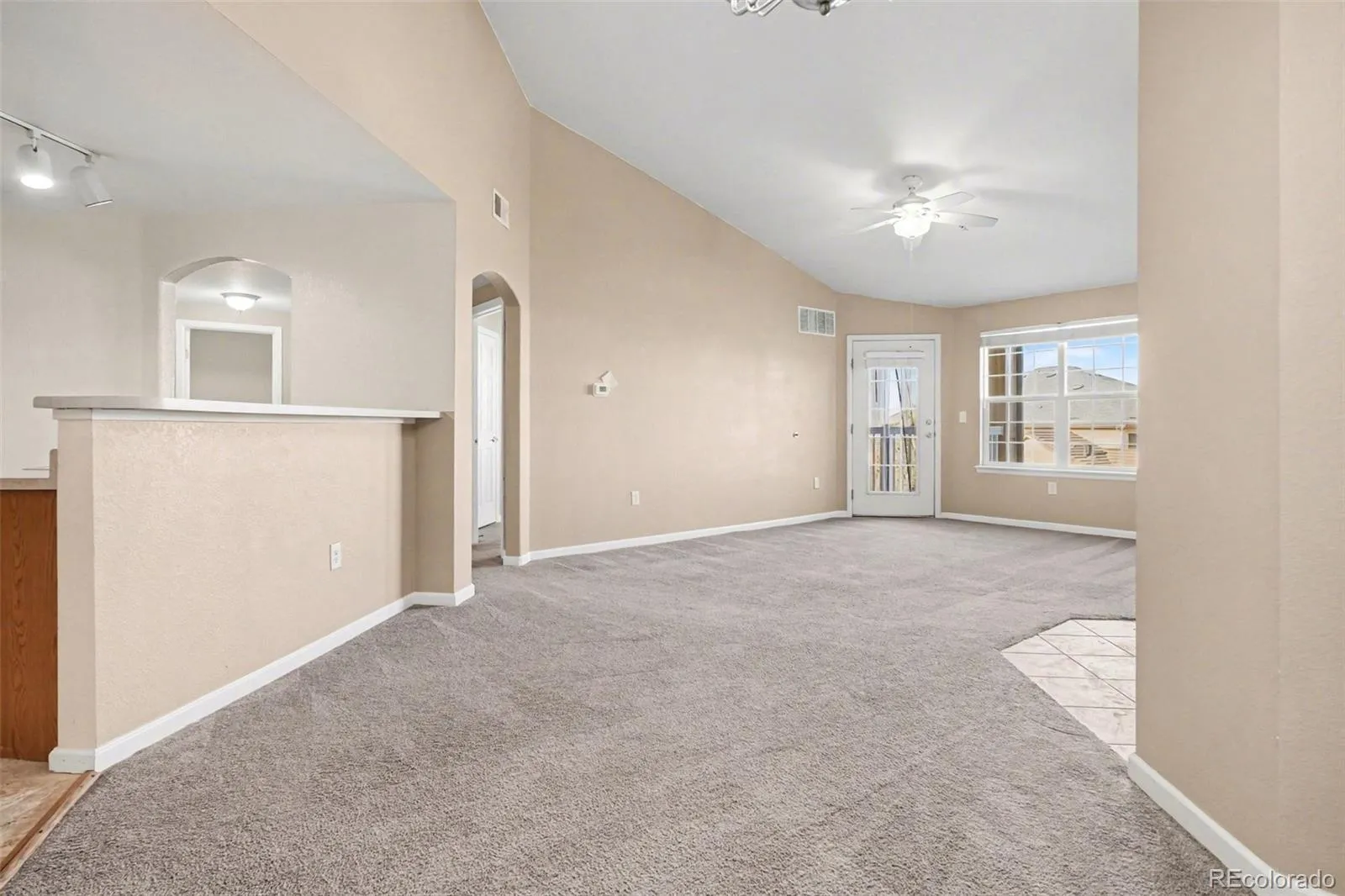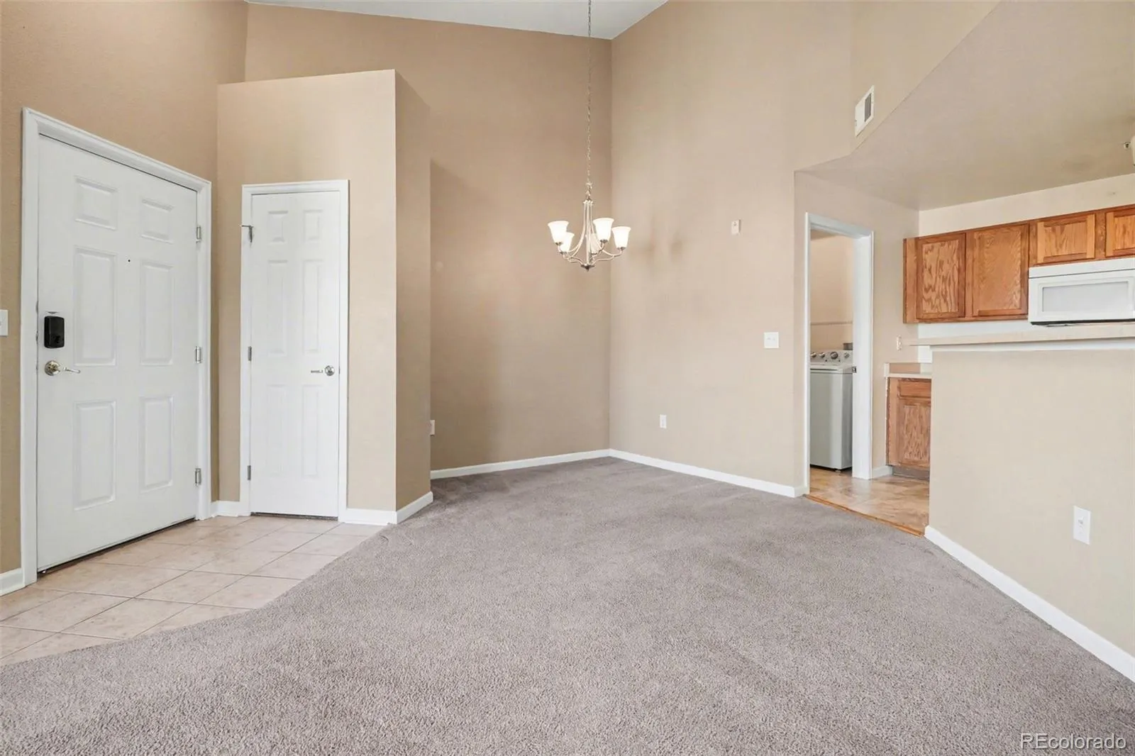Lock-and-leave living at its best. This updated 2-bed, 2-bath condo in First Creek Farm is minutes from Denver International Airport with easy access to E-470 and I-70. Inside, vaulted ceilings and an open floor plan connect the kitchen, dining, and living areas around a gas fireplace with tile surround. Both bedrooms are generously sized – the primary includes a walk-in closet and en-suite bath. In-unit laundry with a dedicated room adds everyday convenience. Step out to your private balcony with views of the Front Range. Brand new furnace and central air installed late 2025 mean years of worry-free comfort. The gated community features a clubhouse, fitness center, pool, and freshly paved private roads. Water, sewer, trash, and building insurance are all included in the HOA. Single-level layout with no stairs and a deeded carport for easy parking. All appliances included. Aurora Highlands P-8, Vista PEAK Preparatory.