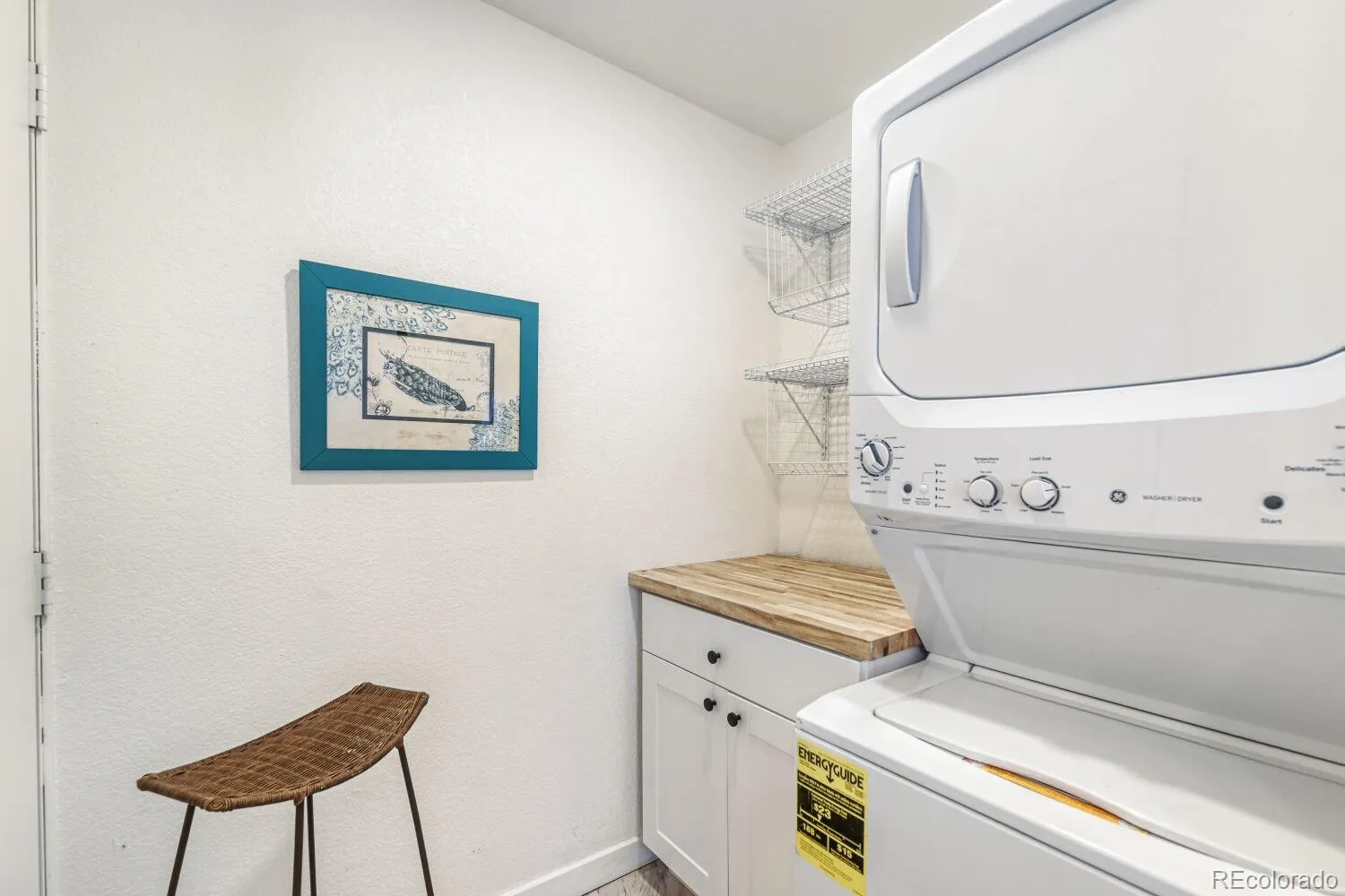 The spacious bedroom includes a cozy built-in window seat, a fully built-out walk-in closet with wrap-around hanging rods and custom shelving. The full bathroom offers a clean, spa-like feel with an oversized tub/shower combination. A dedicated laundry room provides added convenience, complete with a stacked washer and dryer, shelving, and additional cabinet storage.