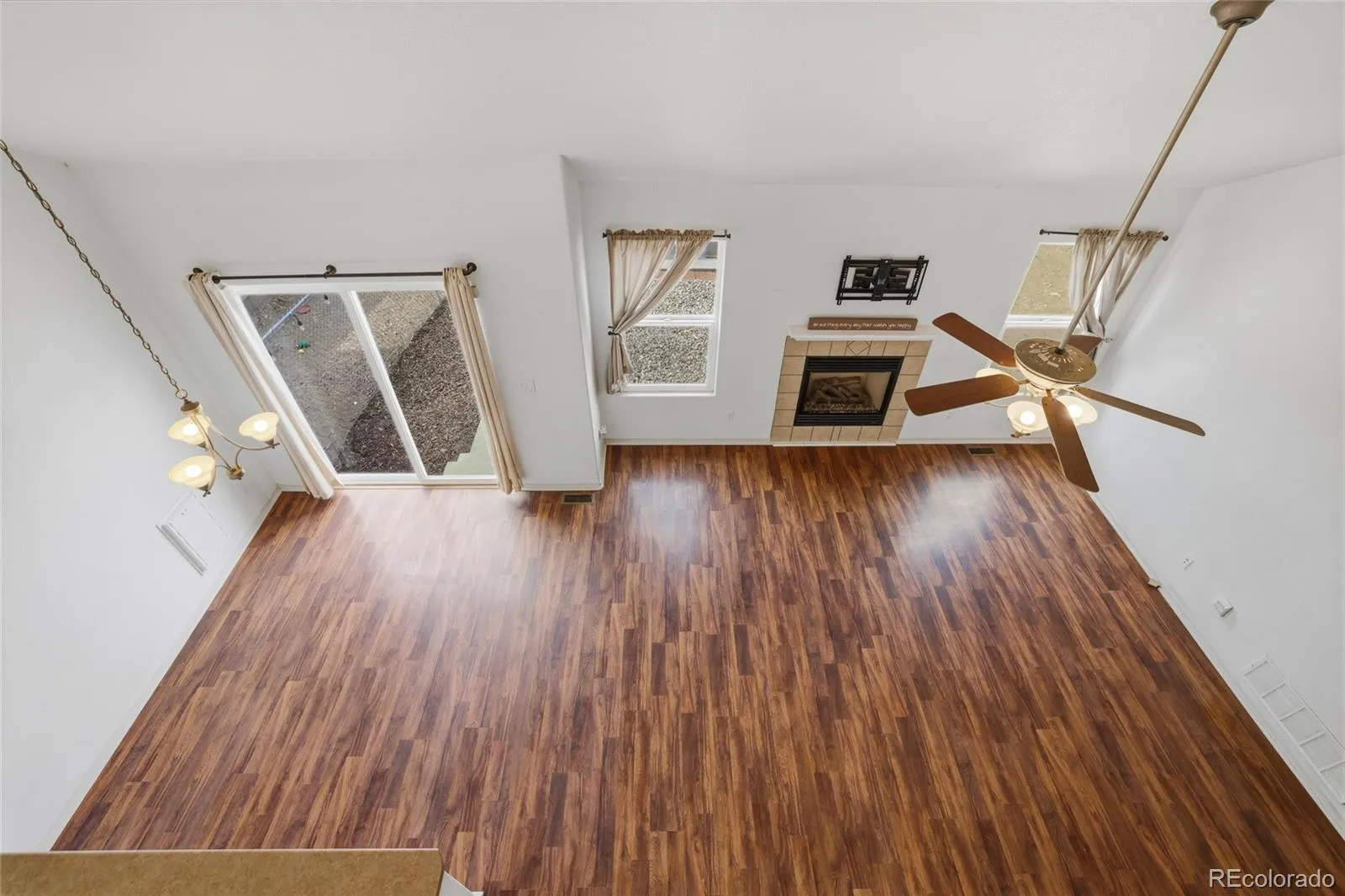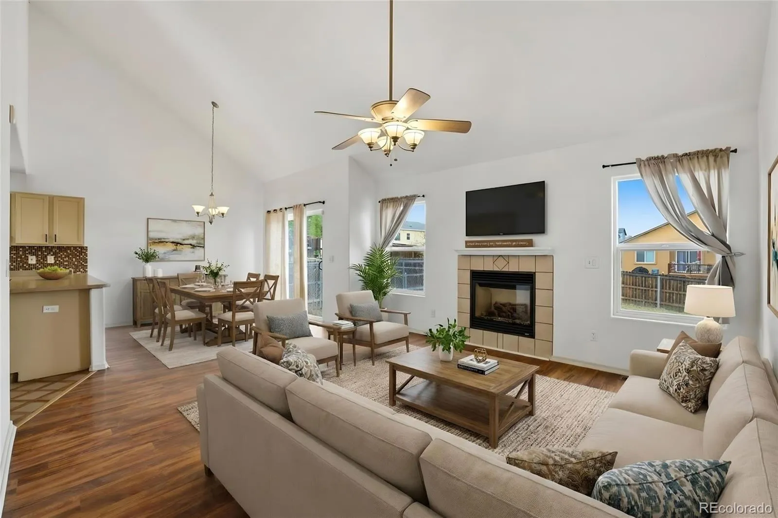 out to the backyard—perfect for indoor-outdoor living. The inviting living room features soaring vaulted ceilings and a cozy