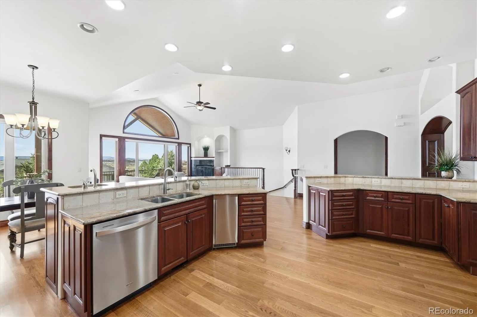 This custom ranch home on a quiet cul-de-sac in Painter’s Ridge is on 1/2 acre with mature pines and sweeping panoramic mountain views. Soaring vaulted ceilings, hardwood floors, grand great room with a gas fireplace that is framed by amazing Front Range views. Entertaining flows naturally from the formal dining room into a gourmet kitchen with stainless appliances, gas cooktop, granite countertops, pebble ice maker, beverage cooler, and island with a prep sink. A casual dining area opens to the back deck, with mountain views, and a covered outdoor living space. The primary suite has a gas fireplace, French doors that open to the deck, and endless views, spa-inspired 5-piece ensuite bathroom with heated floors, a walk-in closet with built-in vanity. A second primary bedroom offers its own walk-in closet, full en-suite bath, and private deck access. A dedicated home office with French doors and custom built-ins completes the main level. The oversized laundry room has a dog wash, cabinets, laundry sink, and room to fold laundry. rounds out a main floor designed for real, elevated everyday life. Take the custom elevator, main staircase, or back staircase to the lower level, where there is a large family room and game room, joined by 3 additional bedrooms, 2 baths. The 5th bedroom could also be a bonus room, craft room, or flex space. Outdoor living feels like a private retreat. The 3-car garage has epoxy floors, a mud sink with hot and cold water, storage, and a staircase to the basement add the finishing touch for those who appreciate both practicality and function. 1356 Fox Hollow Place has luxury, comfort, and the beauty of Castle Rock. Located just off Crystal Valley Parkway, close to I-25. Easy commute to Denver or Colorado Springs.