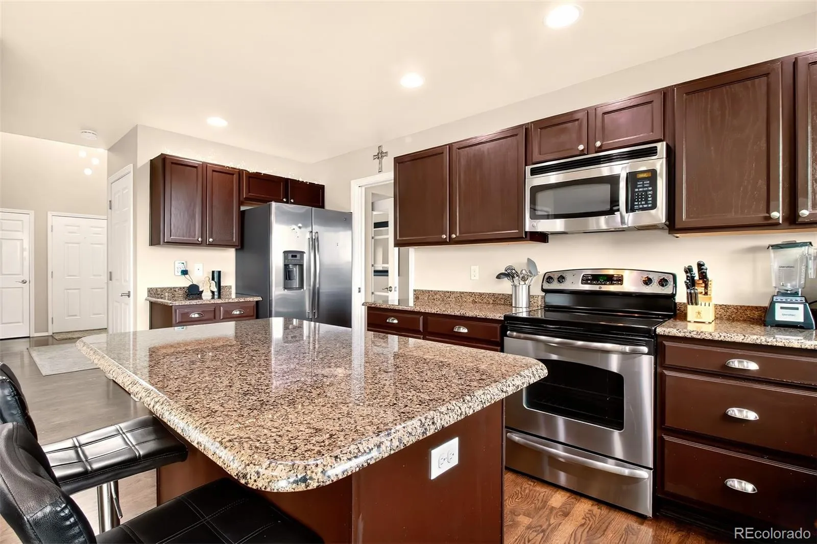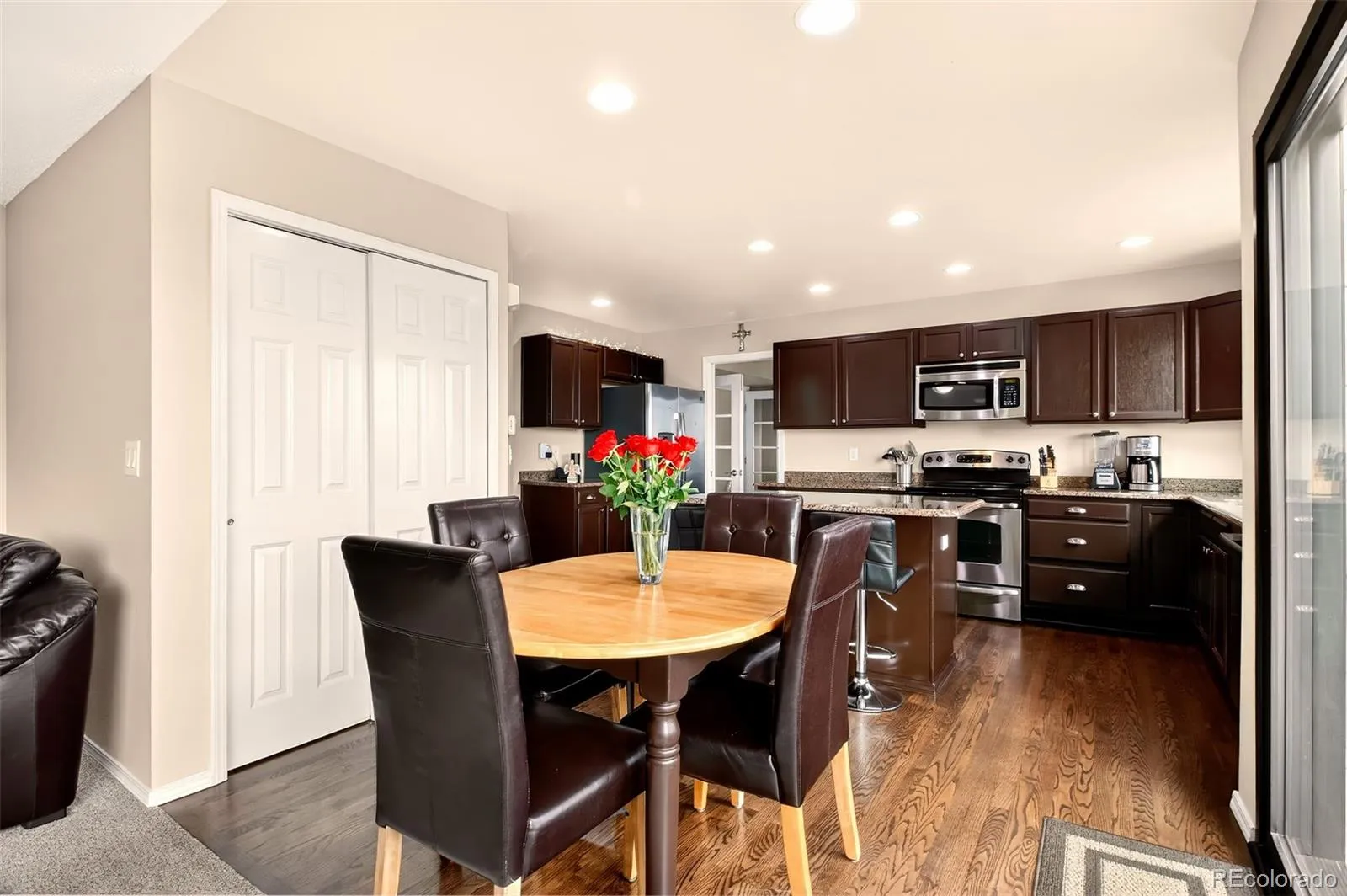 Perfectly positioned in the desirable Summerfield community, this exceptional 5-bedroom, 4-bath residence was extensively remodeled in 2025, blending refined finishes with Colorado’s natural beauty. From the moment you enter, the home impresses with pristine carpet, wood flooring through the entry & kitchen, & thoughtful updates, including new Pella windows, and a nine foot multi-slide door installed in 2025 that frames the spectacular scenery beyond. The home is designed for both entertaining & comfortable everyday living. A formal dining room provides a welcoming space for gatherings, while the expansive walkout basement offers a stylish retreat complete with a wet bar & included TV stereo system, ideal for hosting friends or relaxing evenings at home. The vaulted primary suite is a true sanctuary, featuring double doors, sweeping Pikes Peak views, and a spacious spa-inspired bathroom with heated tile. A basement bathroom also features heated tile, adding comfort for guests & family alike. Outdoor living is simply extraordinary. The elevated deck, complete with a built-in speaker system & RainEscape drainage system, captures breathtaking views of the city and John Venezia Open Space. Below, a covered patio opens to a beautifully curated backyard featuring stamped concrete, low-voltage lighting along the deck steps and firepit area, & lighted aspens, maples, & a Honeycrisp apple tree. Evenings come alive around the gas firepit, creating a perfect setting for gathering under the Colorado sky. Additional highlights include a garage with coated flooring, built-in cabinetry, and overhead storage racks, as well as concealed sheds with dedicated bike storage. Backing to open space with nearby trails, the property offers a rare combination of privacy, views, and accessibility. Conveniently located near schools, parks, grocery stores, hiking trails, & medical facilities, this home delivers quiet serenity while remaining close to everything Colorado Springs has to offer.