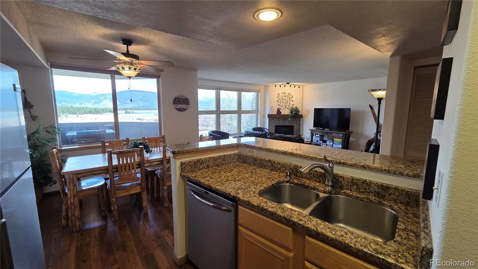 If you are looking for a lake view, this is the 2 bedroom, 2 bath condo for you! Enormous views of Lake Dillon with the Continental Divide beyond greet you from every living area window. Relax on the open air deck watching the hummingbirds with a lake and mountain back drop. Feel the stress melt away as the quiet settles in and the sun fades away. This can be your reality. But wait, there’s more! Adventure awaits right outside the door. Pick up the paved rec path and enjoy bike rides around the lake or across the county. Easily roll the kayaks to the water’s edge for a fun paddle. Soak your muscles in the community hot tub at the end of the day. A great selection of restaurants are nearby or easily prepare meals in style in this fully equipped kitchen. Cozy up in front of the gas fireplace and take in every bit of mountain ambiance. There’s plenty of room for everyone too! A king sized bed fits easily in the primary bedroom and double sinks in the ensuite bath add to the convenience. The guest bedroom has bunks & a trundle to sleep the rest of the crew. A detached garage plus an extra storage closet provide plenty of space for everyone’s recreation gear! With a proven track record of 30+ day and short term rentals, generating income is a great option. Summer rentals already booked with approx $9k in income for the new owner. It’s so much easier to live your best life when you own this fantastic condo!