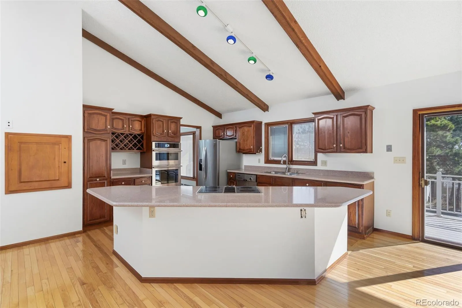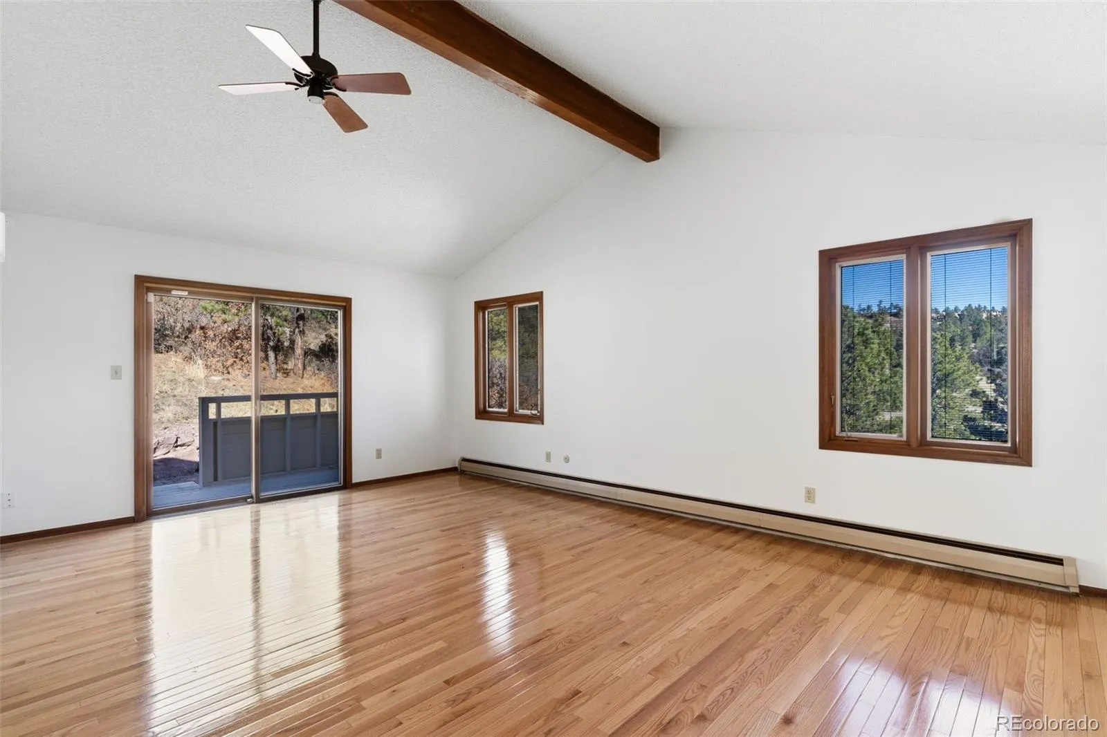 Almost 1 Acre in Town! 5 bedroom, 3.5 bath custom passive solar custom home! This house has tons of hardwood and new flooring! Large wrap around deck overlooks the city and beautiful natural scape! This house was built for entertaining with large great room with soaring ceilings, huge gourmet kitchen with quartz counter tops, wood floors, eat in area and connects with family room featuring a wood burning fireplace and walks out to wrap around deck. Formal Dining room has tall ceilings with city views, formal living room boasts a gorgeous masonry fireplace mantle, tall ceilings, and wood floors! Upper level has 3 bedrooms including the master bedroom suite with vaulted ceilings, private walk out patio, huge master bath with jetted tub and separate shower and walk in closet with built in shelving. 2 additional bedrooms are spacious, have wood flooring and share a full bathroom. Lower level has a full size laundry room with gas hookups and huge guest room that has wall to wall closet space! Could be converted to a dream office or hobby room! Walk out basement offers a huge rec room with walk out door, wet bar and wood fireplace! 5th bedroom is in the basement and has a 3/4 bath to make a perfect guest area! The garage is extra deep (38 feet) and has a full built in workshop with electricity and additional storage about the workshop! Could be converted to a 4 car tandem garage! This home has a lot of extras including a brand energy efficient boiler system, hot water heater, dumb waiter elevator from the garage to the kitchen, new interior paint, wall mounted air conditioner, 3 fireplaces, wrap around driveway, newer updated kitchen appliances, composite decking, and lots more! Close to I-25 and USAFA, district 20 schools, tons of trees and rock formations and extensive rock scaping around the house. Wild life and quiet all around!