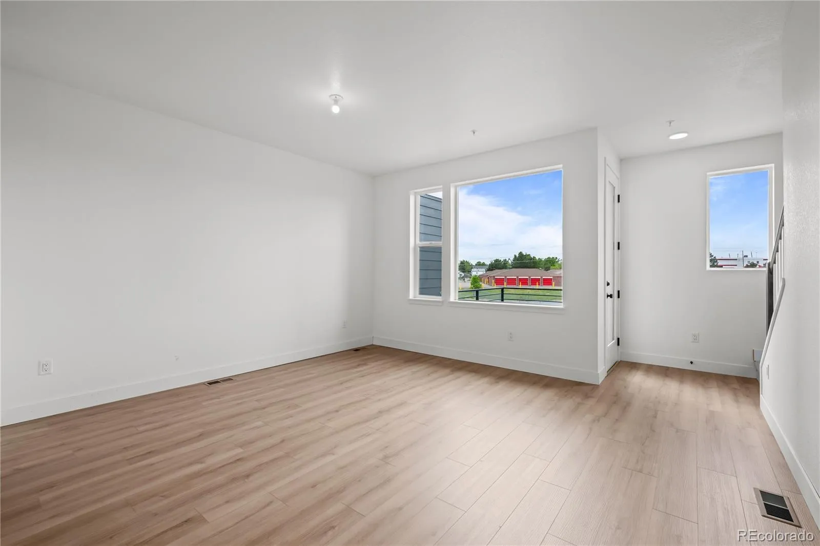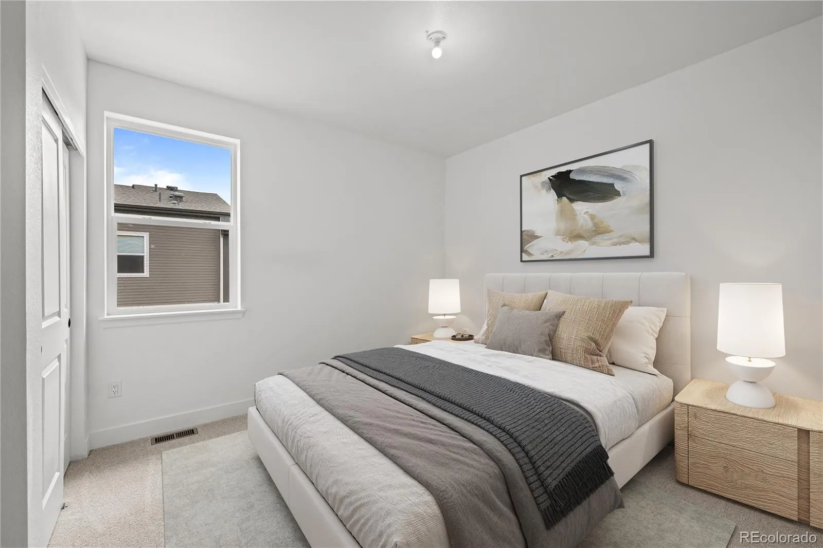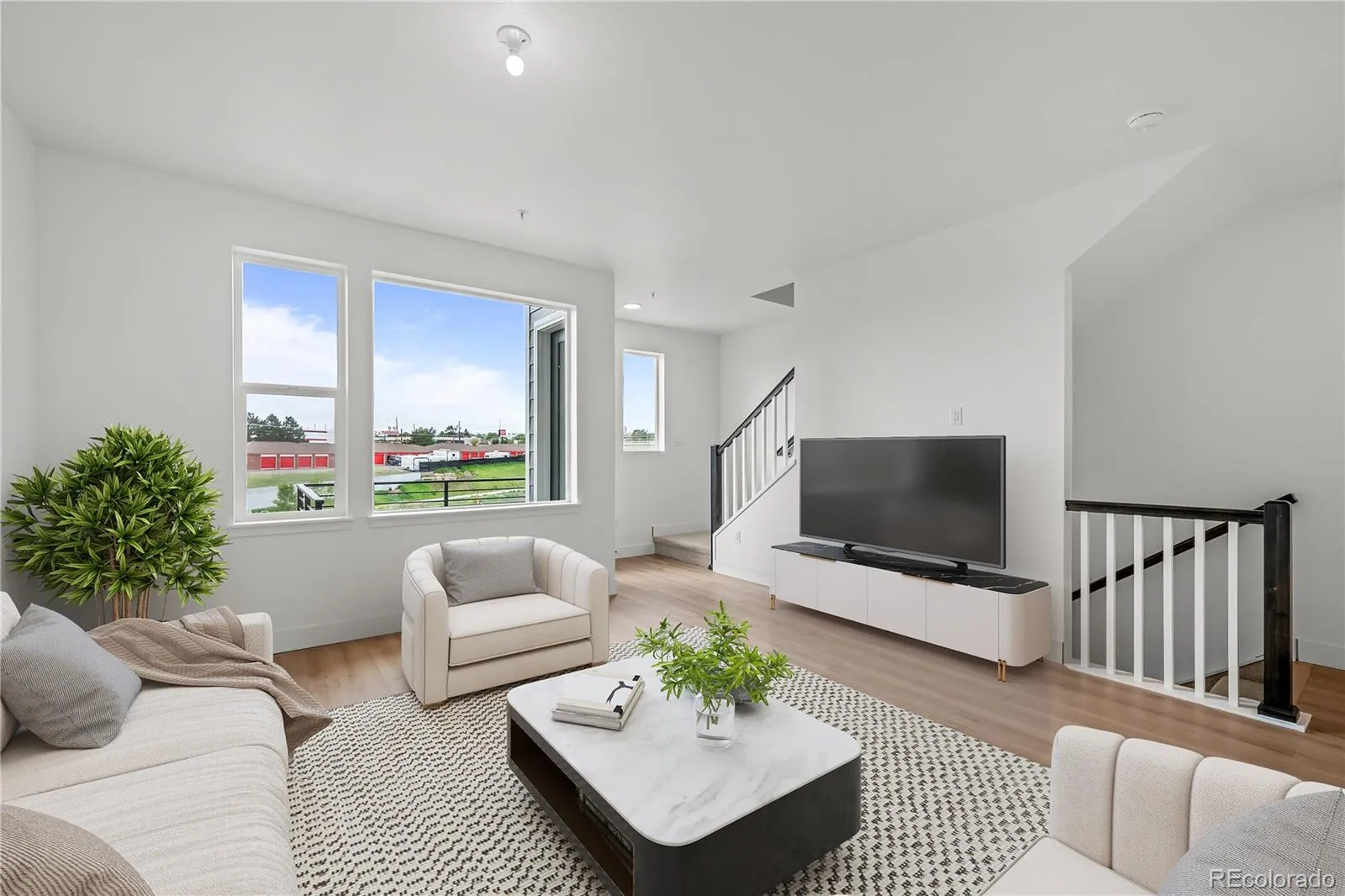This South facing townhome is fully upgraded and move-in ready, offering designer finishes and exceptional natural light from numerous oversized windows and tall ceilings throughout. Enter from your private 2-car garage or charming front porch into a thoughtfully designed lower level with a bonus room. This bonus room is perfect as a non-conforming 3rd bedroom, workout room, home office, home library, or extra storage! The open-concept main level features 9’ ceilings, an expansive living and dining area, and a beautifully upgraded kitchen with Biscotti Maplecrest cabinetry, Denali quartz countertops, ceiling-height backsplash, and upgraded Whirlpool appliances. Step onto your South-facing balcony with peek-a-boo mountain AND city skyline views. A great space for morning coffee, container gardening, or relaxing evenings. Upstairs, two generously sized bedrooms each offer luxury baths and large closets. The primary suite showcases a frameless Euro shower and elevated designer finishes including ceiling-height tile, while the secondary bedroom includes a tub/shower combo with coordinating upgrades. A conveniently located upper-level laundry room adds everyday ease. High-end upgrades include Oak WPC flooring throughout, upgraded plumbing and lighting fixtures, custom tile details, and included refrigerator and washer/dryer. Enjoy low-maintenance living with HOA-covered exterior upkeep, snow removal, and courtyard landscaping, giving you more time to explore nearby trails, parks, coffee shops, and fitness studios. Located minutes from US-36, the Westminster Light Rail station, and the Denver-Boulder corridor, this home delivers style, connectivity, and convenience in one of the area’s most accessible communities. Ask about current builder incentives, including a 4.99% 30-YEAR FIXED RATE through the preferred lender and lease buyout options.