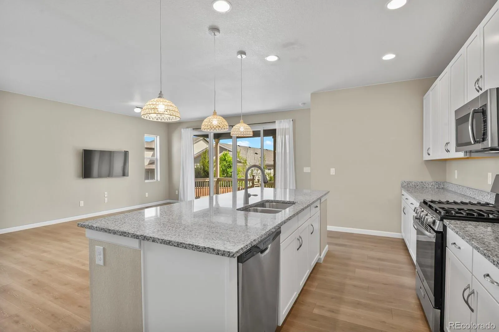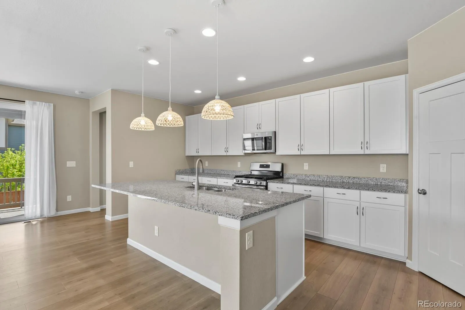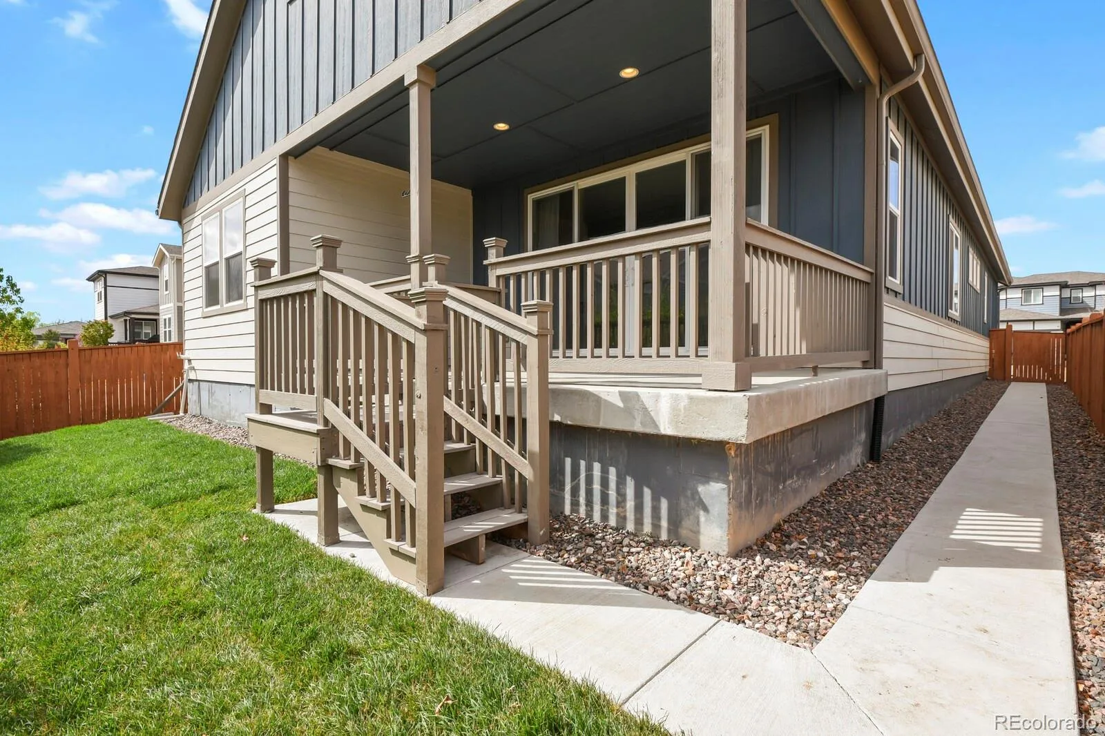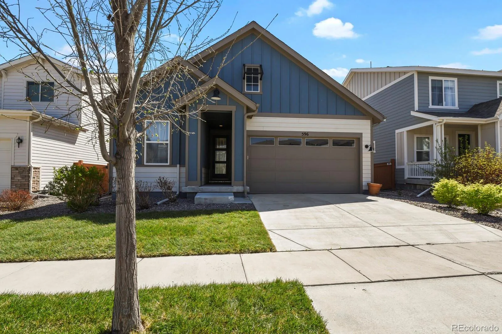 Warm, sunny, and filled with natural light, this beautifully designed open-concept ranch offers comfortable main-level living with thoughtful upgrades throughout. Featuring 9-foot ceilings and expansive windows, the home is highlighted by a stunning 12-foot sliding glass door that opens to a spacious covered deck—perfect for relaxing or entertaining. The kitchen is both stylish and highly functional, offering slab granite countertops, abundant counter space, ample cabinetry for storage, and a corner pantry. Stainless appliances and gas range complete the space, making it ideal for everyday living and hosting. A coffered ceiling welcomes you at the foyer, adding an elegant touch upon entry. The flexible floor plan includes a generous office with French doors, ideal for working from home. The primary suite features a walk-in shower and double vanity for added comfort and convenience. The laundry room is pre-plumbed for a utility sink, and a front-loading washer and dryer are included, along with a mounted TV in the living room. Additional highlights include an extended 2-car garage with a 4-foot extension, spacious covered private deck, and lush new landscaping. Enjoy the nearby community park and playground, along with easy access to I-25,making commuting and daily errands a breeze. This home truly combines style, function, and location!