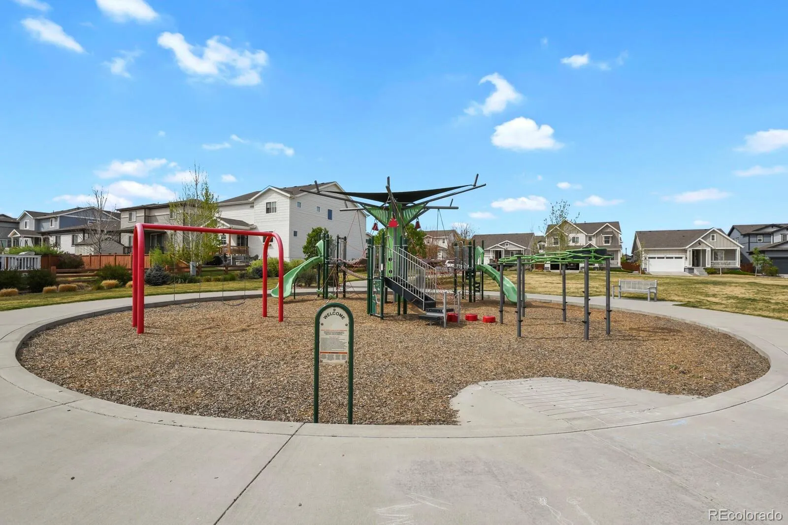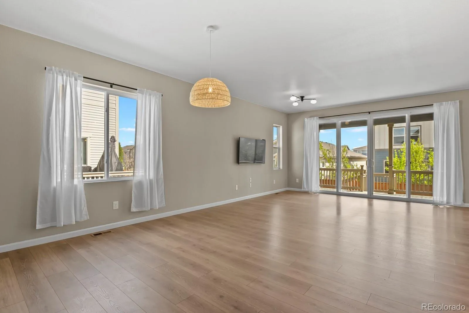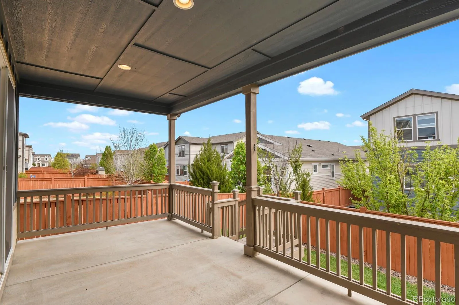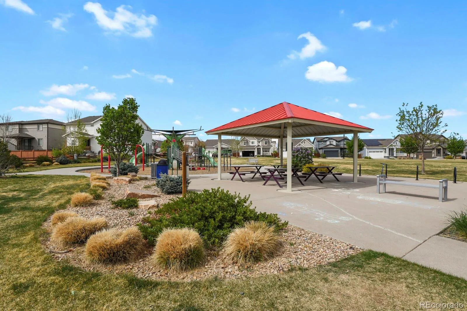 Warm, sunny, and filled with natural light, this beautifully designed open-concept ranch offers comfortable main-level living with thoughtful upgrades throughout. Featuring 9-foot ceilings and expansive windows, the home is highlighted by a stunning 12-foot sliding glass door that opens to a spacious covered deck—perfect for relaxing or entertaining. The kitchen is both stylish and highly functional, offering slab granite countertops, abundant counter space, ample cabinetry for storage, and a corner pantry. Stainless appliances and gas range complete the space, making it ideal for everyday living and hosting. A coffered ceiling welcomes you at the foyer, adding an elegant touch upon entry. The flexible floor plan includes a generous office with French doors, ideal for working from home. The primary suite features a walk-in shower and double vanity for added comfort and convenience. The laundry room is pre-plumbed for a utility sink, and a front-loading washer and dryer are included, along with a mounted TV in the living room. Additional highlights include an extended 2-car garage with a 4-foot extension, spacious covered private deck, and lush new landscaping. Enjoy the nearby community park and playground, along with easy access to I-25,making commuting and daily errands a breeze. This home truly combines style, function, and location!