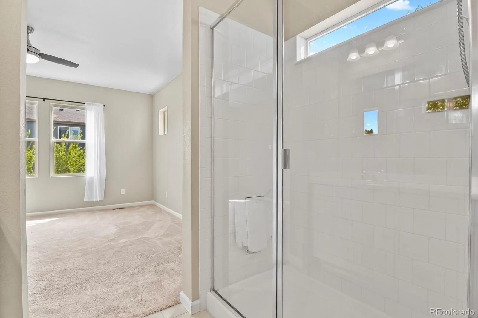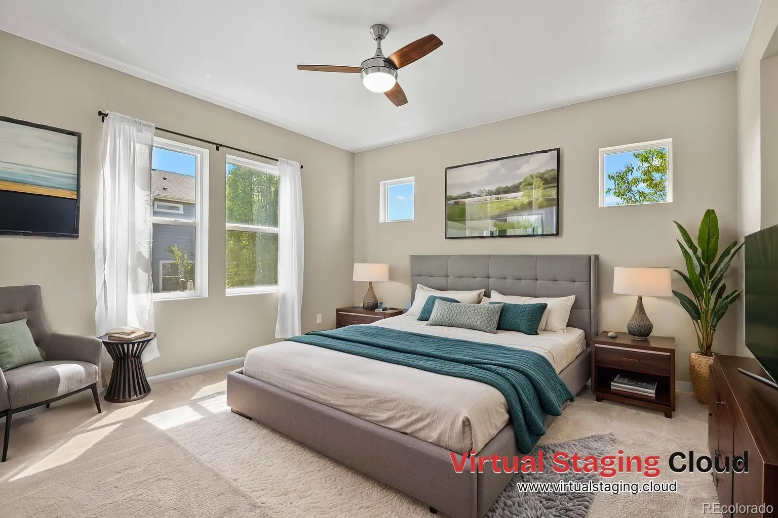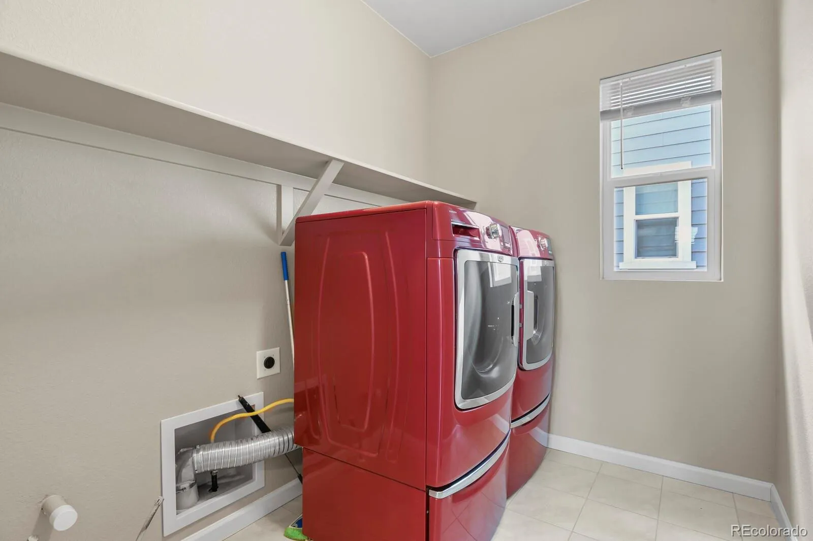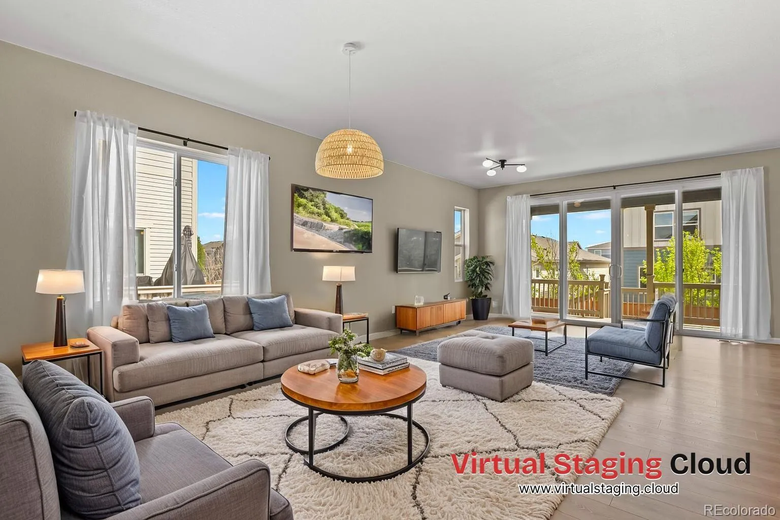 Warm, sunny, and filled with natural light, this beautifully designed open-concept ranch offers comfortable main-level living with thoughtful upgrades throughout. Featuring 9-foot ceilings and expansive windows, the home is highlighted by a stunning 12-foot sliding glass door that opens to a spacious covered deck—perfect for relaxing or entertaining. The kitchen is both stylish and highly functional, offering slab granite countertops, abundant counter space, ample cabinetry for storage, and a corner pantry. Stainless appliances and gas range complete the space, making it ideal for everyday living and hosting. A coffered ceiling welcomes you at the foyer, adding an elegant touch upon entry. The flexible floor plan includes a generous office with French doors, ideal for working from home. The primary suite features a walk-in shower and double vanity for added comfort and convenience. The laundry room is pre-plumbed for a utility sink, and a front-loading washer and dryer are included, along with a mounted TV in the living room. Additional highlights include an extended 2-car garage with a 4-foot extension, spacious covered private deck, and lush new landscaping. Enjoy the nearby community park and playground, along with easy access to I-25,making commuting and daily errands a breeze. This home truly combines style, function, and location!