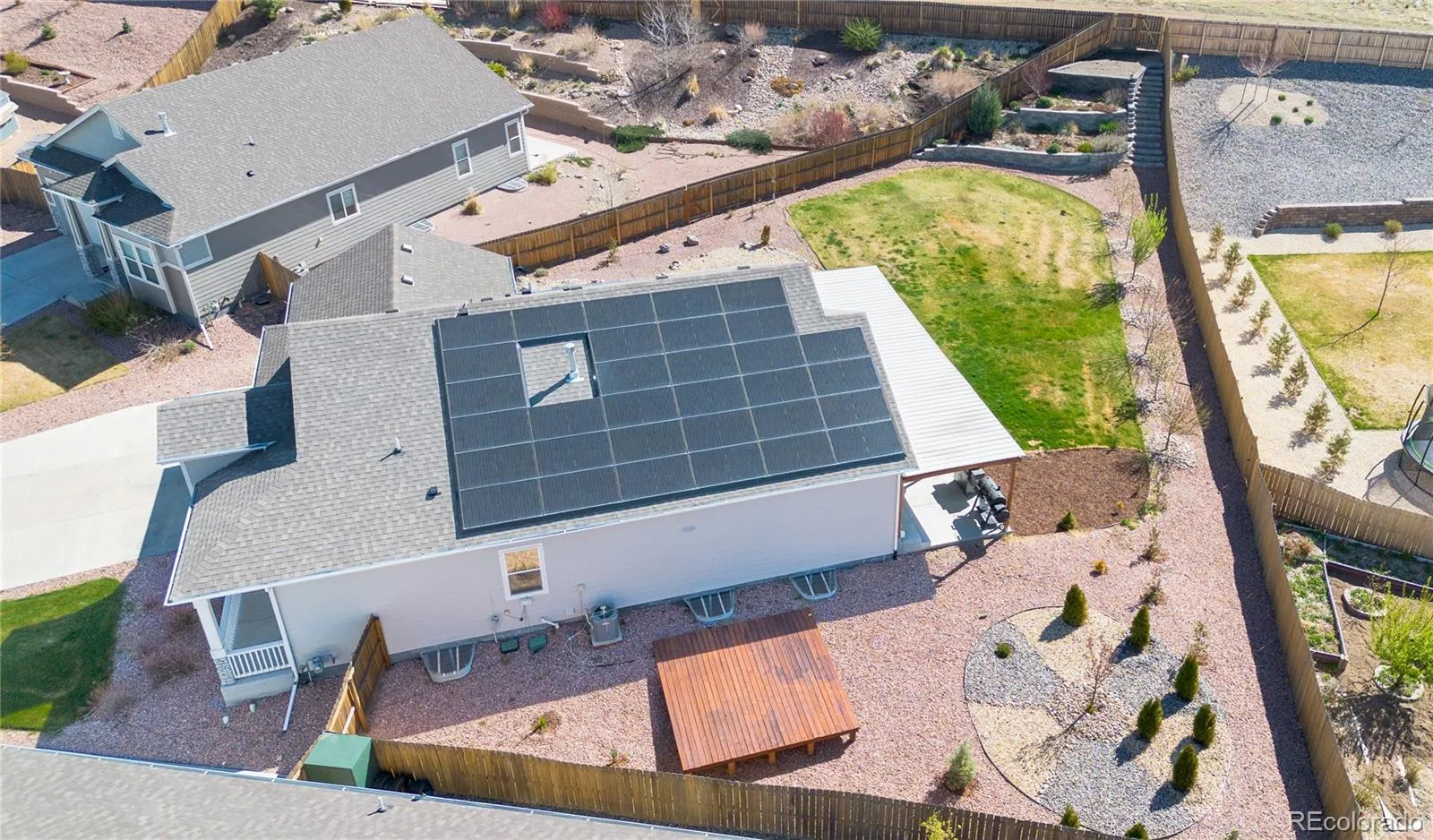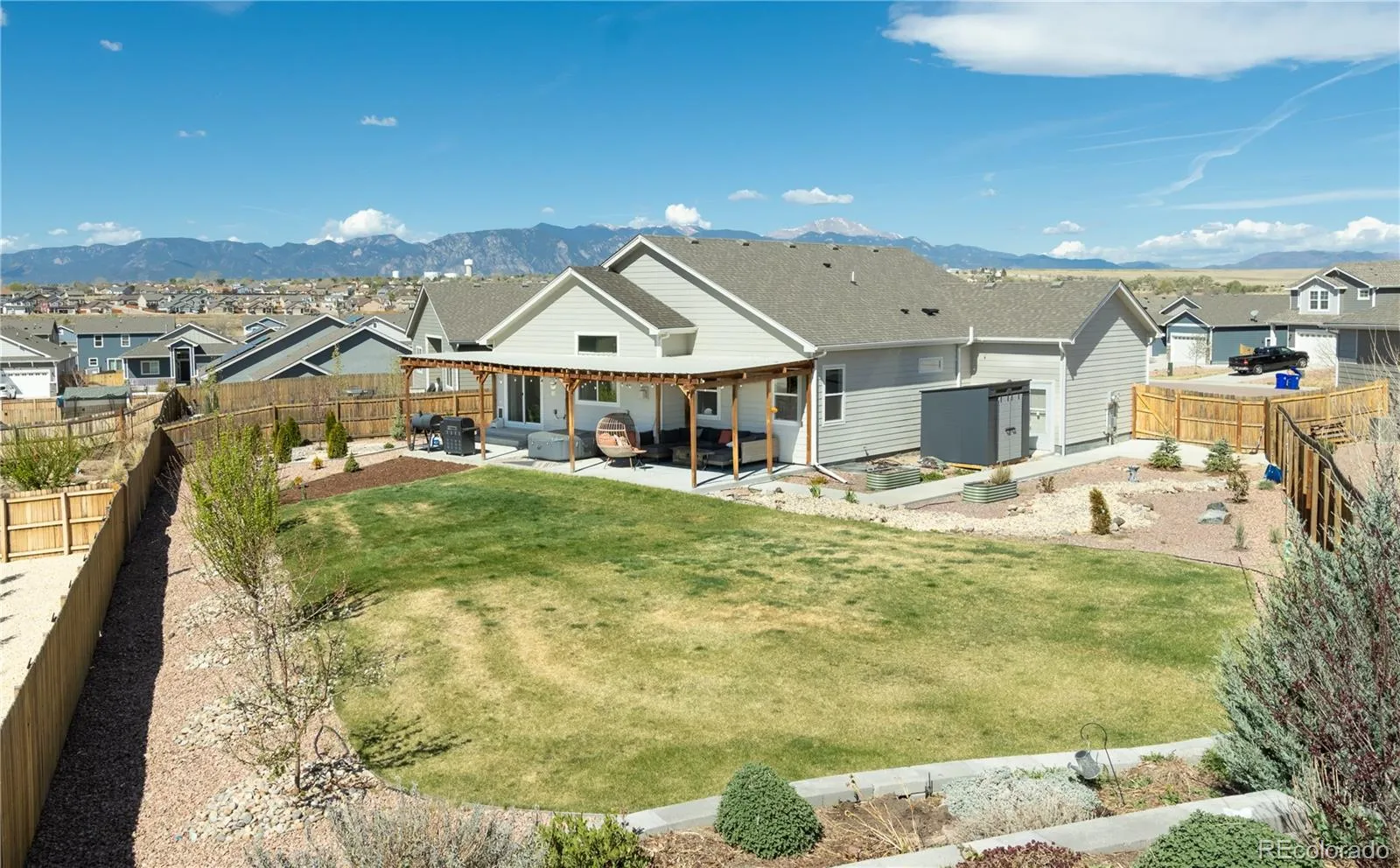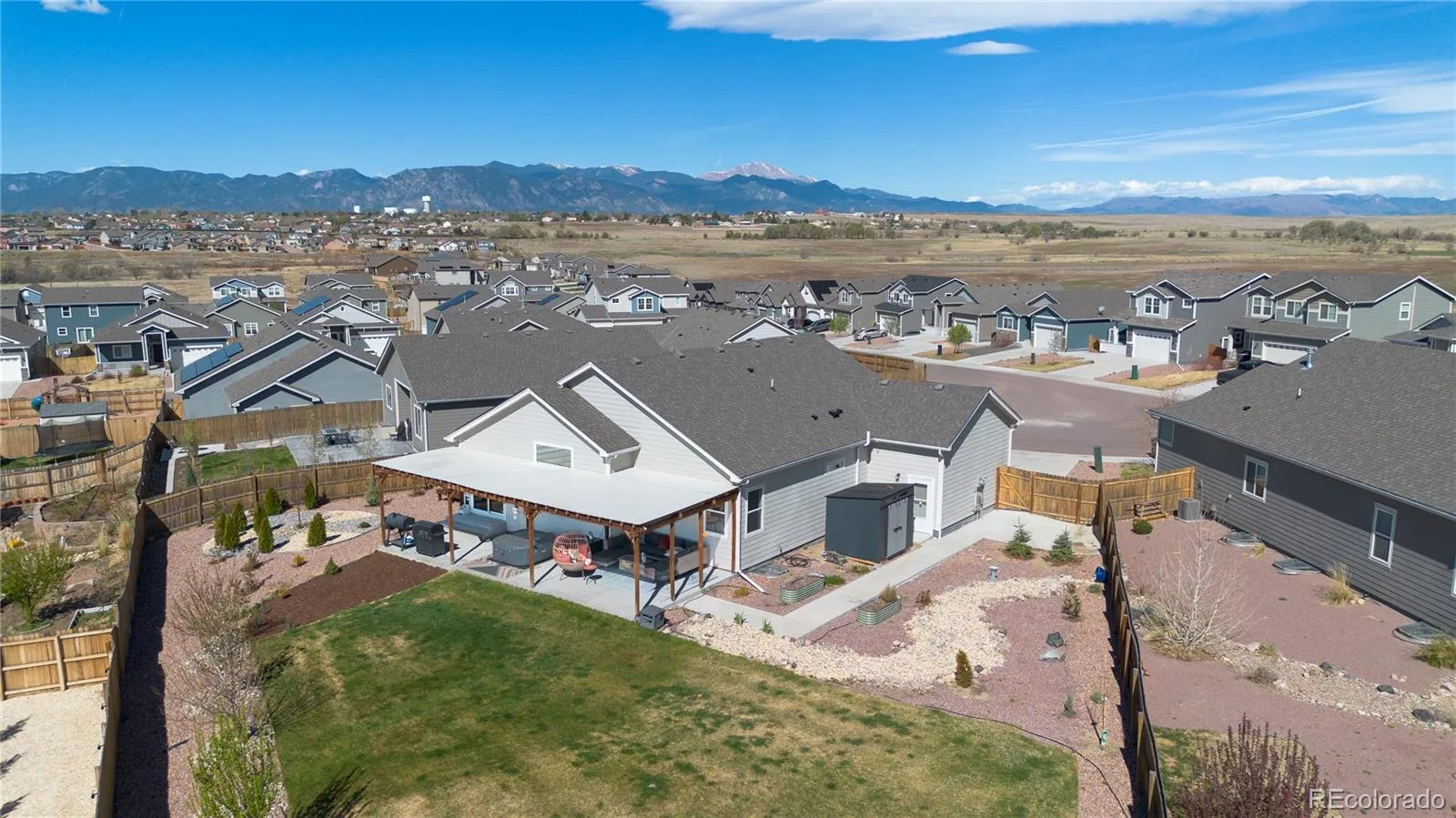Please Enter a Description: Welcome to this beautifully upgraded 2021-built ranch-style home offering 5 bedrooms, 3 bathrooms, and 3,200 finished sq ft on a 0.32-acre lot backing to open space. The bright open-concept layout is filled with natural light and features a chef’s kitchen with a large island, gas cooktop, stainless steel appliances, and elegant quartz countertops. A fully finished basement, vaulted ceilings, and a cozy fireplace add to the home’s comfort and functionality. This home stands out with extensive energy and infrastructure upgrades, including a 12.8 kW solar system producing approximately 17.1 MWh annually; well above typical household usage in Colorado Springs, paired with a Powerwall (13.5 kWh). Excess energy may be exported back to the utility at lower rates (approx. 0.04/kWh), creating a year end rebate for the homeowner. Additional features include an EV charger, extra 220V garage outlet, and a 220V hot tub-ready connection. Enjoy a complete smart home setup with Nest (doorbell, lock, cameras, thermostat) and Z-Wave lighting and sensors. Comfort upgrades include an Aprilaire 800 steam humidifier, water softener, and reverse osmosis system. The backyard is designed for both relaxation and functionality with custom landscaping, raised garden beds, established multi-variety fruit trees, and a modern 8×7 storage shed (6 months old). Located near parks, trails, and shopping.