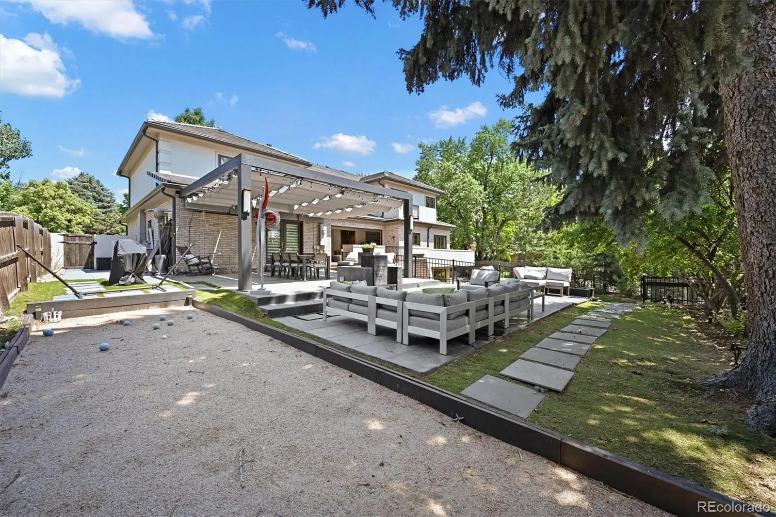 4181 S Ivy Lane offers over 7,500 square feet of luxury living on a beautifully landscaped corner lot in the heart of Cherry Hills Village. With 6 bedrooms, 6 bathrooms, soaring 20-foot ceilings, and a fully retractable NanaWall, the home is designed for seamless indoor-outdoor living and unforgettable entertaining. Step outside to a backyard oasis featuring a Fiberon wraparound terrace, pergola with retractable canopy, tranquil water feature, Bocce court, and multiple dining and lounge areas. It’s perfect for hosting or relaxing under the stars. Inside, the renovated chef’s kitchen includes Sub-Zero appliances, custom cabinetry, walk-in pantry, and an oversized island. The open-concept floor plan offers both formal and informal gathering spaces, including a sun-filled great room with a fireplace and wide hallways. The upstairs primary suite is a peaceful retreat with mountain views, a spa-inspired bathroom, dual walk-in closets, fireplace, and a private bonus room ideal for an office, nursery, or reading nook. A walkout basement adds incredible functionality with a home theater, fitness studio, temperature-controlled wine cellar, private guest suite, and ample storage. It’s ideal for multigenerational living or weekend guests. All this, just minutes from the Denver Tech Center, top-rated country clubs, trail systems, private schools and within the award-winning Cherry Creek School District.