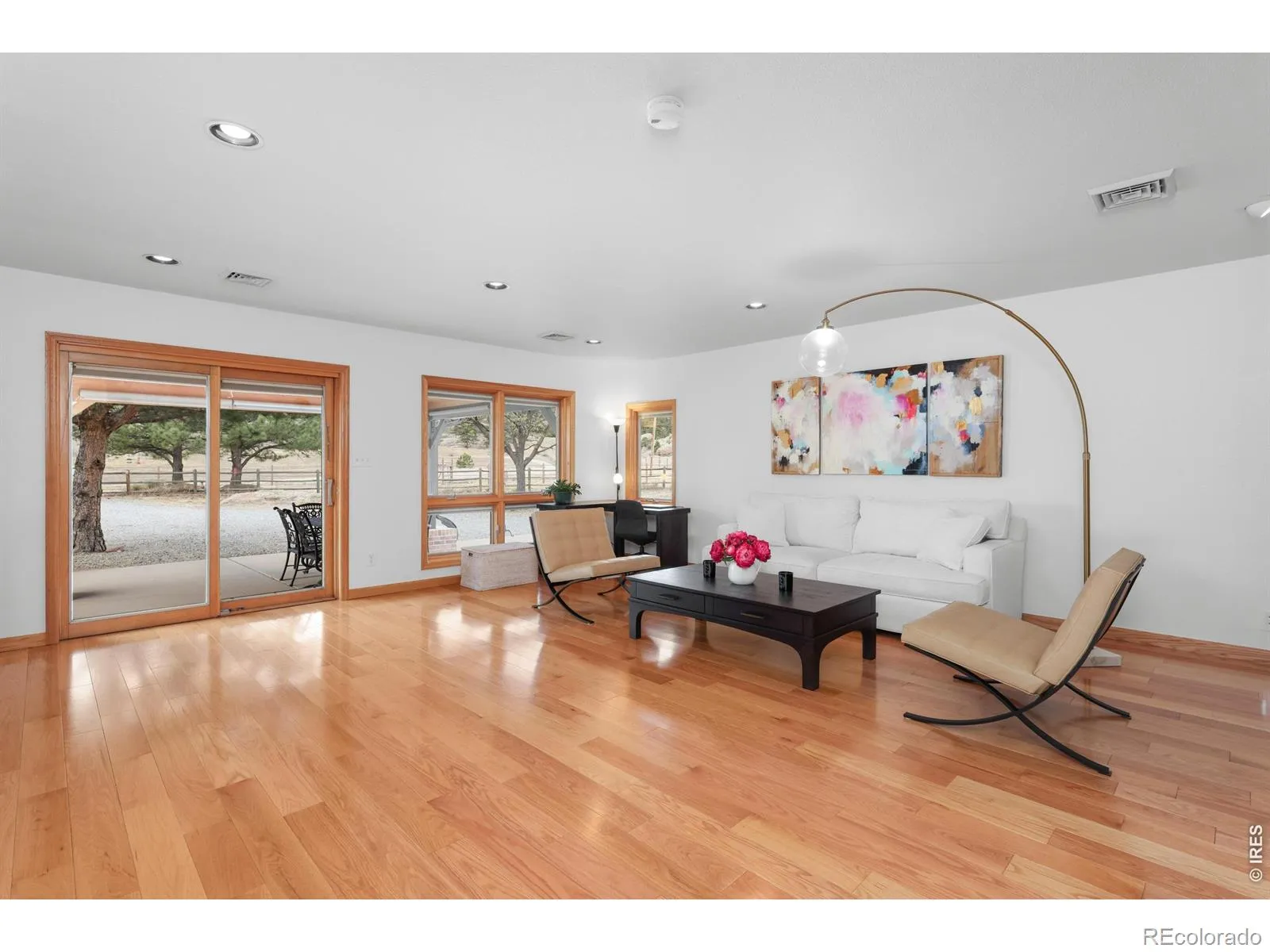 Minutes from downtown Lyons, in the heart of the desirable Spring Gulch neighborhood, sits one of the valley’s most coveted parcels: nearly 10 flat acres, fenced and gated, equipped for horses or livestock, with a 3,000 SF single-level ranch that has been beautifully maintained. Properties like this one do not come available often.The house has three spacious bedrooms, three baths, a formal living room, and a separate family room anchored by a rock fireplace. The kitchen, dining, and living areas open to each other and to the large deck beyond. Refinished wood floors run through the main living areas and skylights pull light deep into the home. The kitchen has granite counters, stainless appliances, a large SubZero refrigerator, and a dining nook built for long meals. Windows throughout frame the pastoral setting at every turn. The primary suite is private and generous, with a walk-in closet and French doors opening to a south-facing balcony. The guest bedrooms are spacious. The east-facing sunroom fills with morning light and is the kind of room you will use every day. Freshly painted and carefully maintained, this is a property someone has genuinely loved. An additional 600 SF of storage below grade rounds out the home. The barn has an additional 1-car garage, six stalls, a tack room, and additional storage space. The property also has a round pen and 3 loafing sheds. The large deck is built for Colorado summers. With Roosevelt National Forest bordering the neighborhood, the riding is essentially unlimited. Spring Gulch’s roads are private and well-maintained. Residents have long considered this valley a wildlife preserve. Huge herds of elk have been moving through here for years. The rock outcroppings glow in the afternoon light. Rainbows appear over the ridgeline with enough regularity that you stop being surprised by them. Downtown Lyons is less than 10 minutes away. Boulder and Longmont are only 30 minutes away. This place feels like its own world.