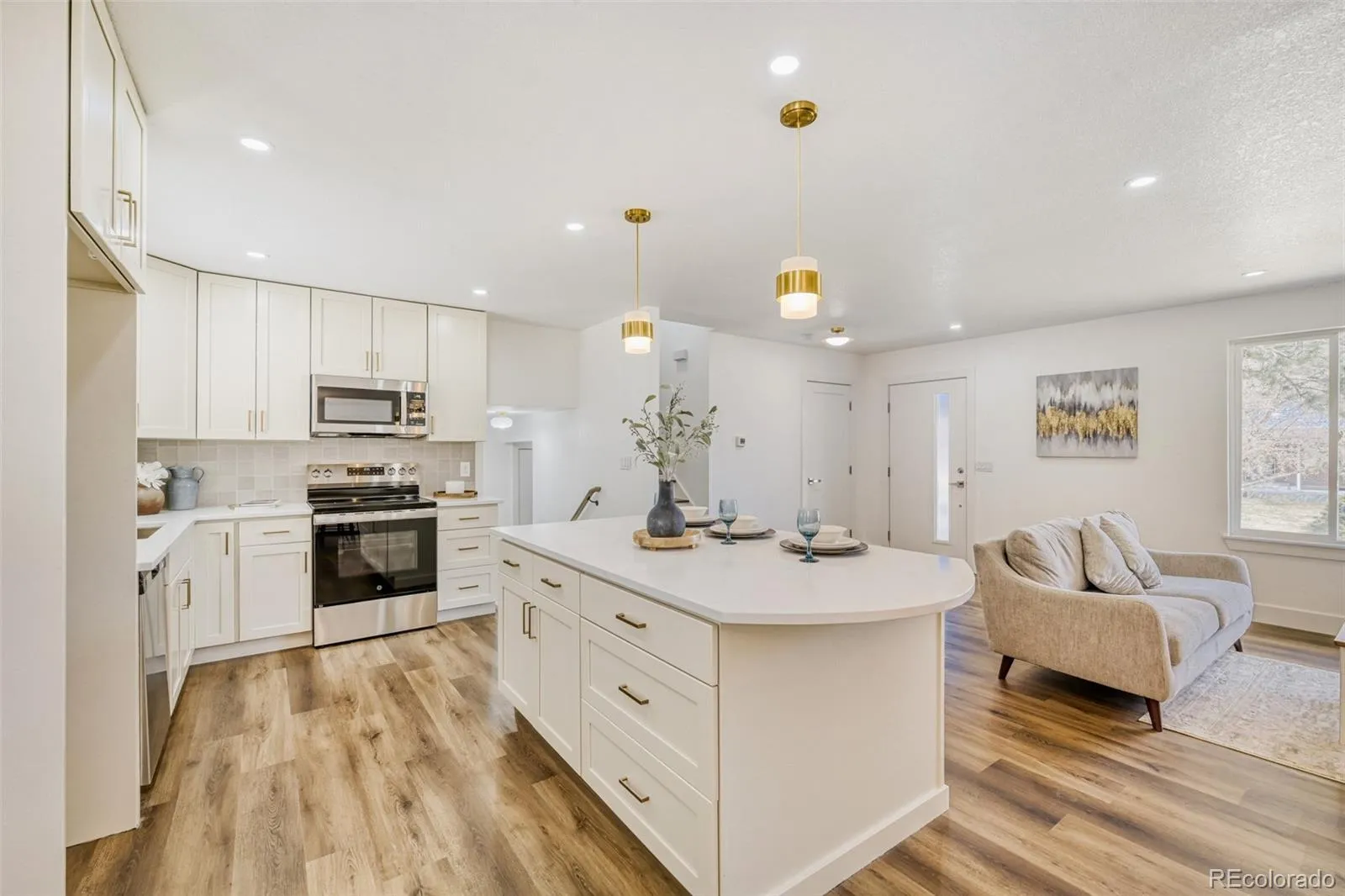 Welcome to this beautifully updated home in the heart of Arvada, just minutes from Lake Arbor, parks, trails, shopping, and dining. Located in one of Arvada’s most desirable areas with no HOA restrictions, this move in ready home features fresh, modern organic finishes and a bright open layout designed for comfortable living and entertaining. The brand new kitchen offers quartz countertops and a built in island, flowing into a warm and inviting living space with a custom built in entertainment center and electric fireplace. Thoughtful upgrades continue throughout with updated bathrooms, new flooring carpet/vinyl/tile, paint, trim, doors, and stylish interior and exterior lighting as well as a electrical panel upgrade. The exterior has been fully refreshed with new paint, a new roof, new concrete entry, back patio, front landscaping, a new fence, and added concrete parking ideal for RV or boat storage. The backyard is ready for your vision with an irrigation system already in place. Dishwasher, Stove, Microwave and Refrigerator included. (Refrigerator not pictured but will be delivered and installed before closing)