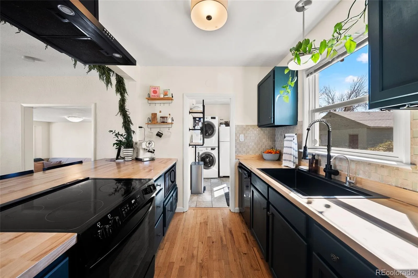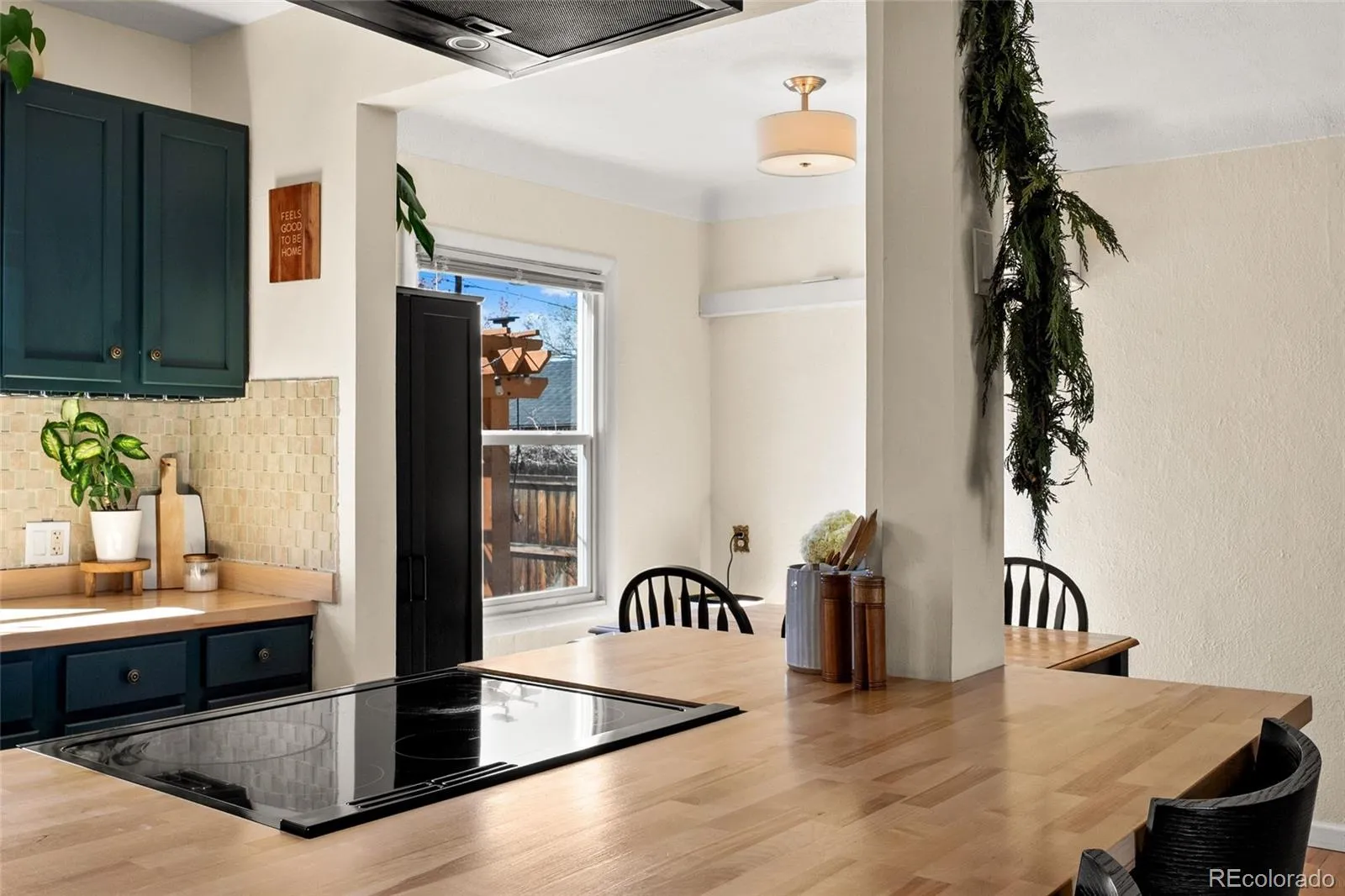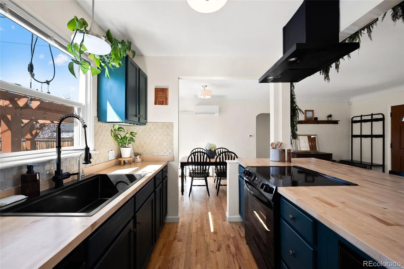 The open living room and kitchen layout offers easy flow for everyday living and entertaining. The fully renovated kitchen (2023) features butcher block countertops, a large farmhouse sink, and newer appliances. A bright bay window fills the space with natural light, while a custom TV lift cabinet adds a unique touch. The dining area connects seamlessly, creating a welcoming space to gather.